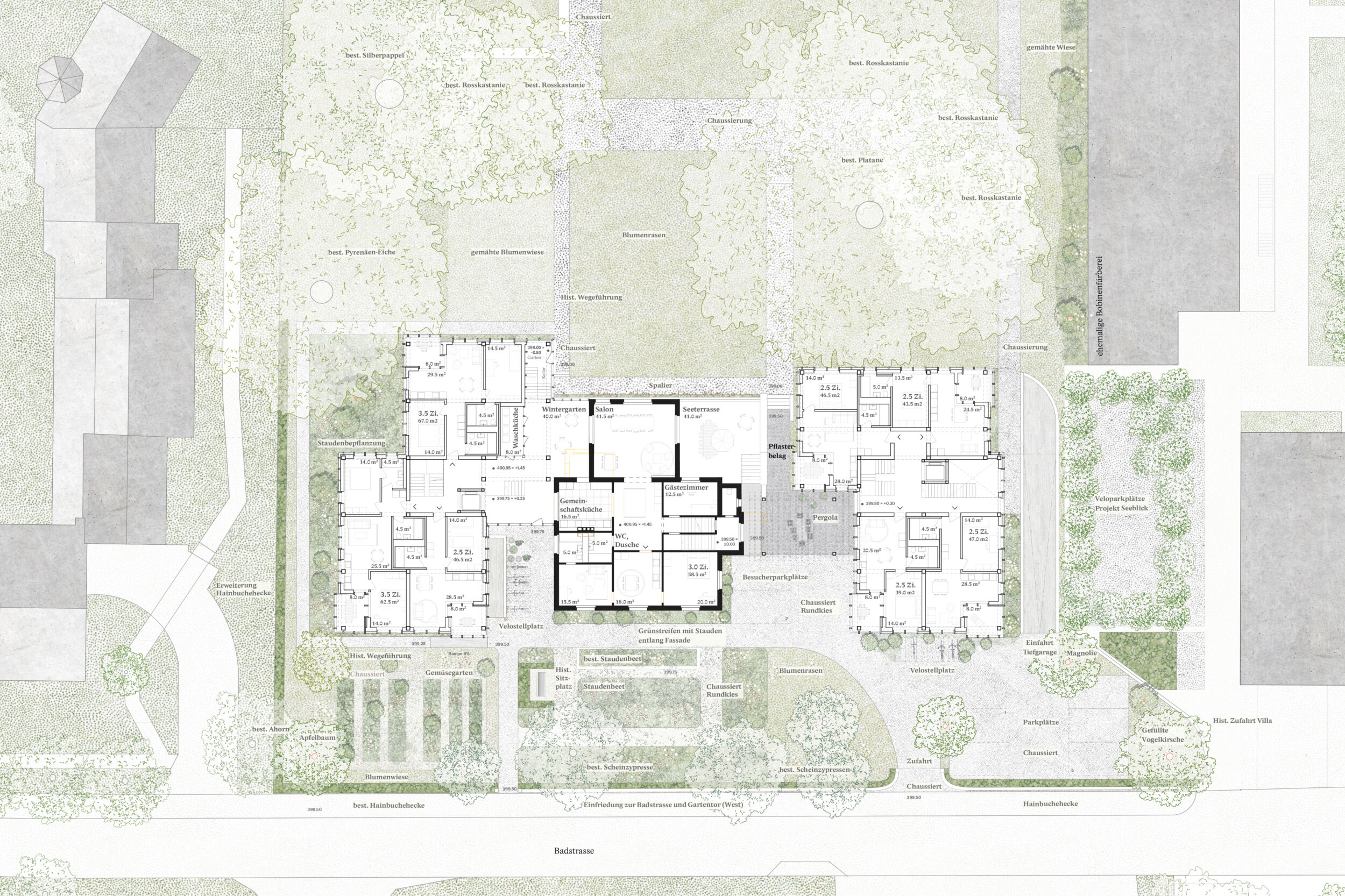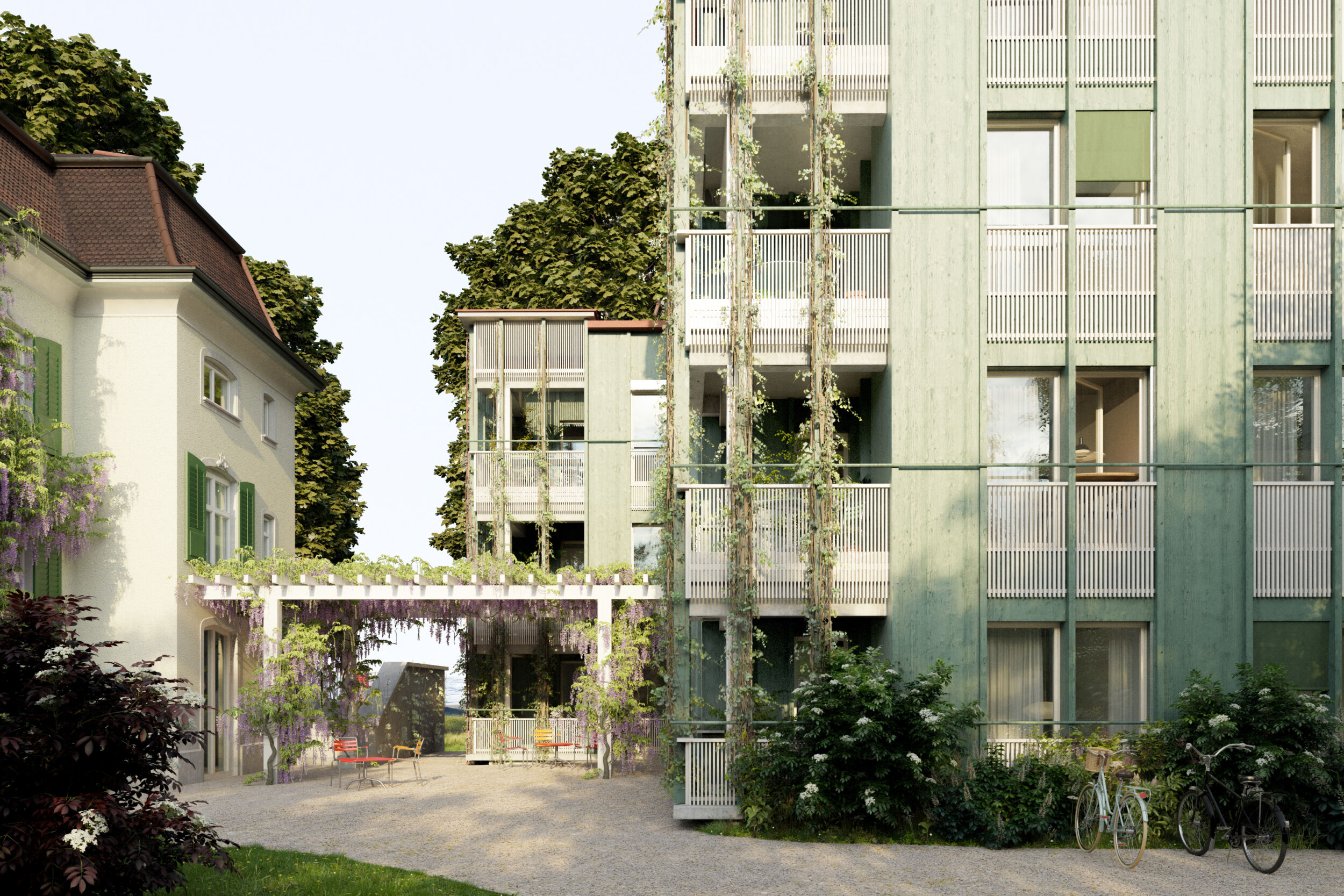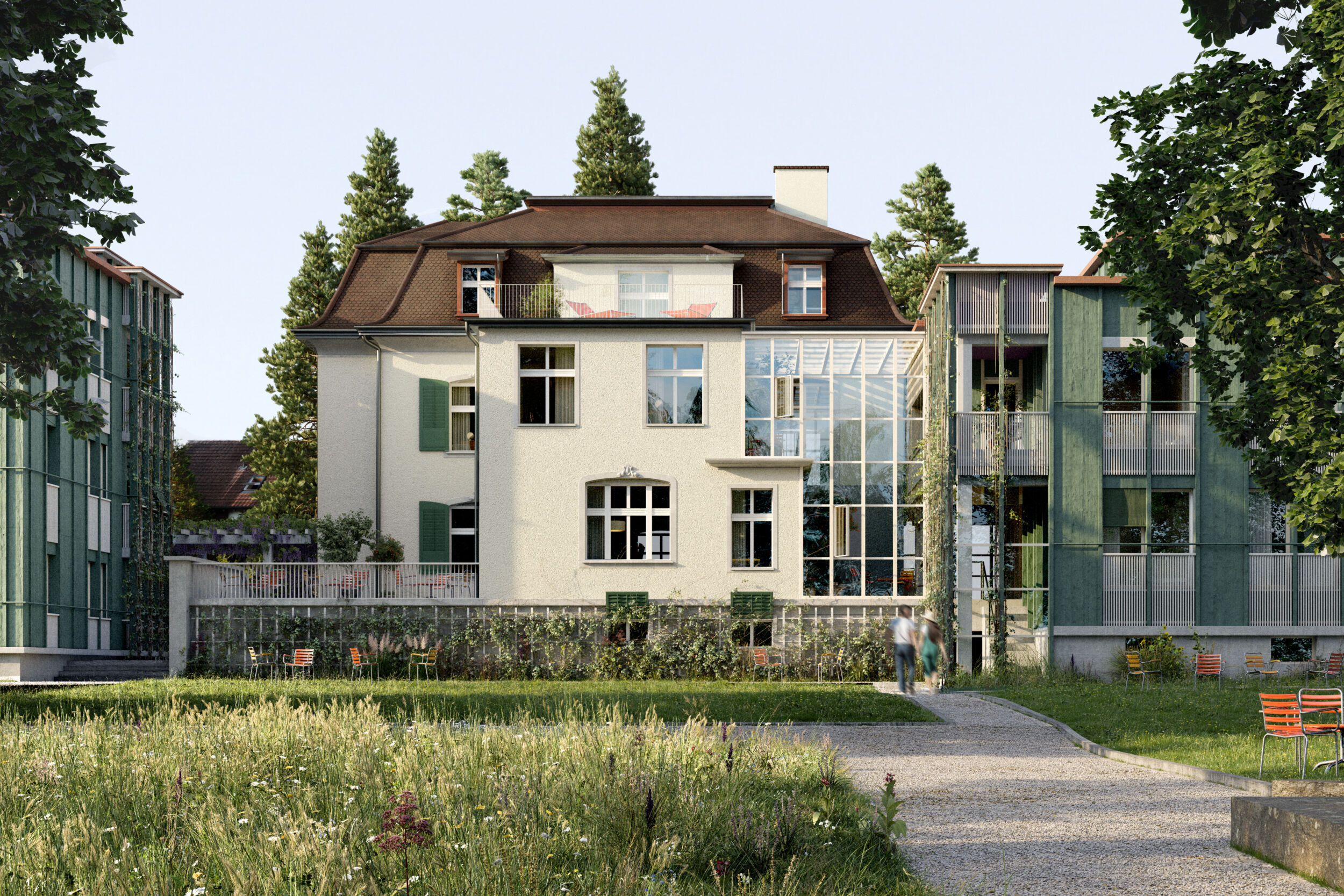 Die Edith Maryon AG will im Auftrag ihrer Stiftung mit einer ressourcenschonenden Bebauung das preisgünstige, gemeinschaftliche Wohnen im Alter fördern. Zwei Doppelhäuser bilden mit der Villa ein bauliches Ensemble, wobei der Westbau an die Villa anbaut.