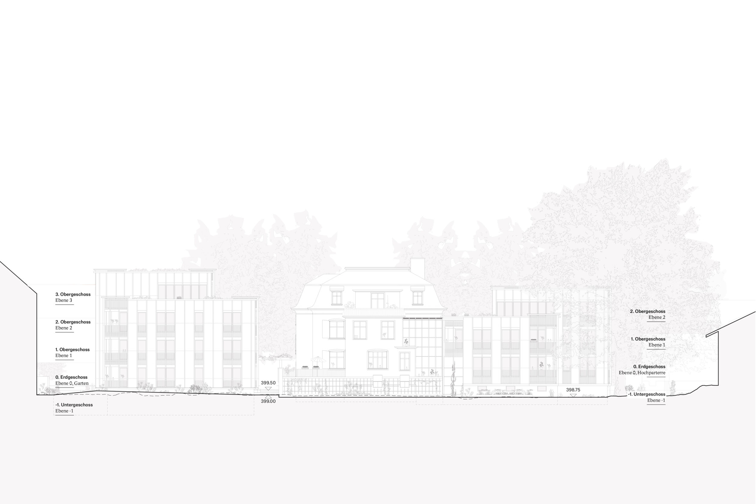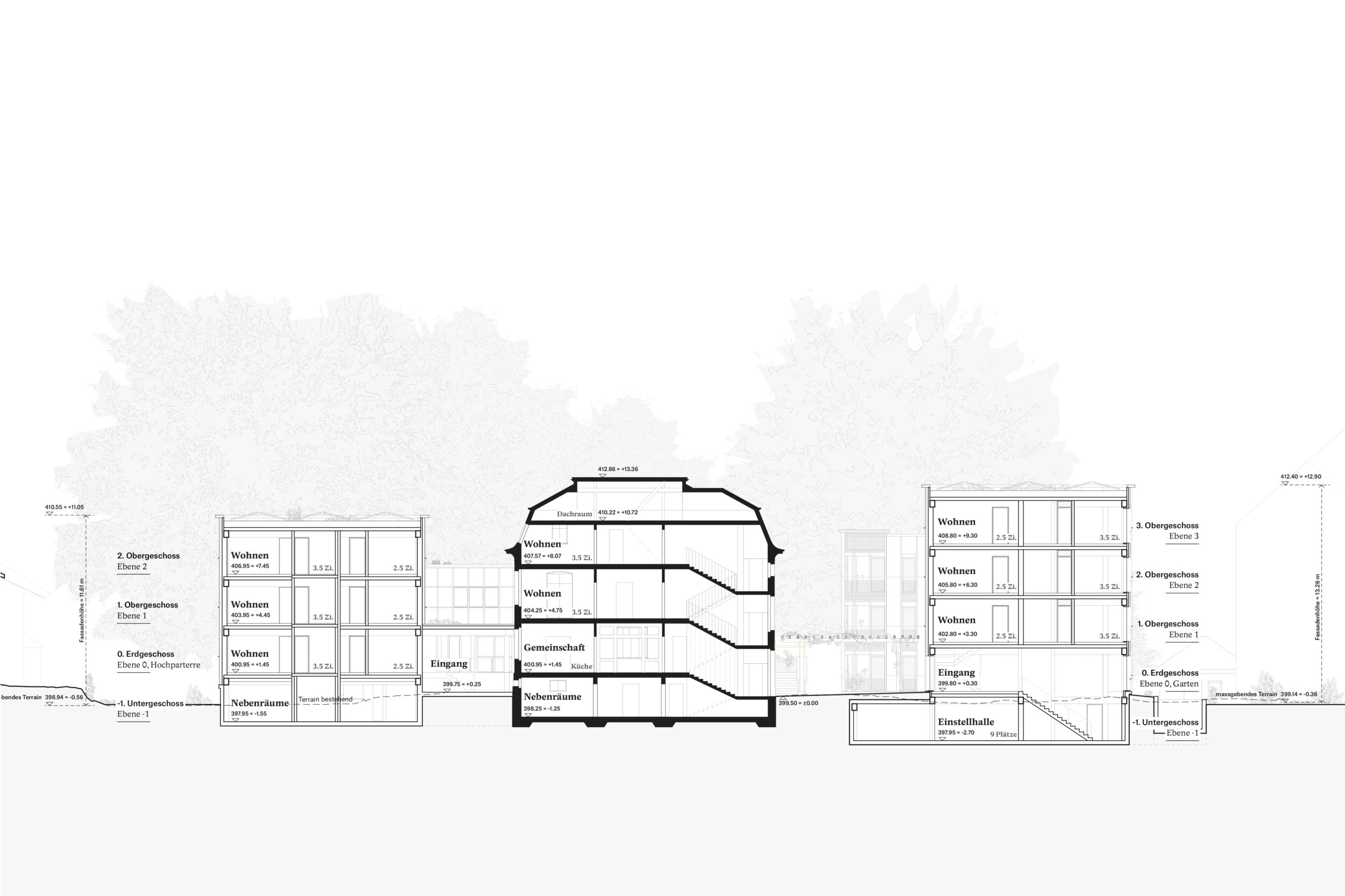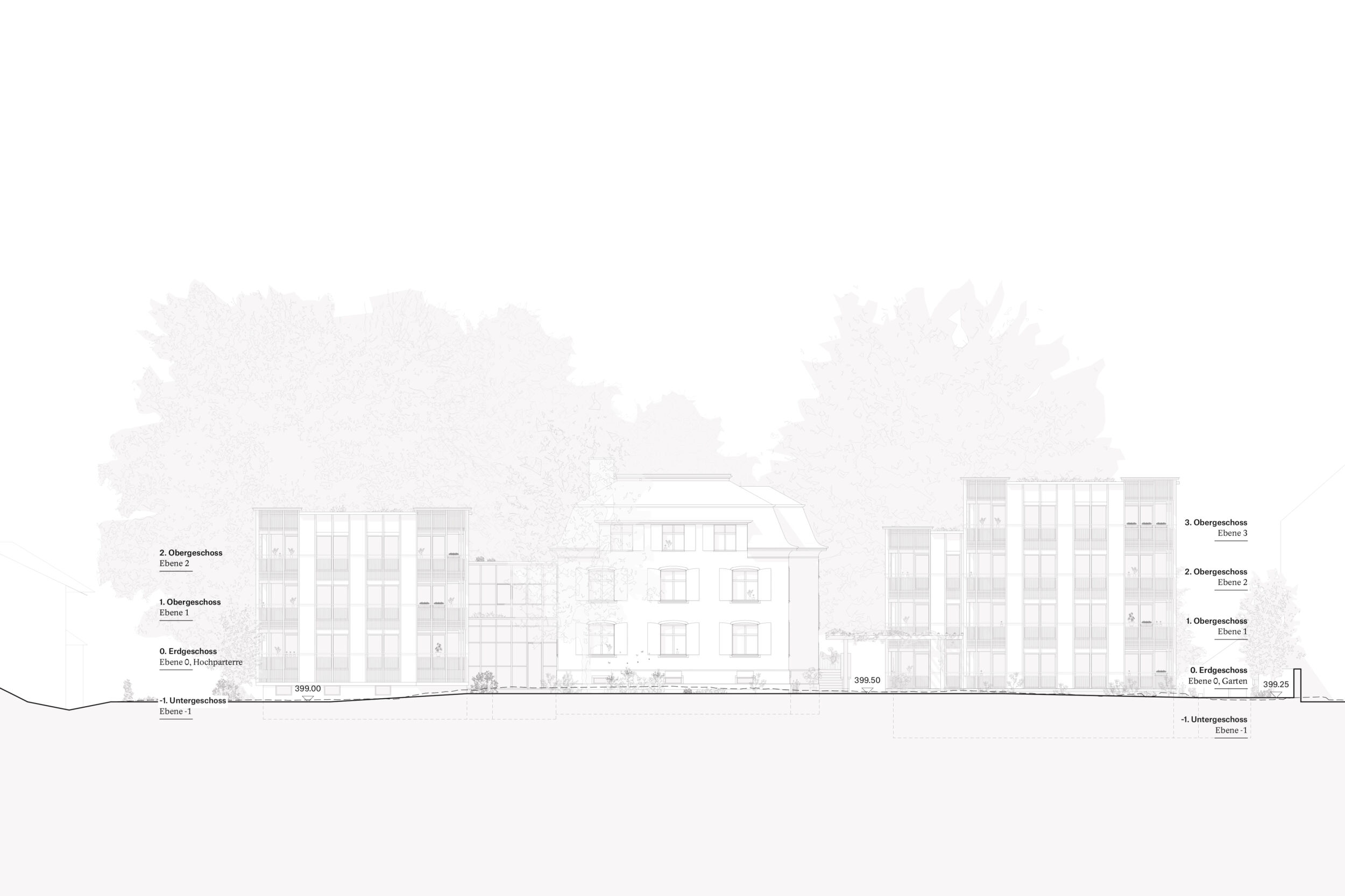 Die Edith Maryon AG will im Auftrag ihrer Stiftung mit einer ressourcenschonenden Bebauung das preisgünstige, gemeinschaftliche Wohnen im Alter fördern. Zwei Doppelhäuser bilden mit der Villa ein bauliches Ensemble, wobei der Westbau an die Villa anbaut.