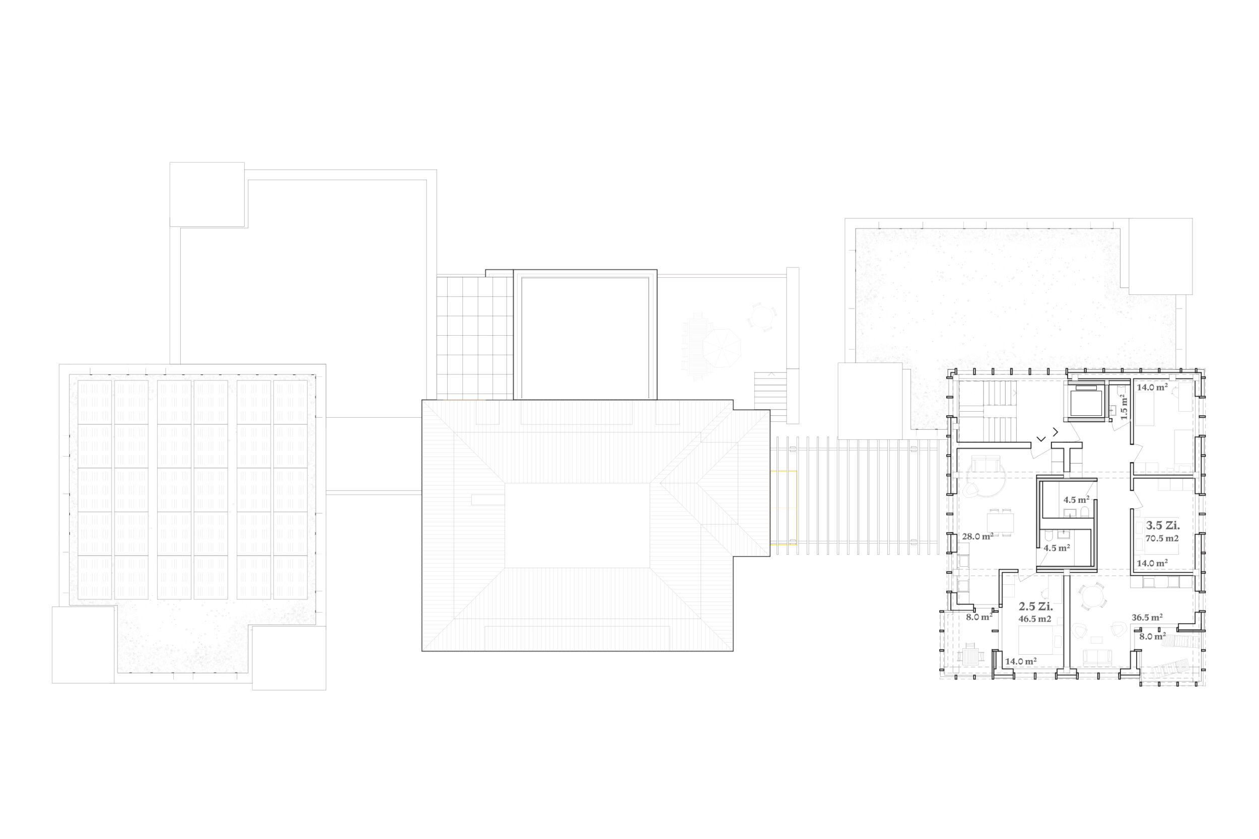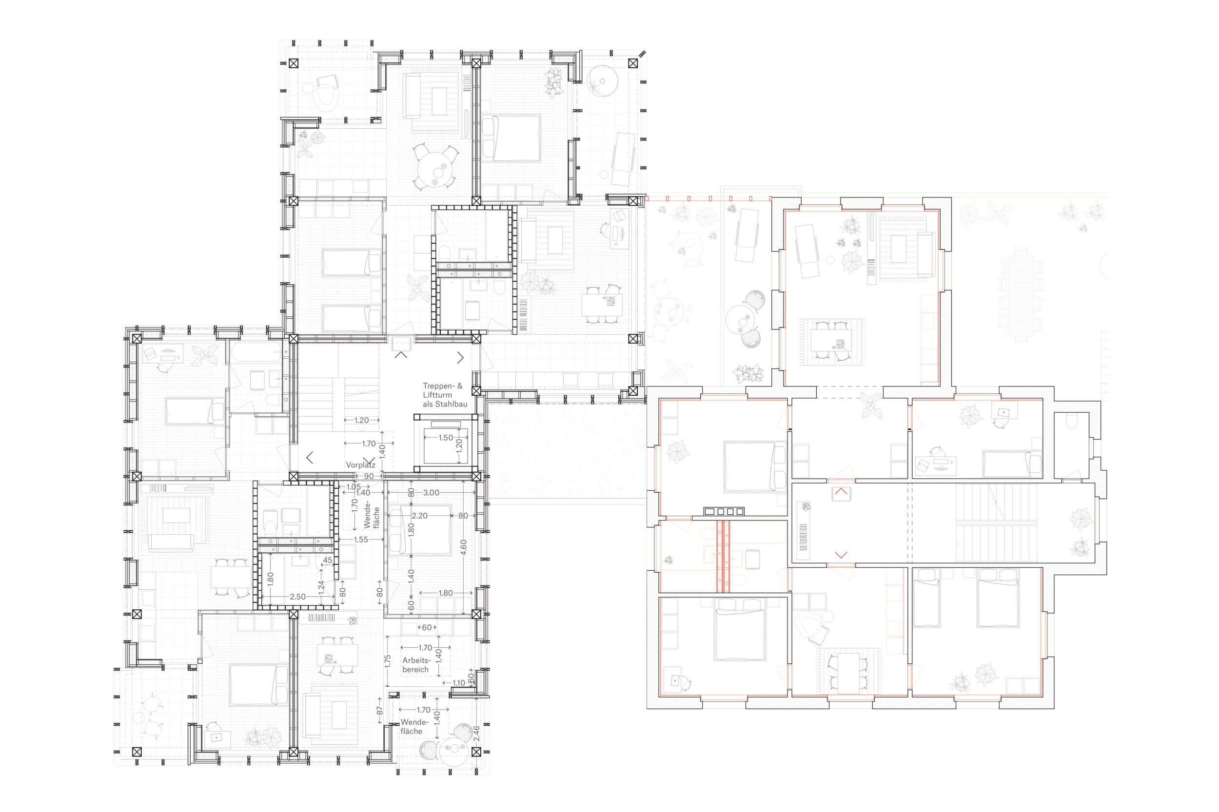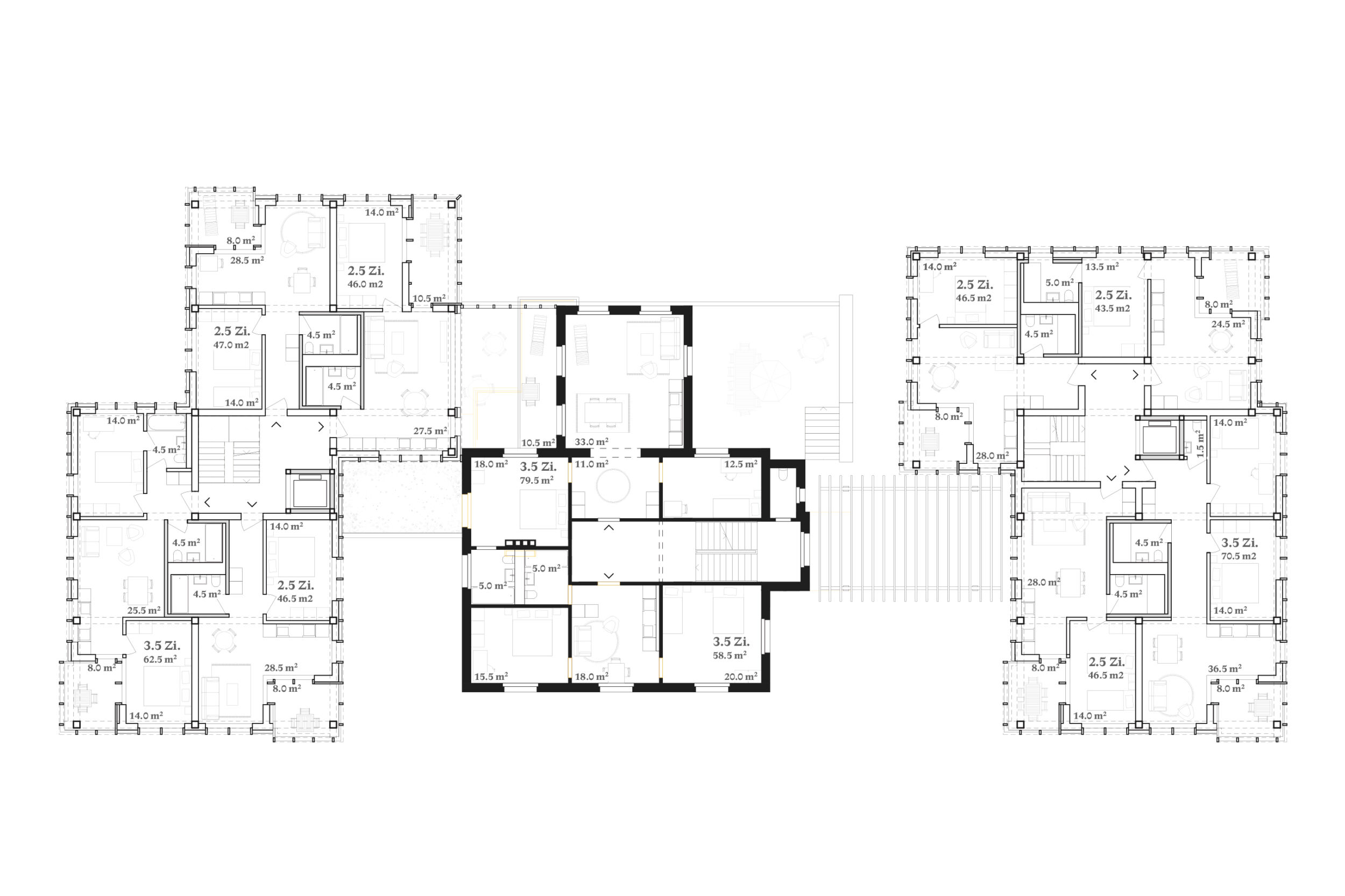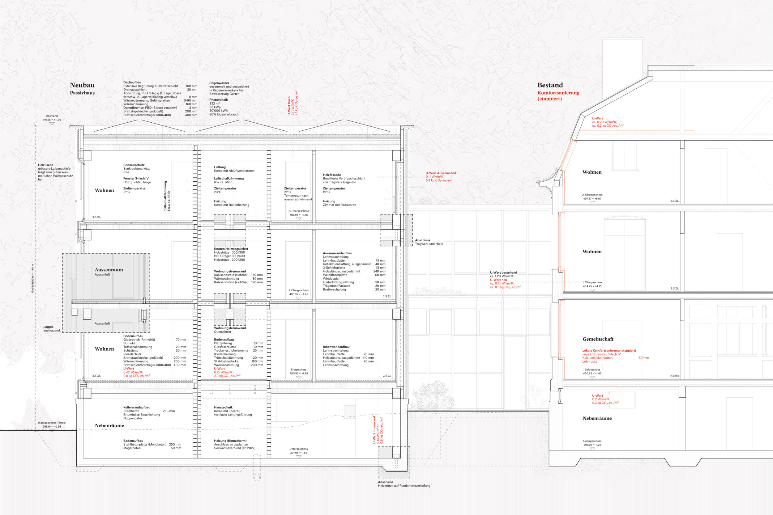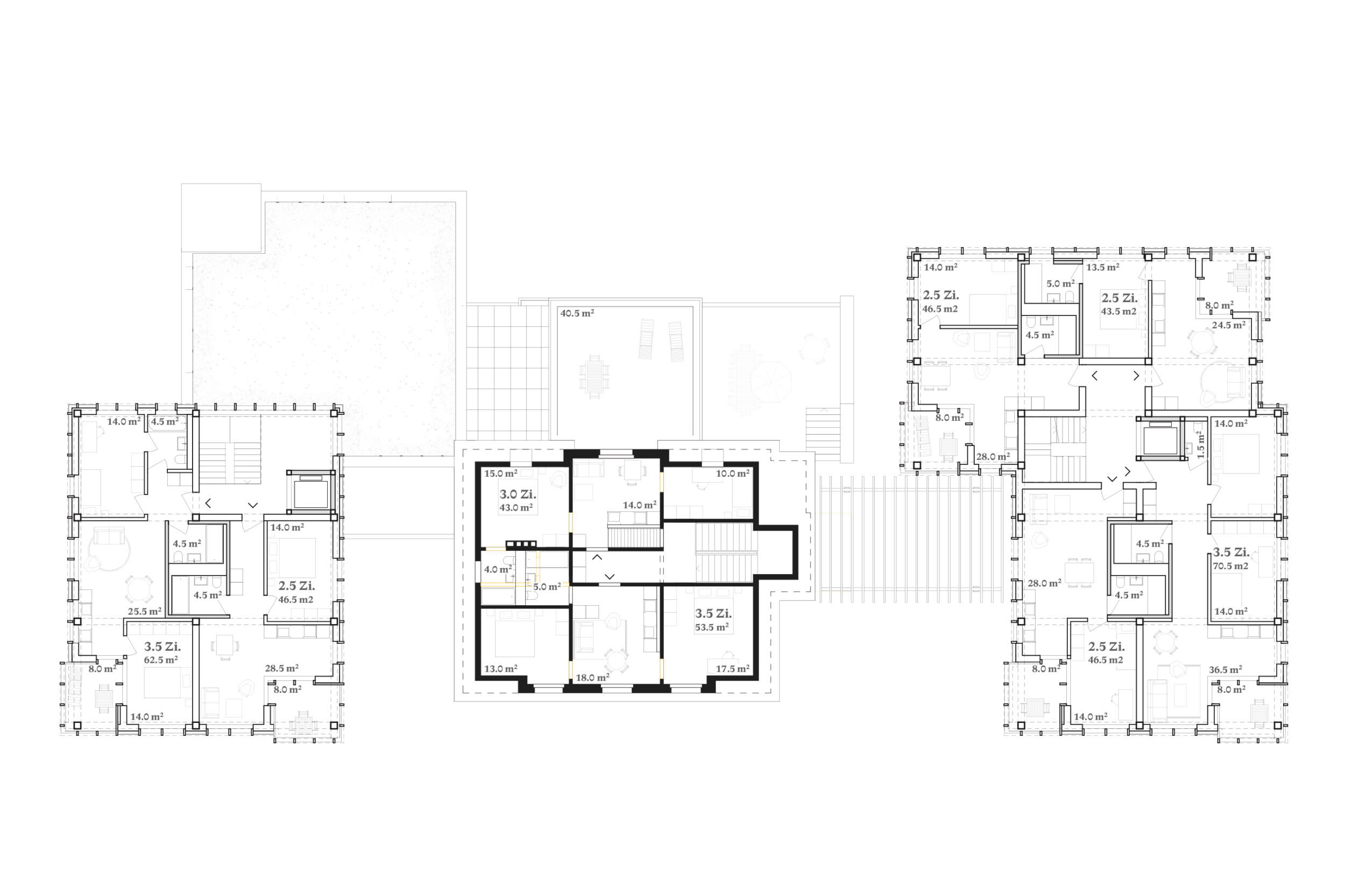 Die Primärstruktur der beiden neuen Gebäudekörper besteht aus einem Holzskelett, in welches die Badezimmerkerne und auch die Treppenhäuser als eigenständige Konstruktionen eingebaut werden. Um diese herum entwickeln sich Wohnungen mit eigenen Loggia-Türmchen, welche der effizienten Systembauweise eine romantische Leichtigkeit einschreiben.