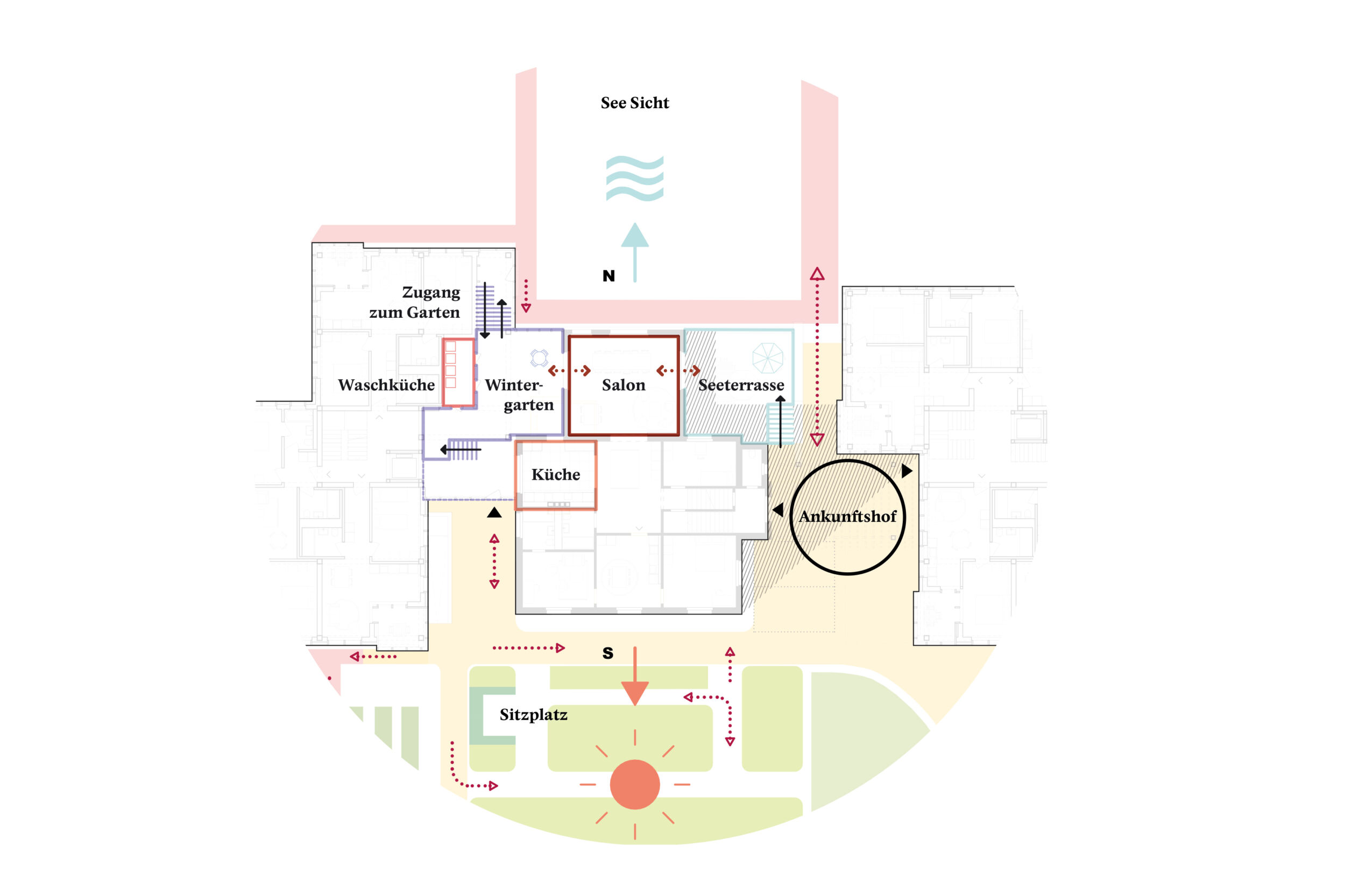 Das Projekt Ardilla ist eine sozialräumliche Struktur, die sich auf ressourcenschonende Weise um die Villa Eichhorn baut. Mit 28 auf Suffizienz zielenden Wohnungen wird für über 50 Menschen ein neues Zuhause geschaffen. Im Hochparterre wird dabei mit dem Wintergarten, dem Salon und der Aussenterrasse eine schöne Raumfolge von Gemeinschaftsräumen mit Seesicht aufgebaut.