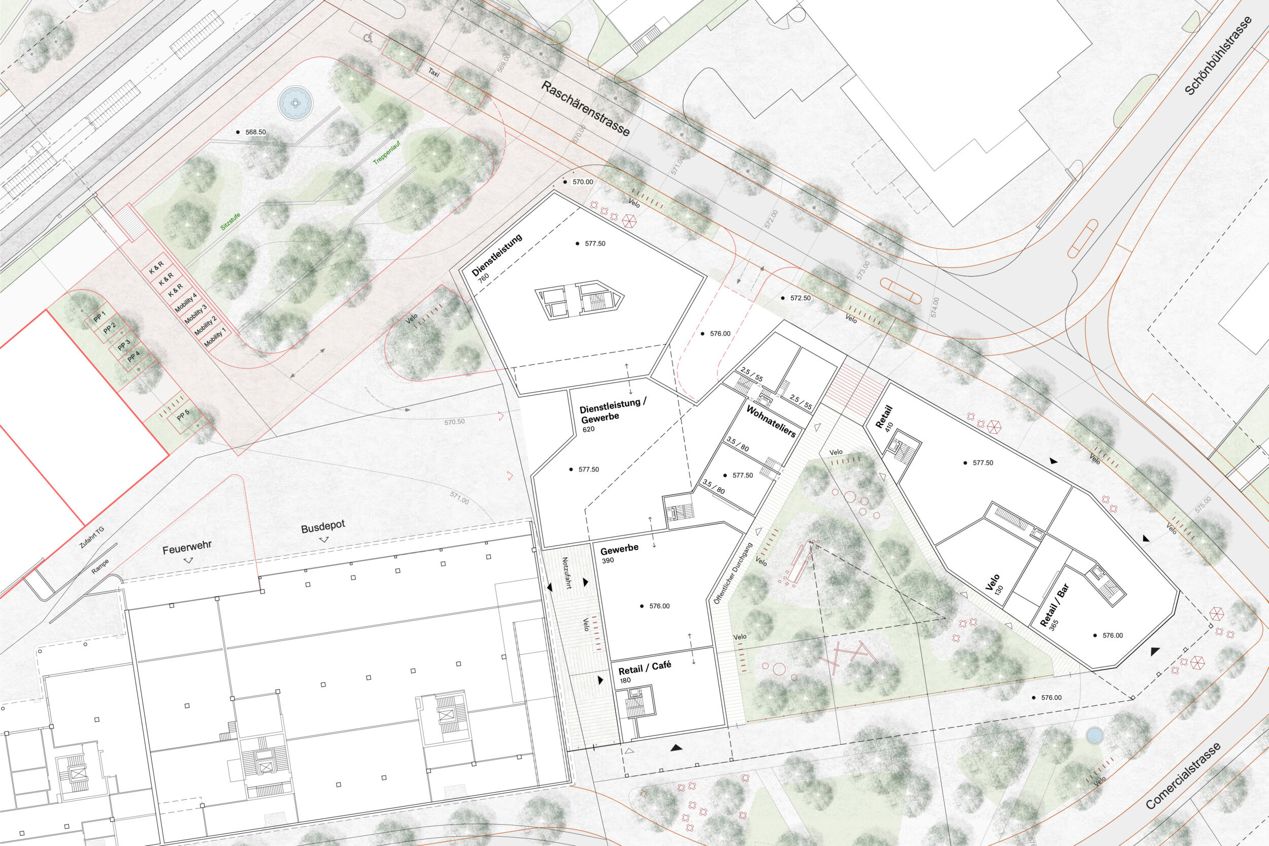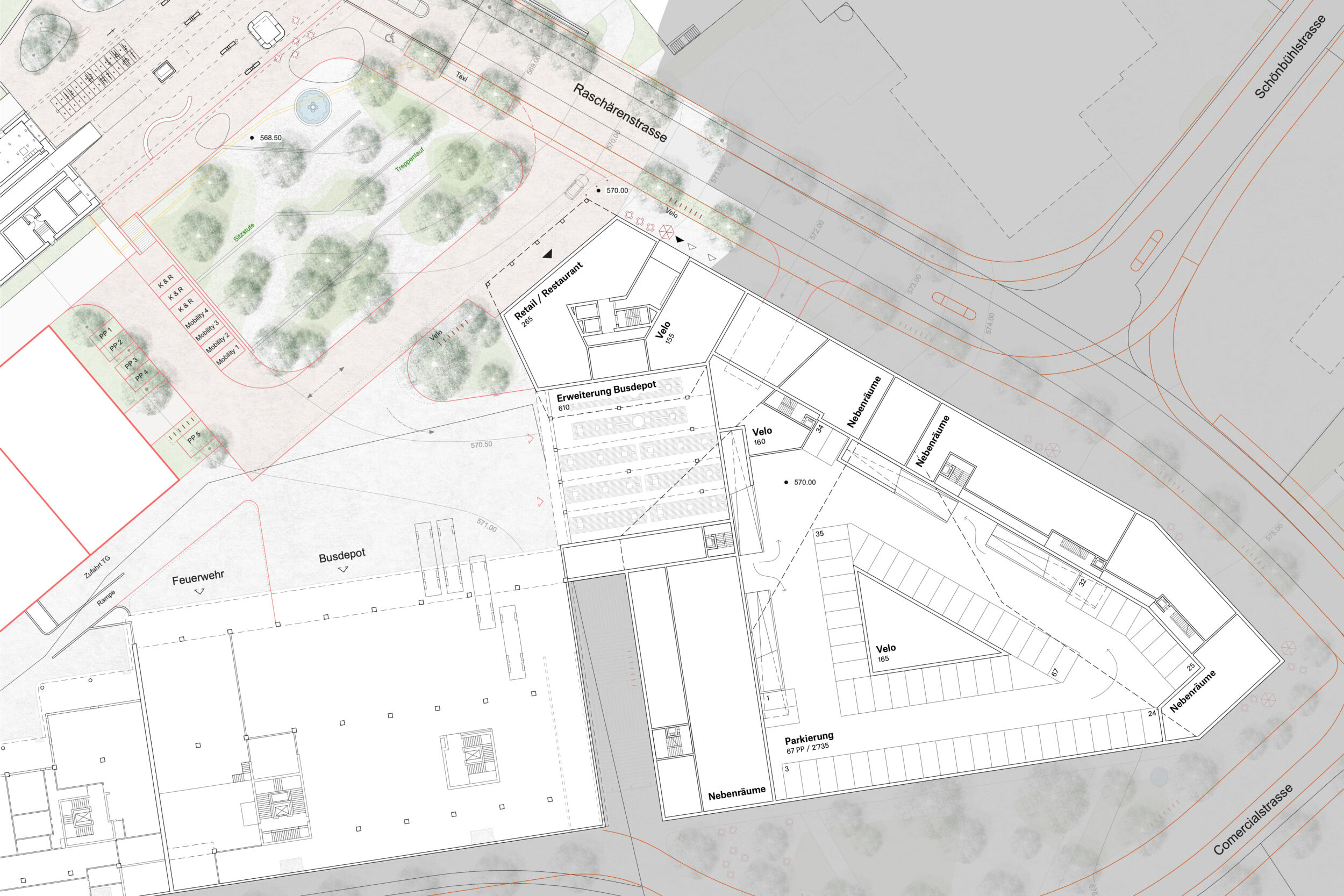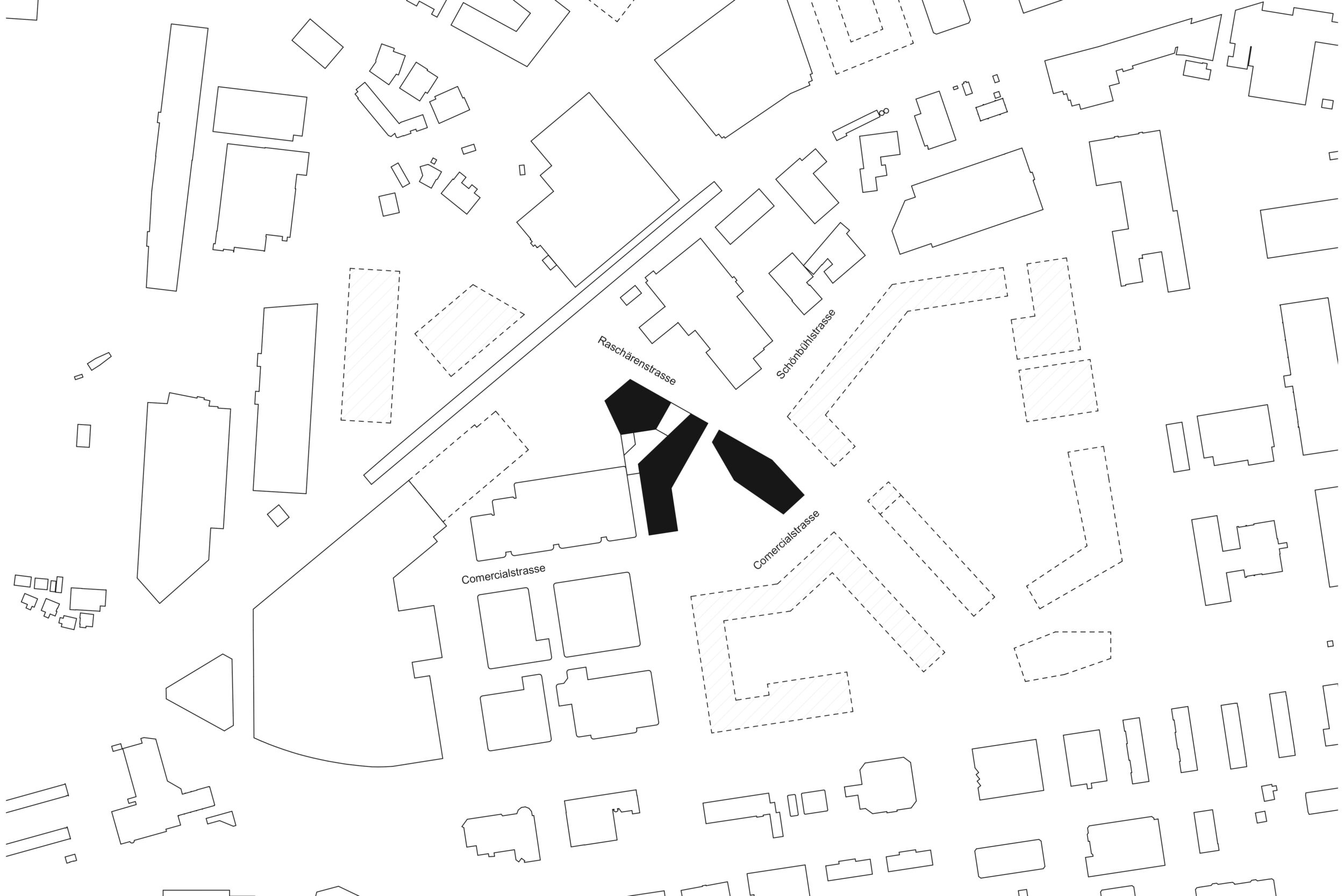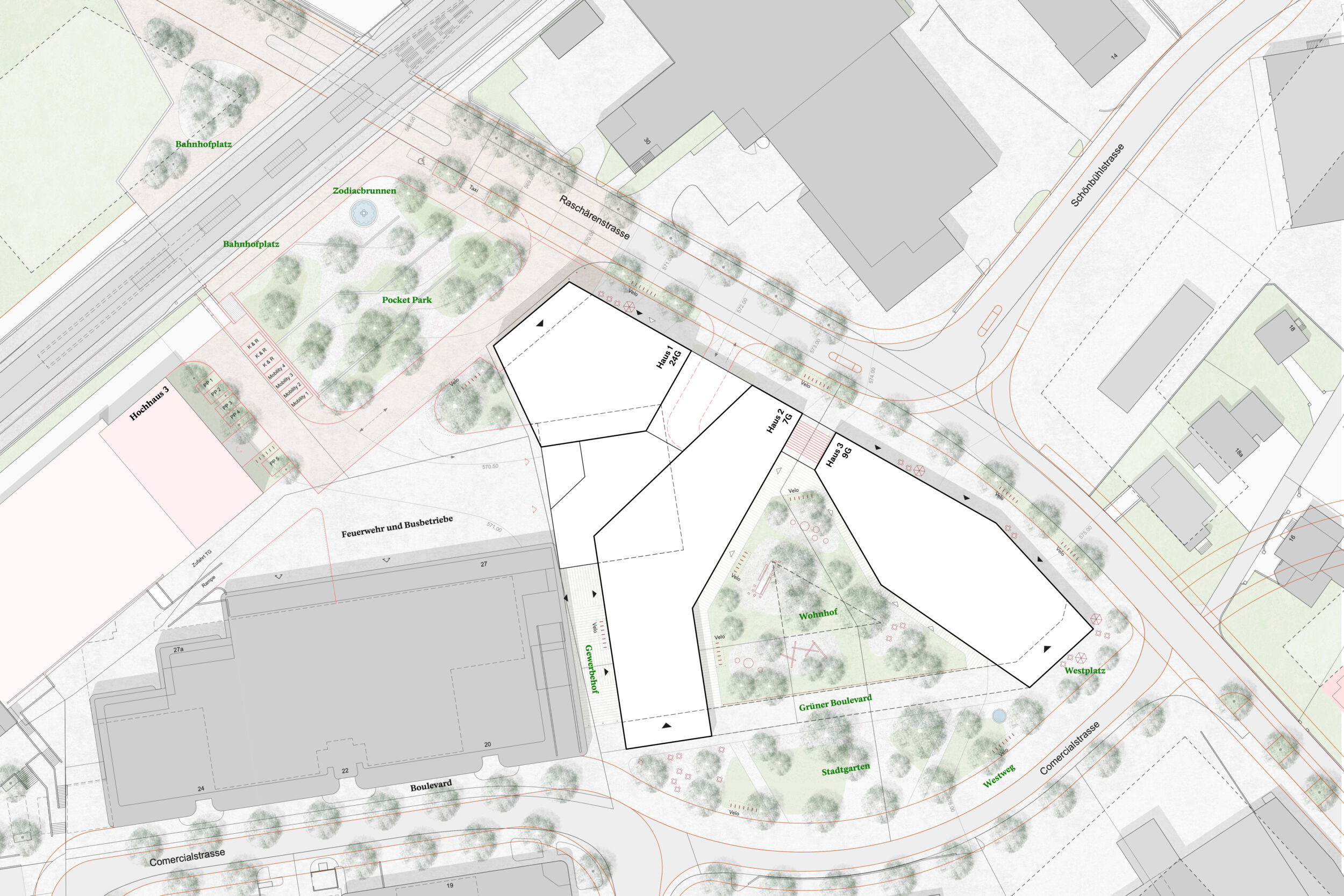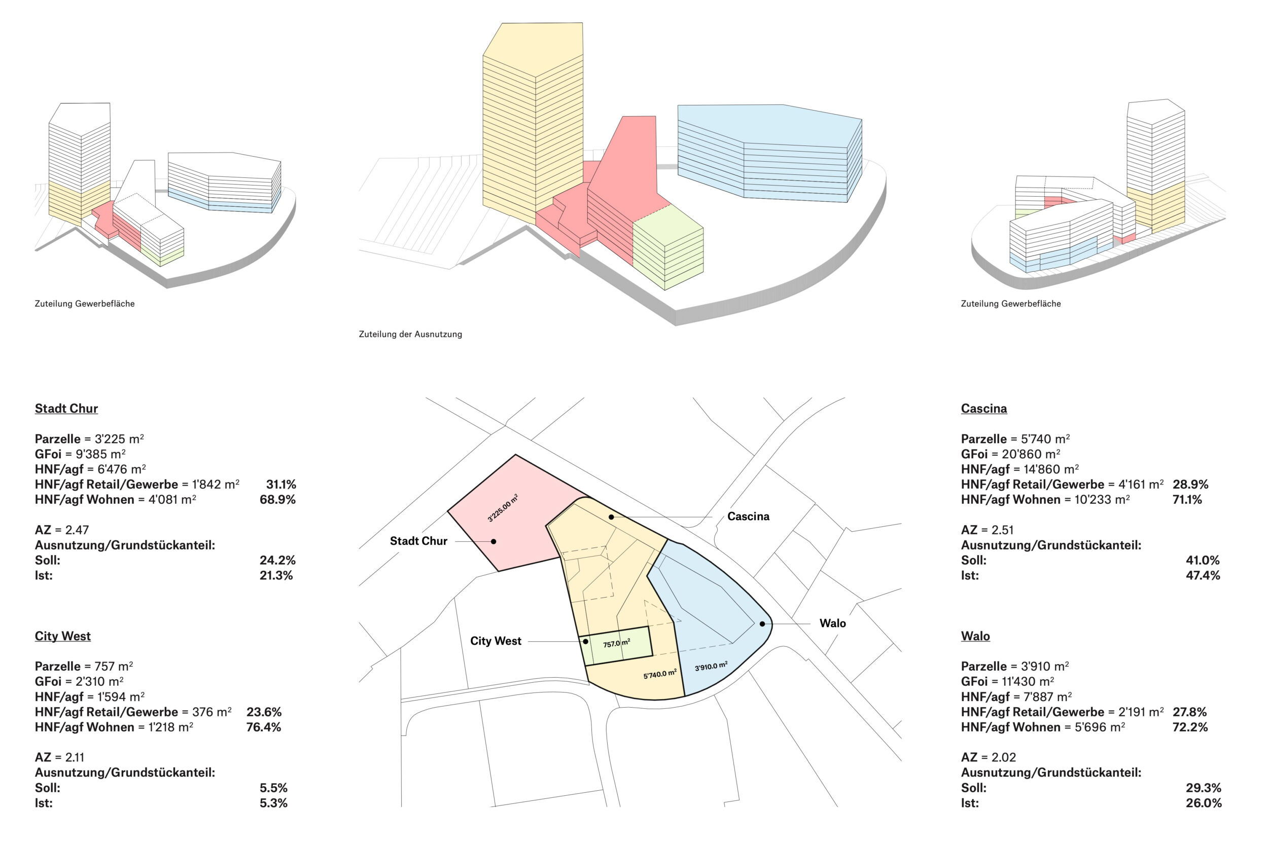 Das vorgeschlagene städtebauliche und freiräumliche Konzept vermittelt zwischen den vorhandenen und geplanten Strukturen. Es besetzt das Areal mit drei prominenten Adressen und spannt damit ein vielschichtiges städtebauliches und freiräumliches Geflecht auf. Das neue Hochhaus fasst mit dem geplanten Hochhaus den neuen, durchgrünten Bahnhofplatz, welcher als nicht unterbauter Baumhain zu einem Ort von hoher Qualität und Identität wird. Zwei Kopfbauten am Westplatz und an der Commercialstrasse rahmen einen grosszügigen Wohnhof, welcher mit dem öffentlichen Stadtgarten an der Commercialstrasse einen weiteren freiräumlichen Schwerpunkt setzt. Die neue Mitte von Chur West wird damit zu einer hoch verdichteten wie auch stark durchgrünten Stadtstruktur von hoher urbaner Qualität für das Wohnen und Arbeiten.