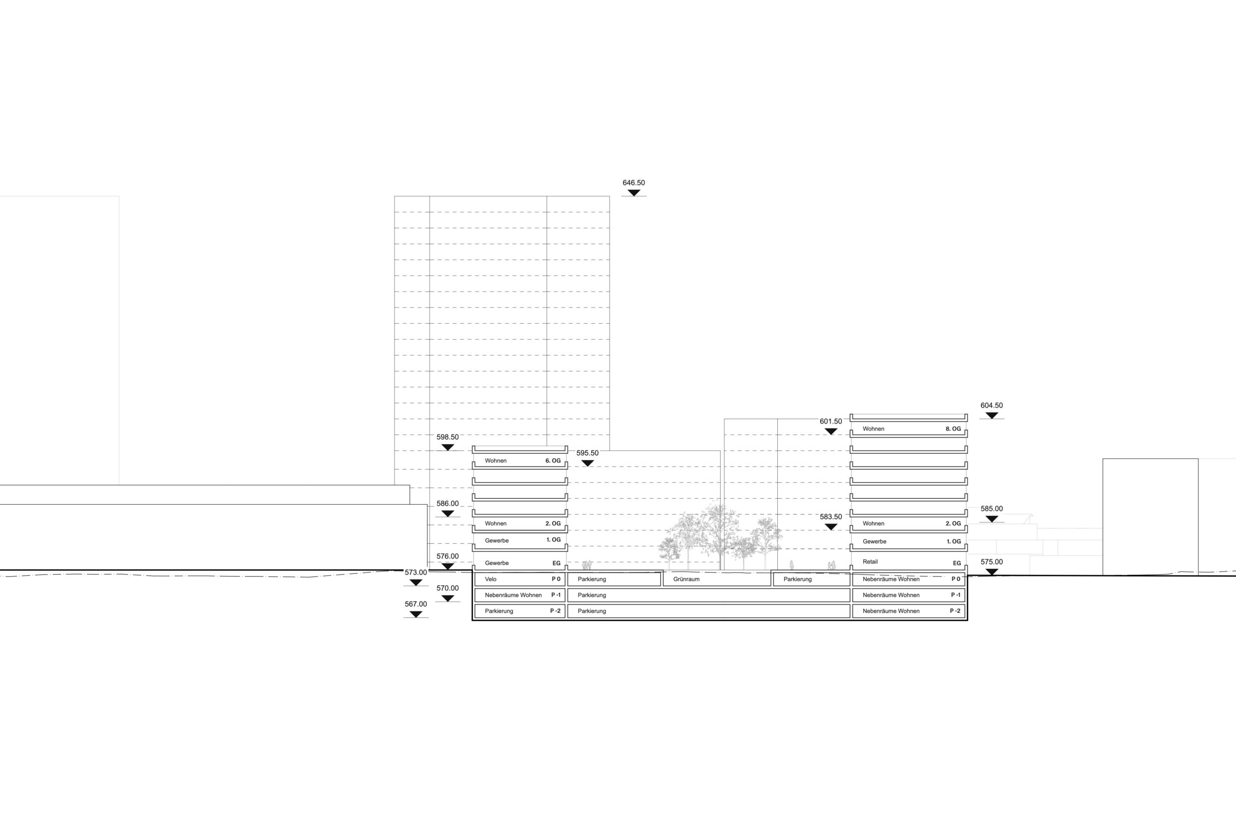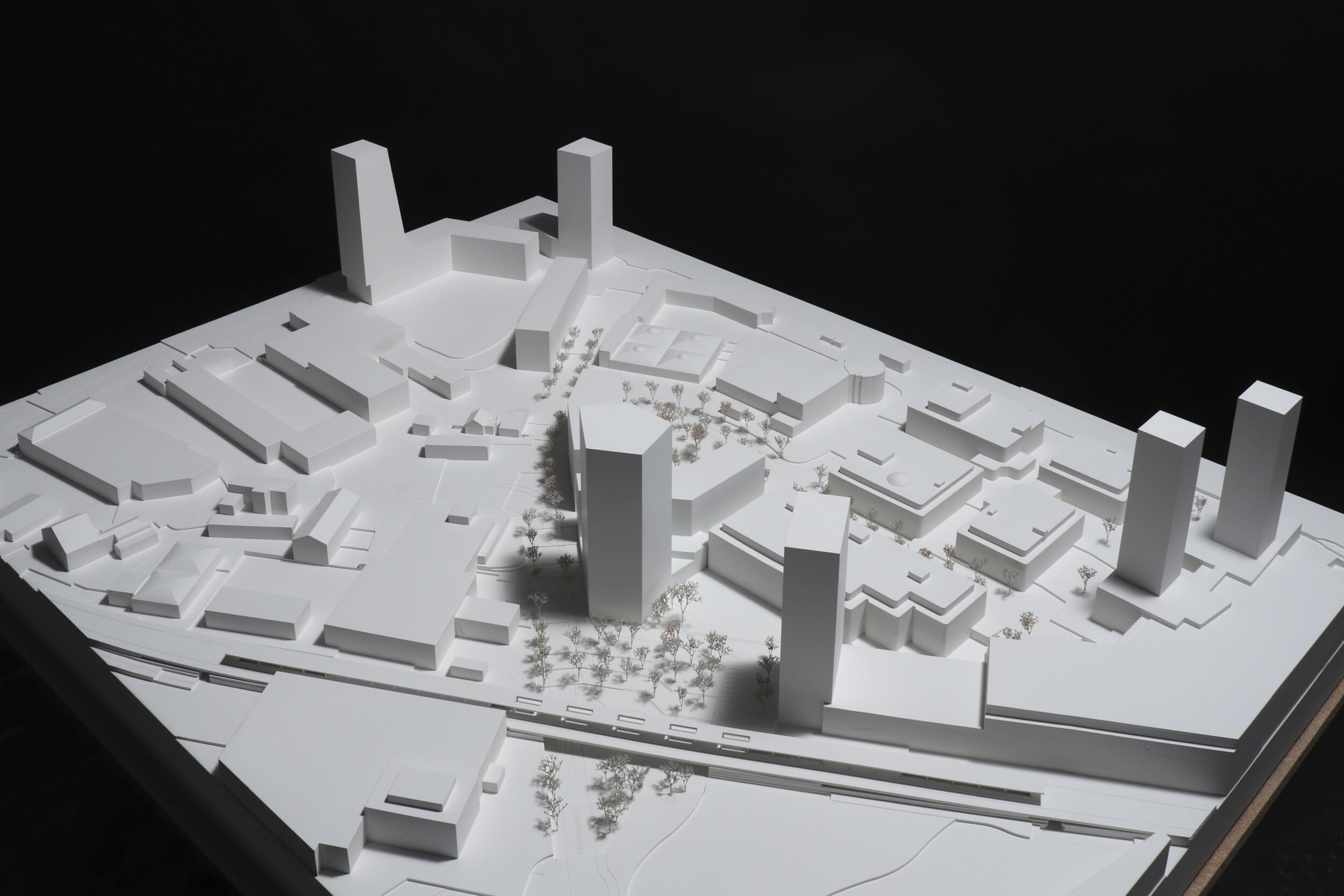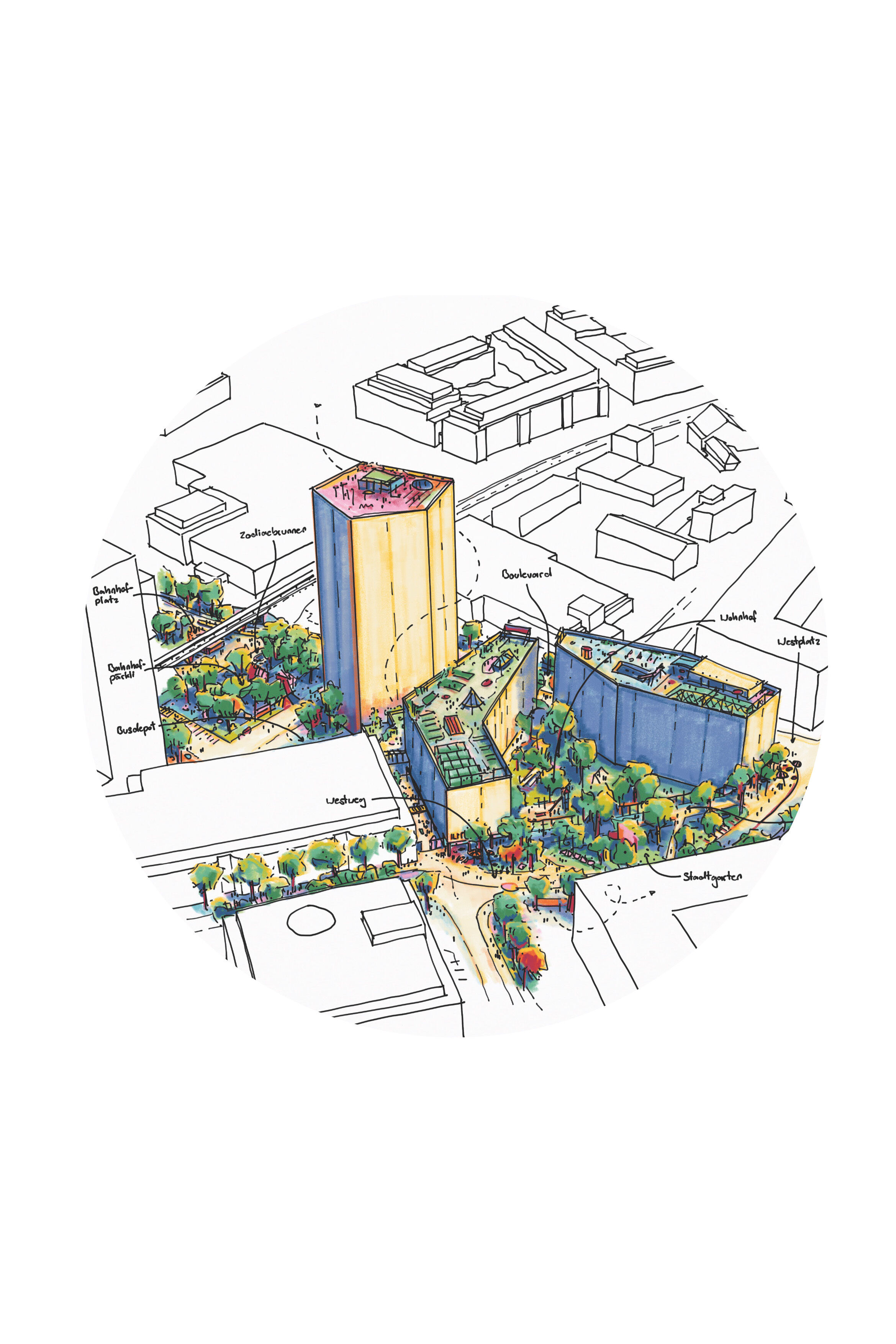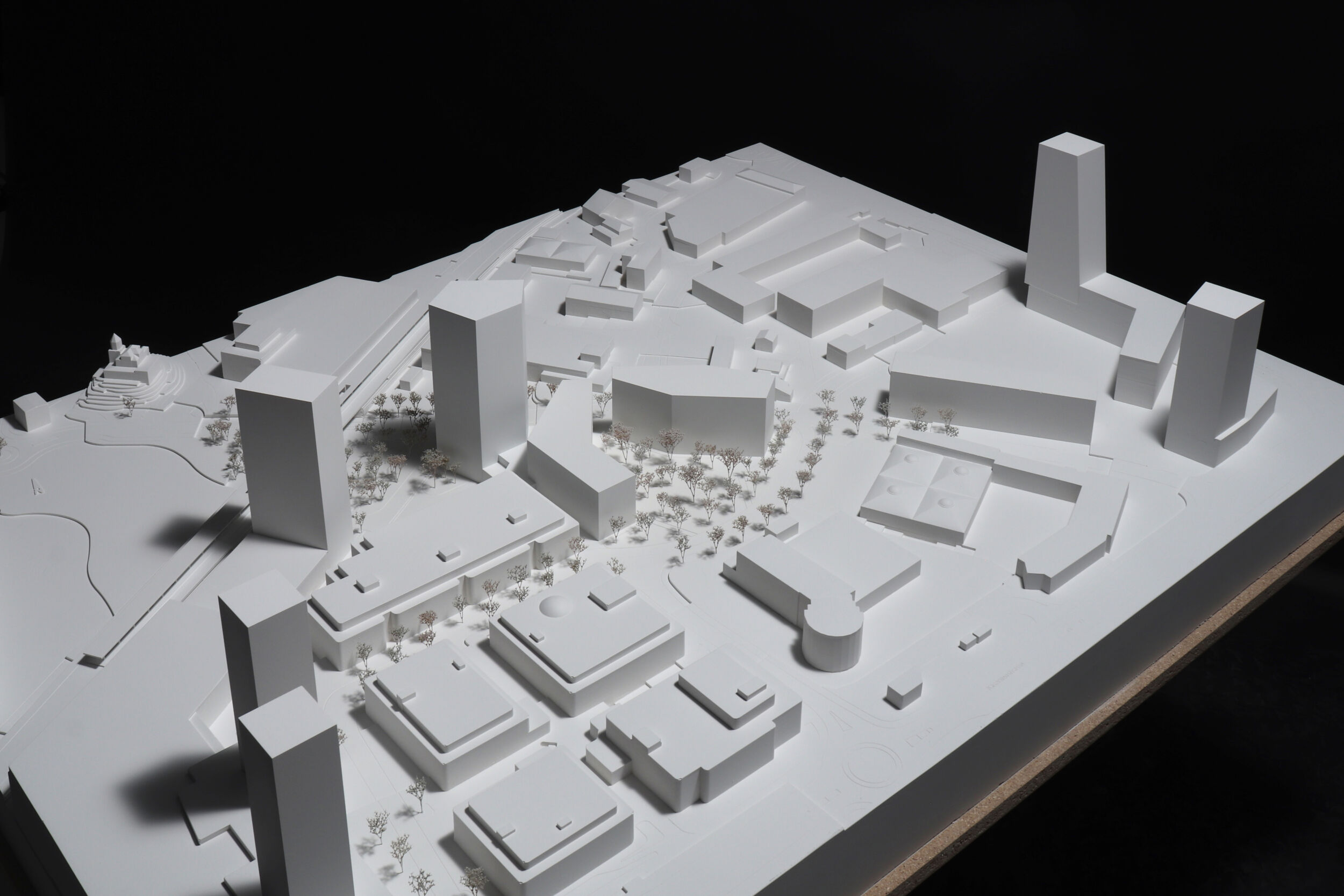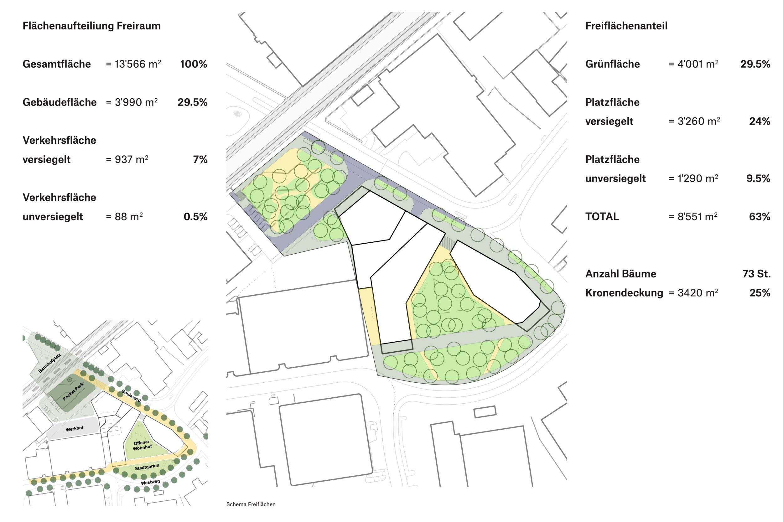 Das vorgeschlagene städtebauliche und freiräumliche Konzept vermittelt zwischen den vorhandenen und geplanten Strukturen. Es besetzt das Areal mit drei prominenten Adressen und spannt damit ein vielschichtiges städtebauliches und freiräumliches Geflecht auf. Das neue Hochhaus fasst mit dem geplanten Hochhaus den neuen, durchgrünten Bahnhofplatz, welcher als nicht unterbauter Baumhain zu einem Ort von hoher Qualität und Identität wird. Zwei Kopfbauten am Westplatz und an der Commercialstrasse rahmen einen grosszügigen Wohnhof, welcher mit dem öffentlichen Stadtgarten an der Commercialstrasse einen weiteren freiräumlichen Schwerpunkt setzt. Die neue Mitte von Chur West wird damit zu einer hoch verdichteten wie auch stark durchgrünten Stadtstruktur von hoher urbaner Qualität für das Wohnen und Arbeiten.