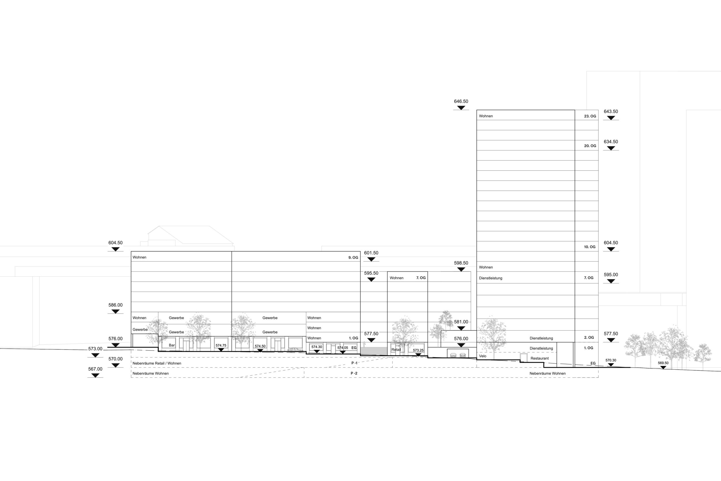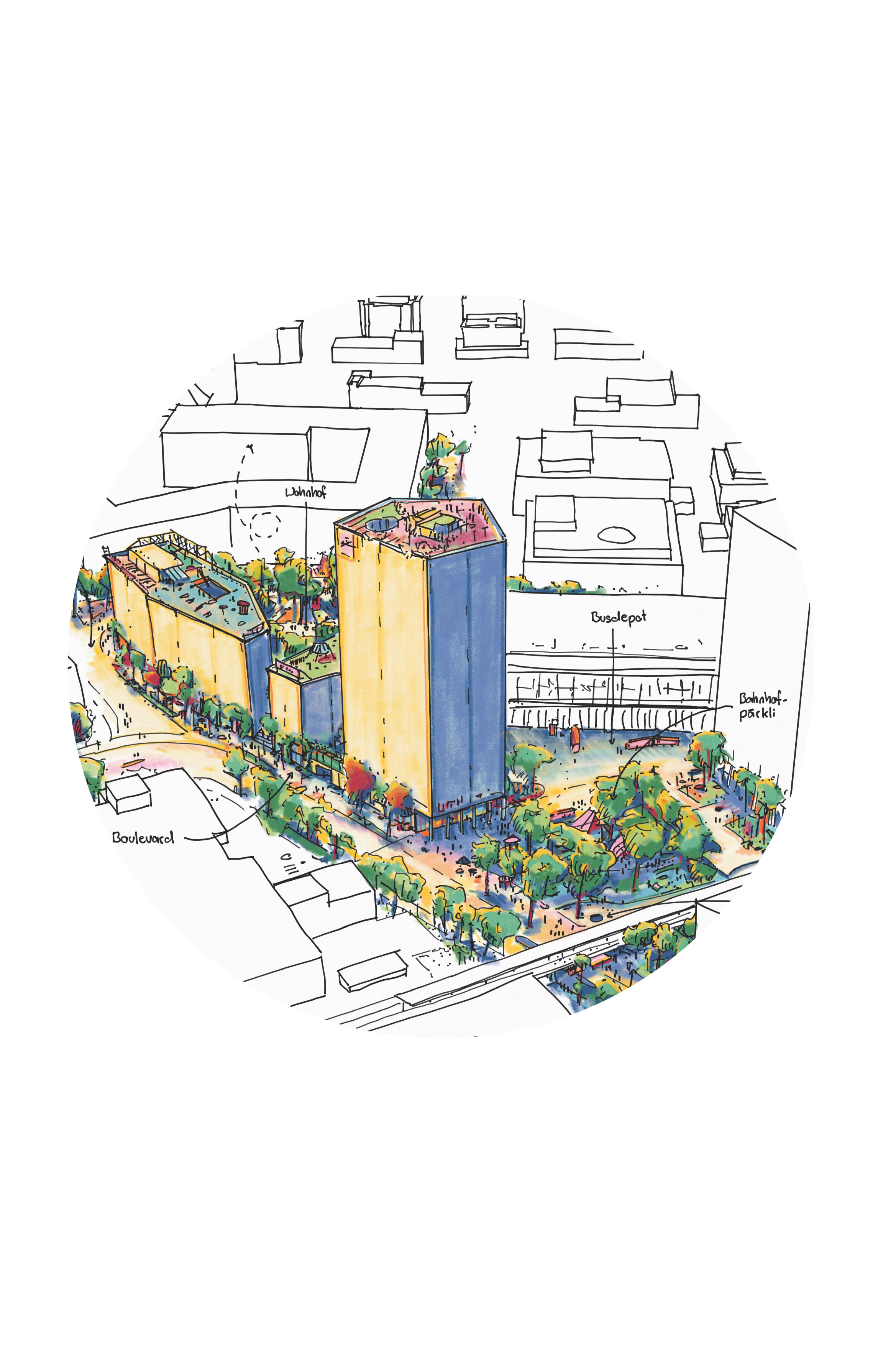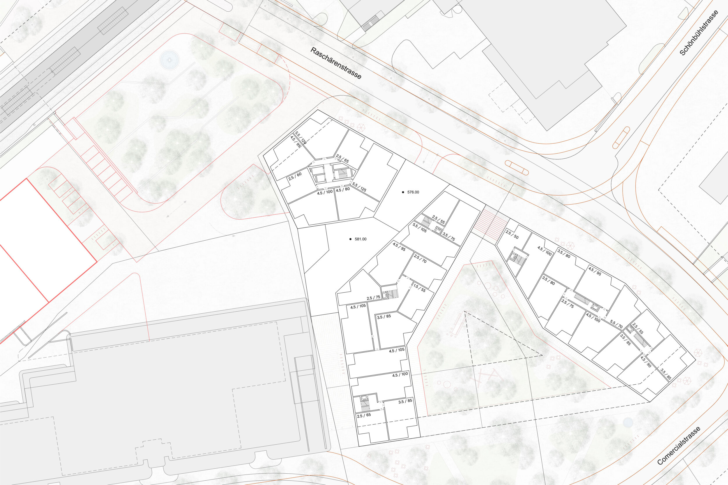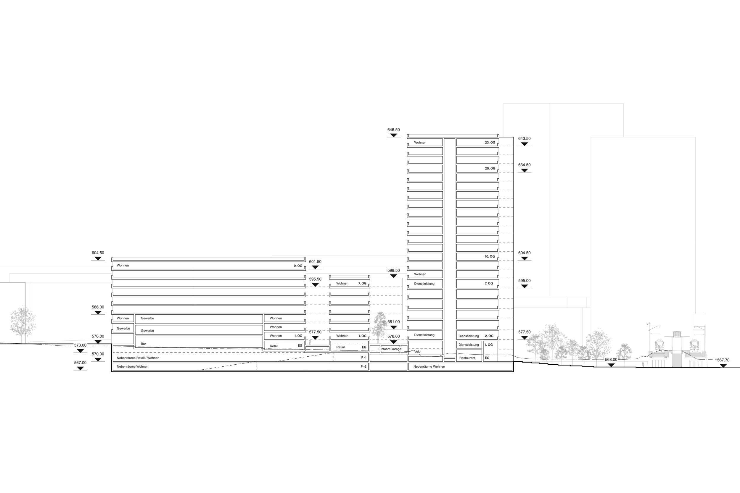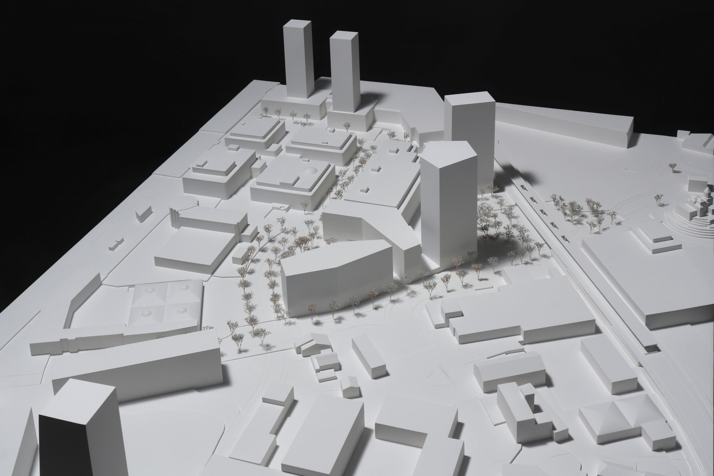 Das vorgeschlagene städtebauliche und freiräumliche Konzept vermittelt zwischen den vorhandenen und geplanten Strukturen. Es besetzt das Areal mit drei prominenten Adressen und spannt damit ein vielschichtiges städtebauliches und freiräumliches Geflecht auf. Das neue Hochhaus fasst mit dem geplanten Hochhaus den neuen, durchgrünten Bahnhofplatz, welcher als nicht unterbauter Baumhain zu einem Ort von hoher Qualität und Identität wird. Zwei Kopfbauten am Westplatz und an der Commercialstrasse rahmen einen grosszügigen Wohnhof, welcher mit dem öffentlichen Stadtgarten an der Commercialstrasse einen weiteren freiräumlichen Schwerpunkt setzt. Die neue Mitte von Chur West wird damit zu einer hoch verdichteten wie auch stark durchgrünten Stadtstruktur von hoher urbaner Qualität für das Wohnen und Arbeiten.