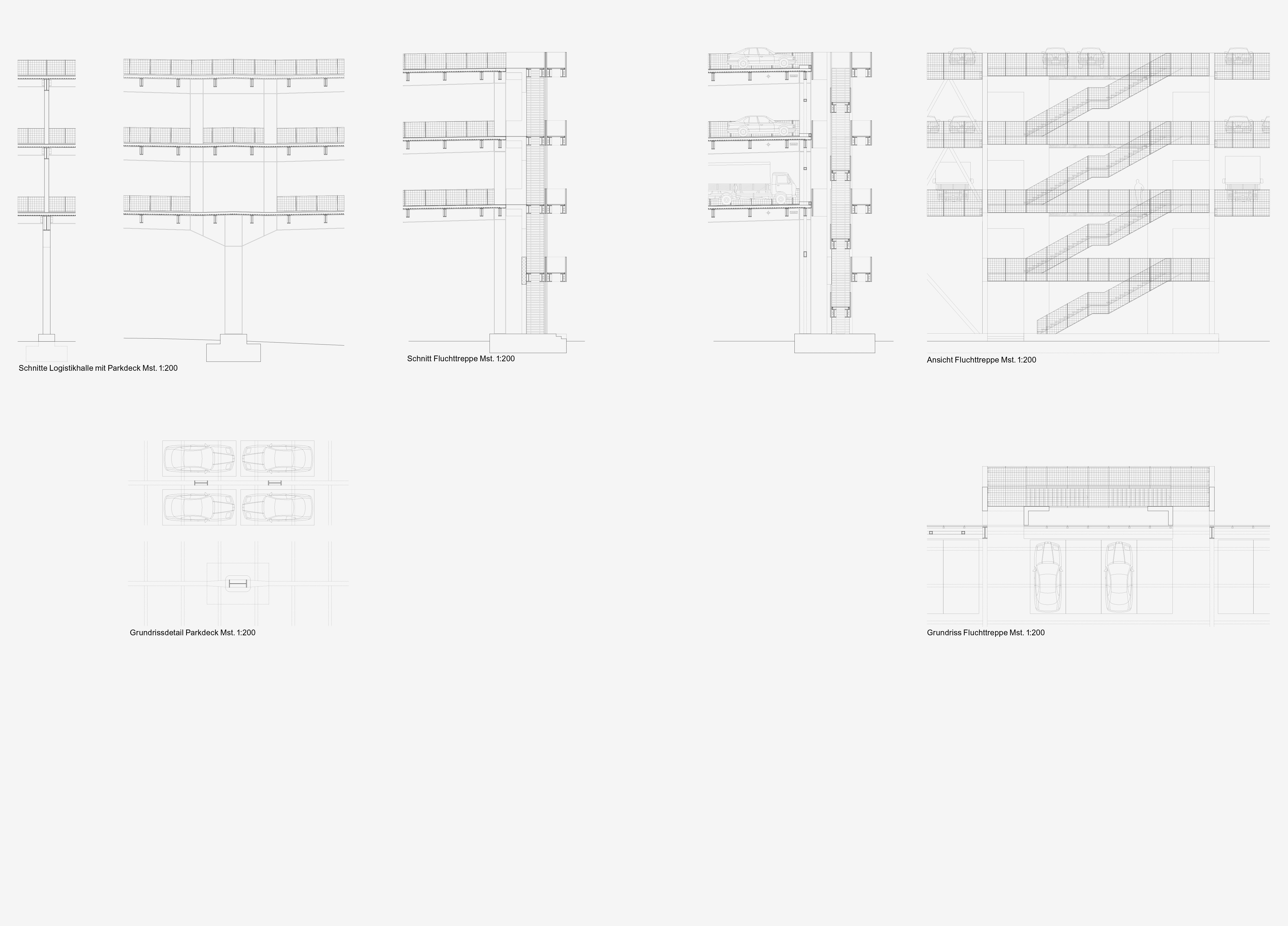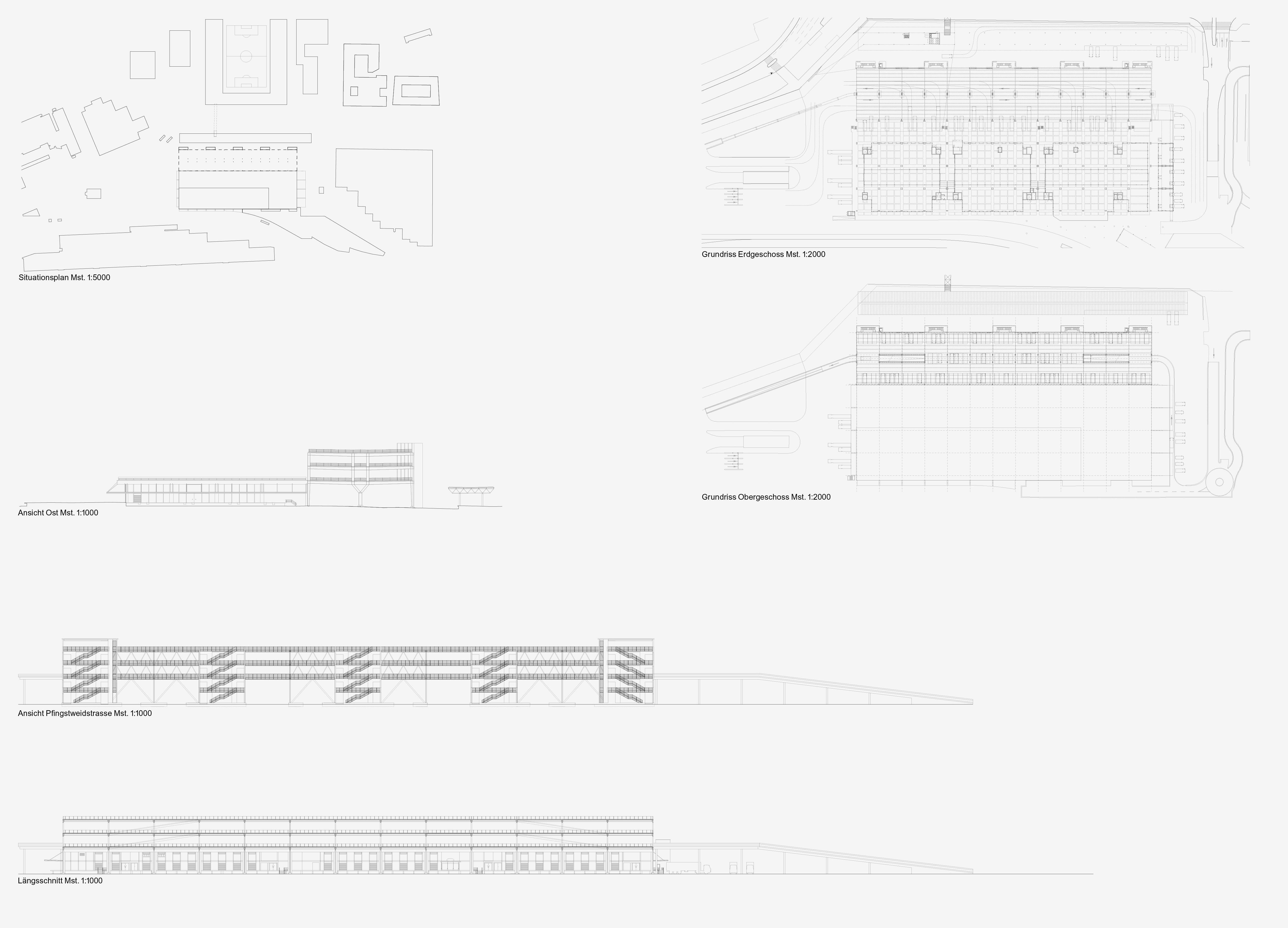 Der Zürcher Engrosmarkt dient dem Grosshandel von Früchten, Gemüse und Molkereiprodukten. Er ist nicht nur Einkaufsort für Händler und Restaurants, sondern bildet auch die Basis für viele Zulieferer, welche Läden und Gaststätten mit teilweise vorkonfektionierten Waren beliefern. Damit ist er ein wichtiger Akteur in der Food-Logistik. Weil die Zulieferung in die Stadt und in die Region immer individualisierter und kleinteiliger erfolgt, nimmt der Bestand an Fahrzeugen, welche vom Engrosmarkt aus operieren, immer stärker zu. Um die Logistikebene im Erdgeschoss von den parkierenden Fahrzeugen zu entlasten, wird ein Teil der Logistikebene über-dacht und mit einer mehrgeschossigen Parkieranlage versehen. Der Anbau an die bestehende Markthalle ist ein 200 Meter langes Gebäude, das mit seiner Grundstruktur den Rhythmus der bestehenden Markthalle übernimmt. Im Ergeschoss wird in Querrichtung eine möglichst grosse Spannweite gesucht, um das Manövrieren der Sattelschlepper möglichst wenig zu beeinträchtigen. In den Obergeschossen werden die Spannweiten verkleinert, um für Liefer- und Personenwagen ein optimales Raster zu finden. Die oberen Etagen werden über zwei Rampenbauwerke erschlossen, damit die Erschliessung der Anlageauch bei gegenüberliegendem Betrieb des Hardturmstadions jederzeit gewährleistet ist. Die Stahlbaukonstruktion wird in den Fahrgassen mit Ortbeton geschützt, in den oberen Teilen wird der bauliche Brandschutz mit Kammerbeton gewährleistet. Die Fluchttreppentürme stehen leicht abgesetzt vor der Anlage und sind in Ortbeton ausgeführt. Sie reihen sich hinter dem Dachunterstand des Produzentenmarkts auf und bilden die Fassade zur Pfingstweidstrasse. Als markante Stadtbalkone aus Ortbeton treten sie mit der denkmalgeschützten Rampe der benachbarten Migros-Zentrale in einen städtebaulichen Dialog. Der beeindruckende Marktunterstand der lokalen Gemüseproduzenten entlang der Pfingstweidstrasse wird für die mittelfristig angestrebte Teilöffnung des Betriebsareals vorbereitet.