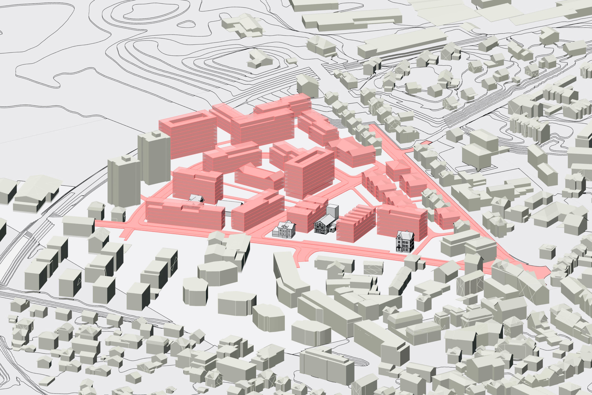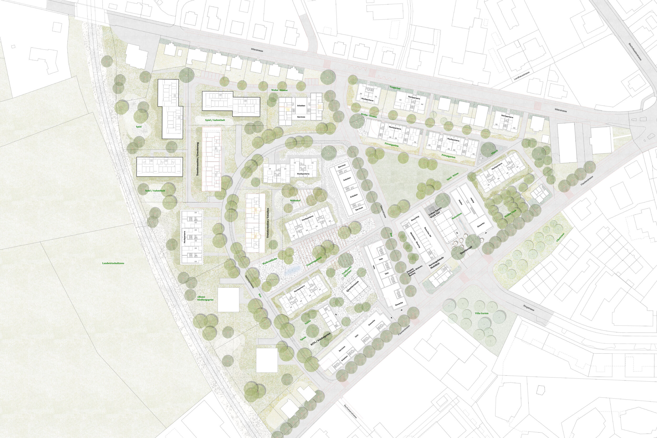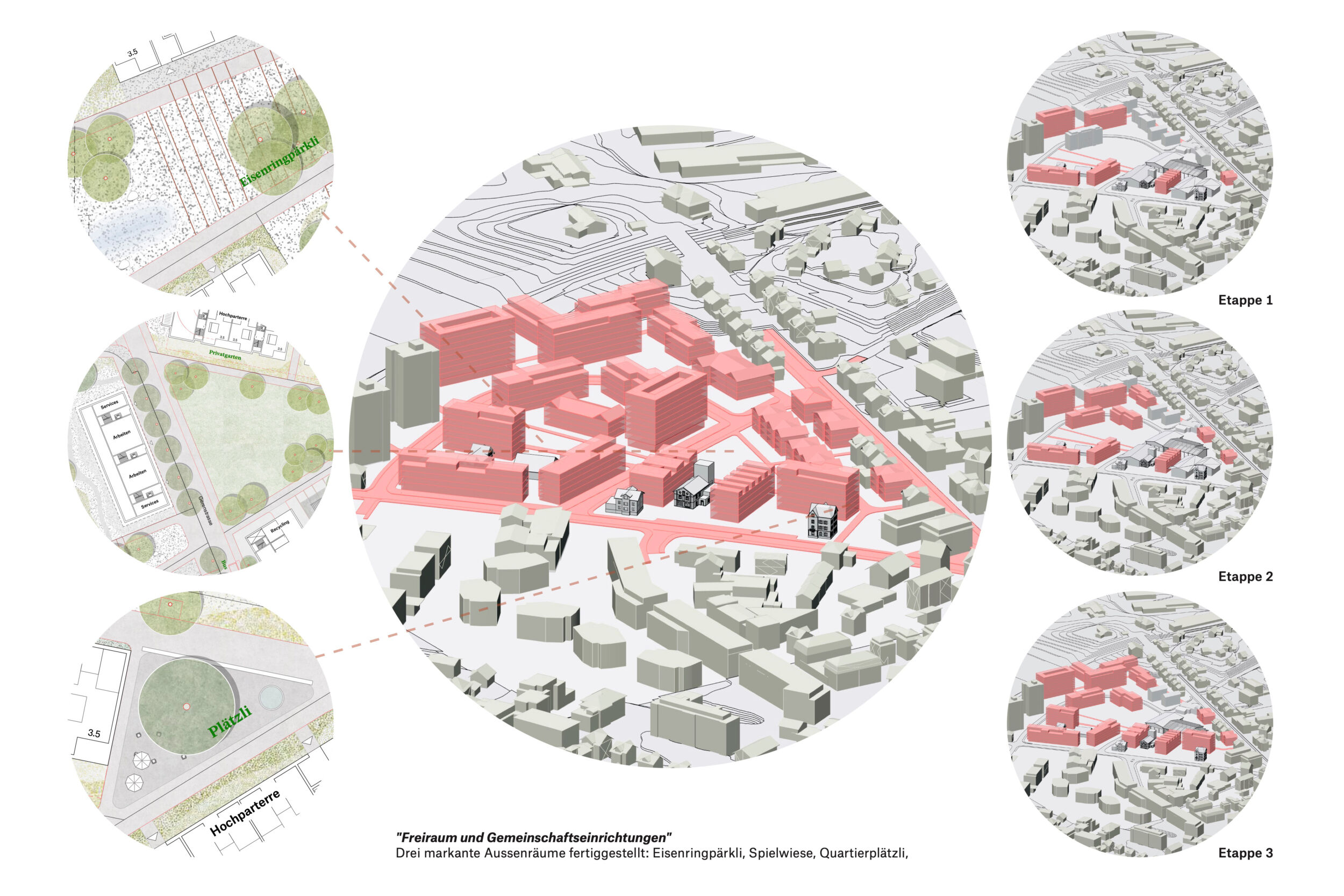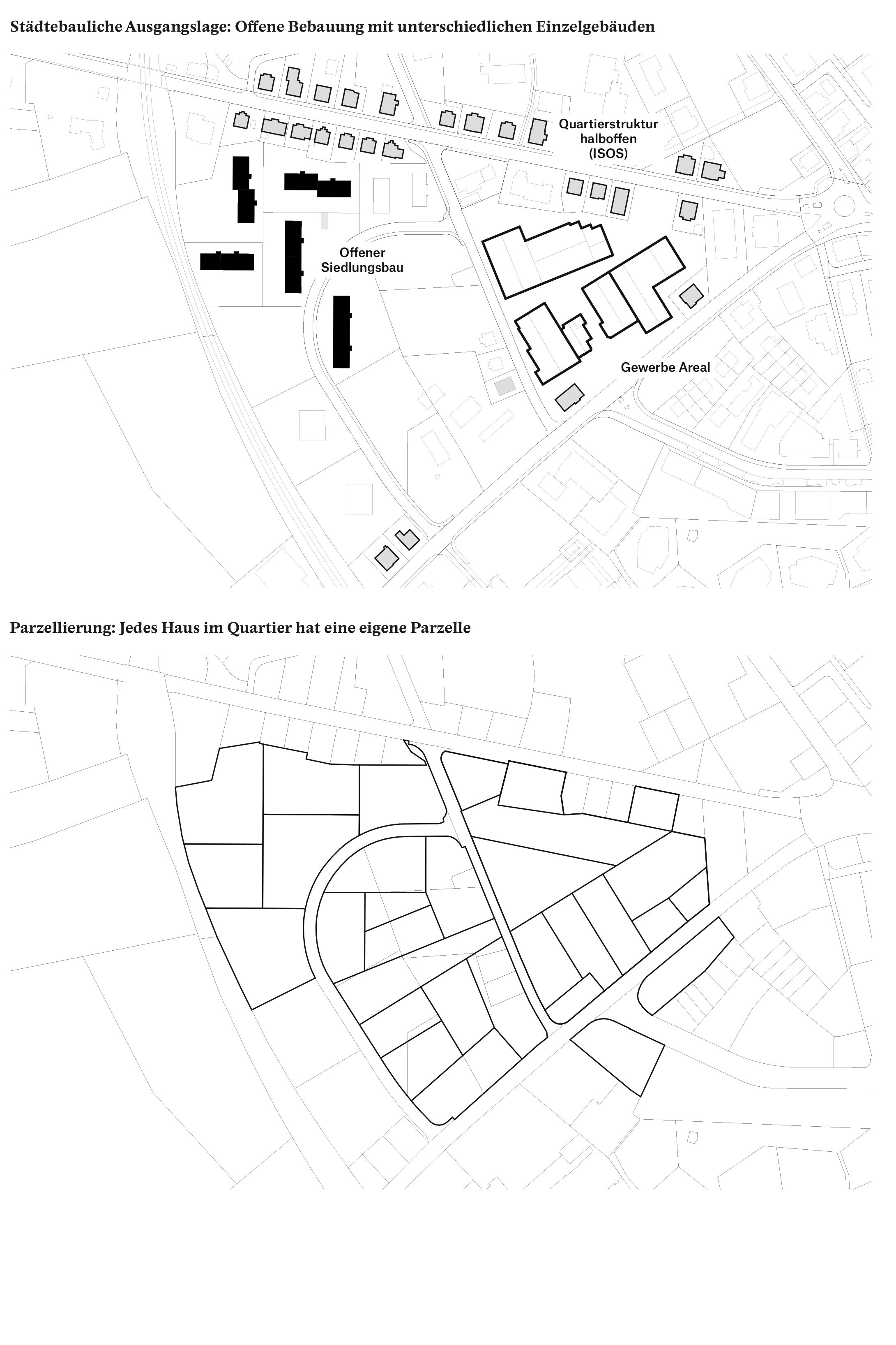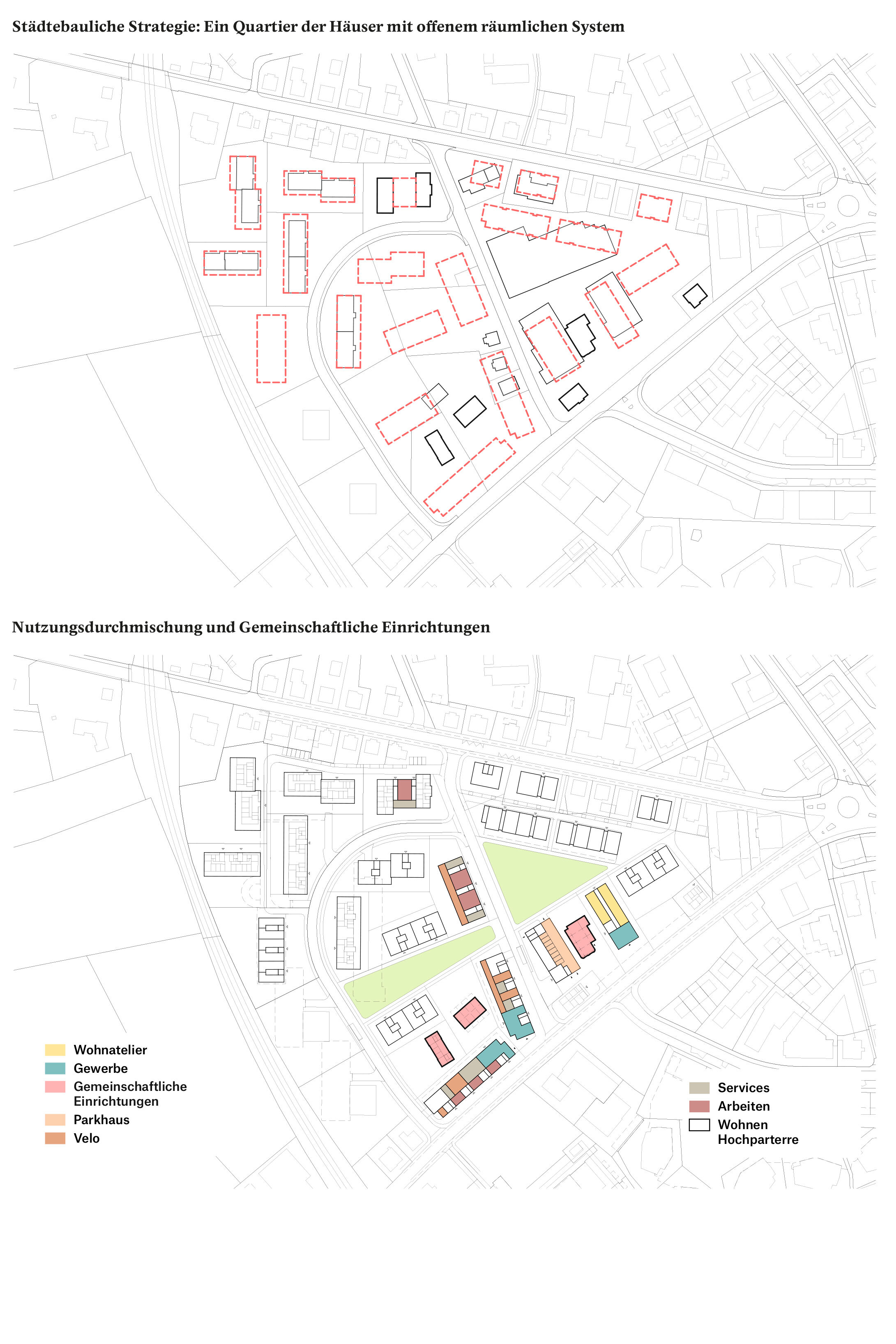 Im Dialog mit dem Bestand wird in einem offenen räumlichen System eine Konstellation von unterschiedlichen Baukörpern aufgebaut. Die neuen Einzelbaukörper haben in Fläche, Höhe, Typologie und Ausdruck eigenständige Charaktere. Sie treten in Bezug zum Bestand und präzisieren schaffen im bestehenden Raumfluss Orte von prägnanter Charakteristik. Die Entwicklung des «offenen Quartiers der Häuser» wird durch die kontinuierliche Aufwertung der Freiräume und der Durchwegung begleitet. Die einfachen Baukörper erlauben ökonomische und ökologische Bauweisen, welche die Reinvestition in den Bestand und in das Wohnumfeld ermöglichen.
