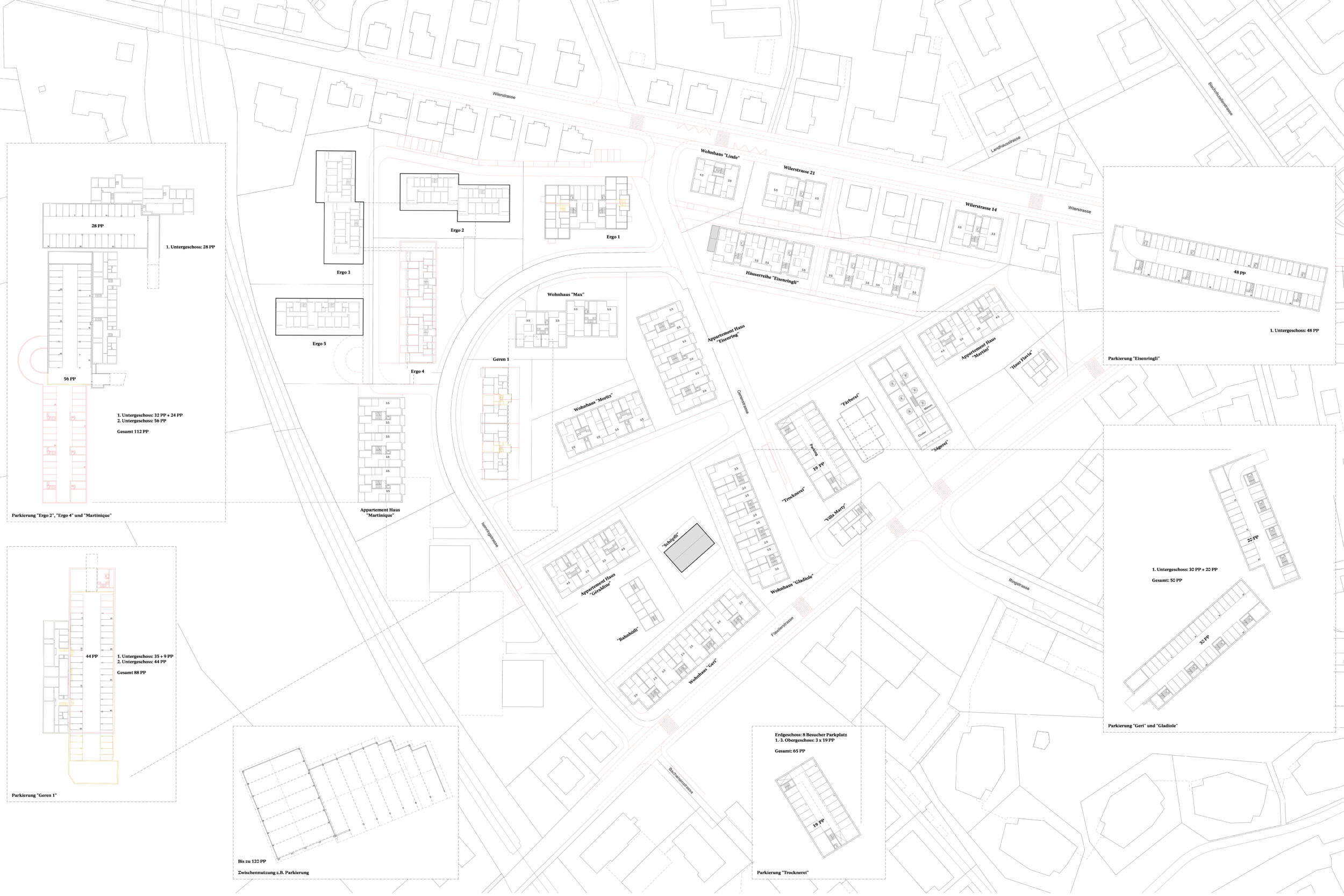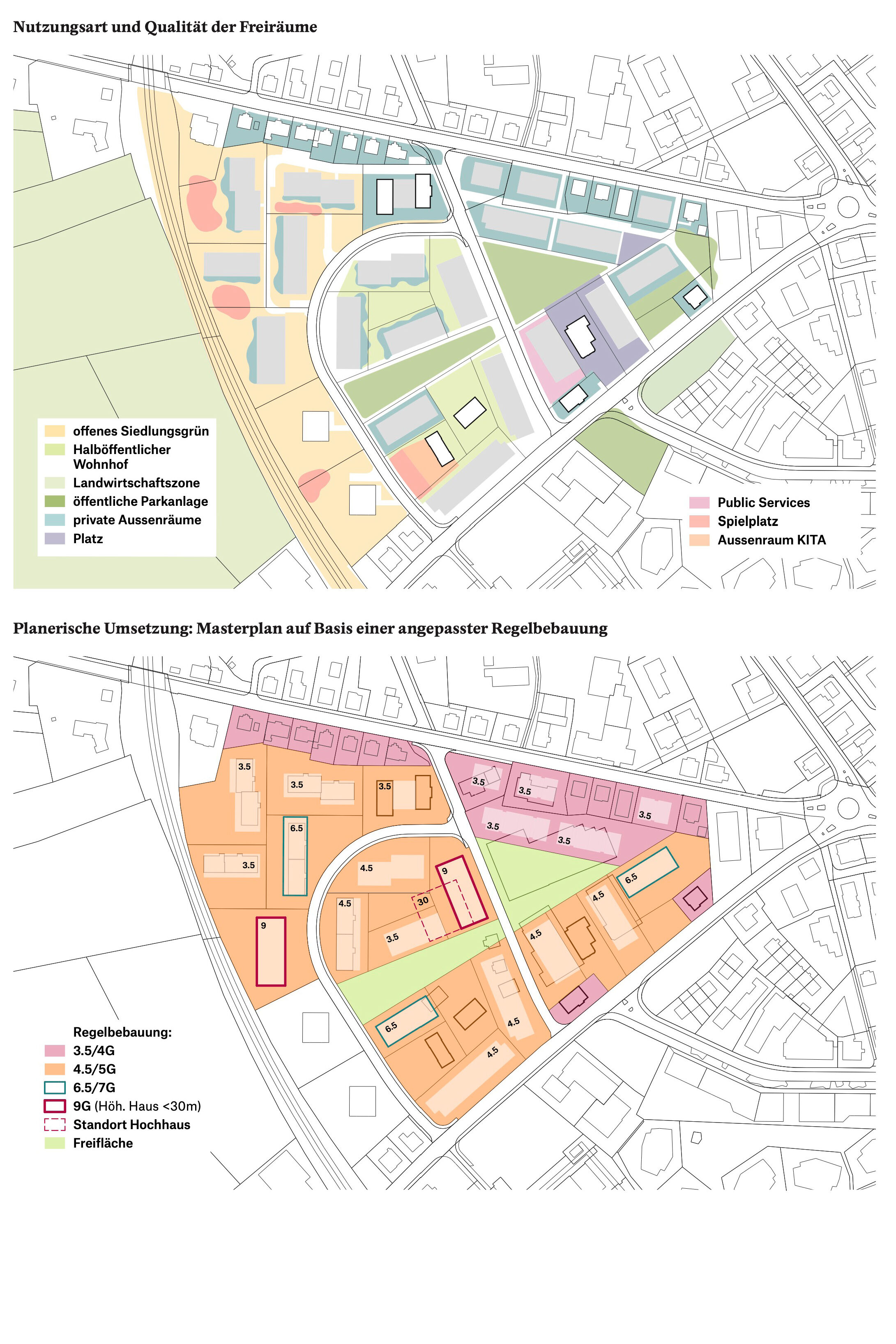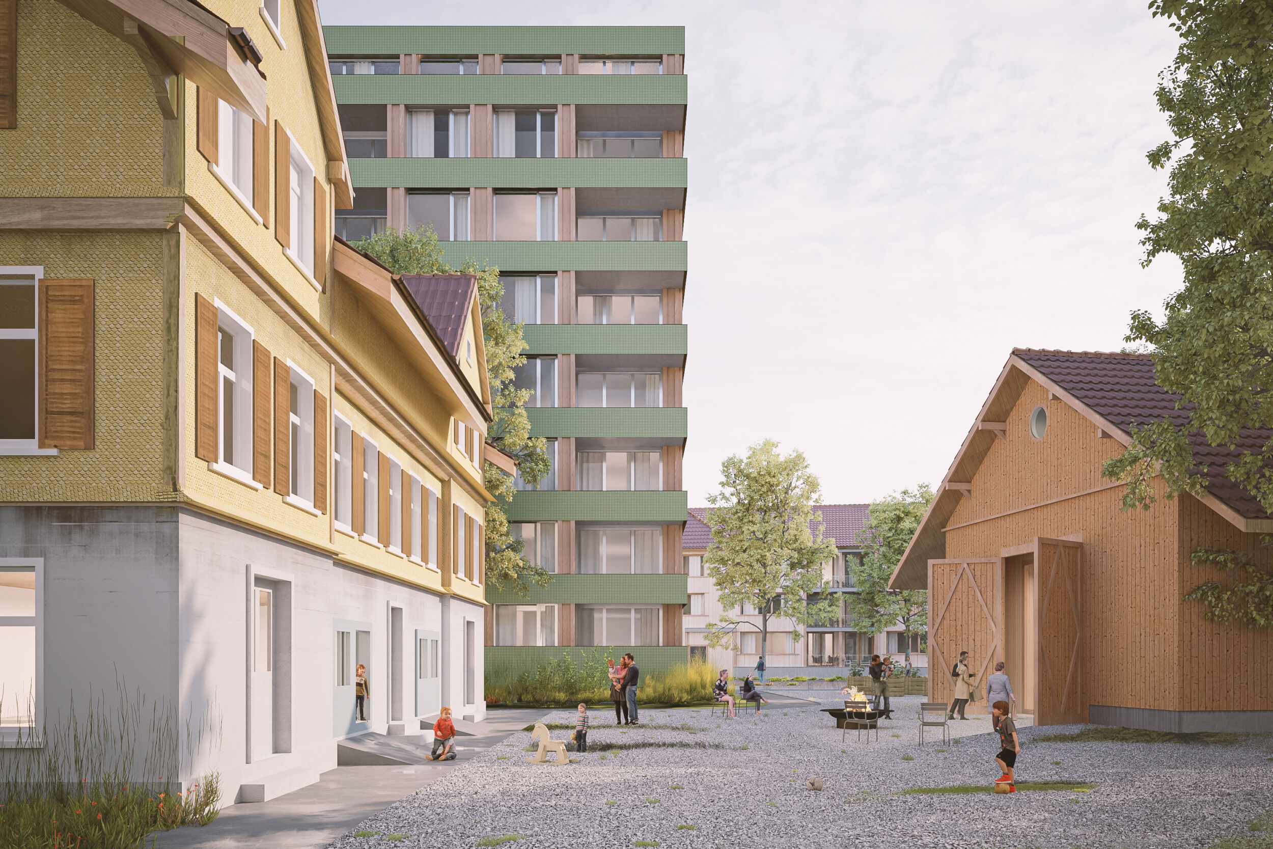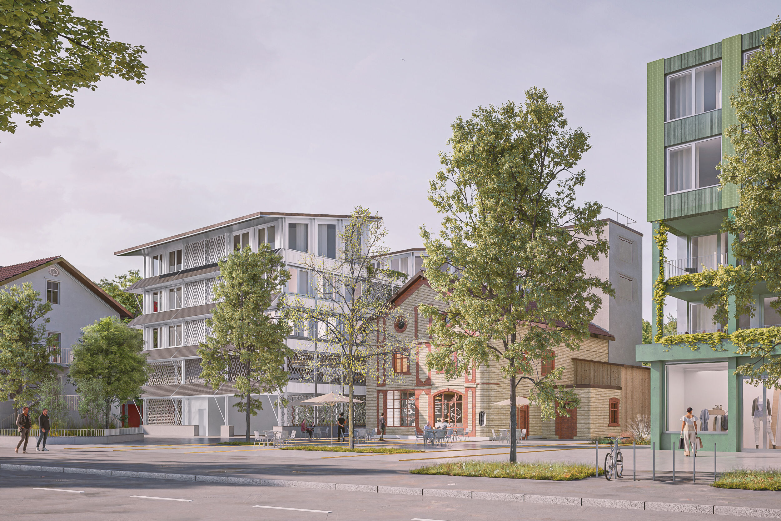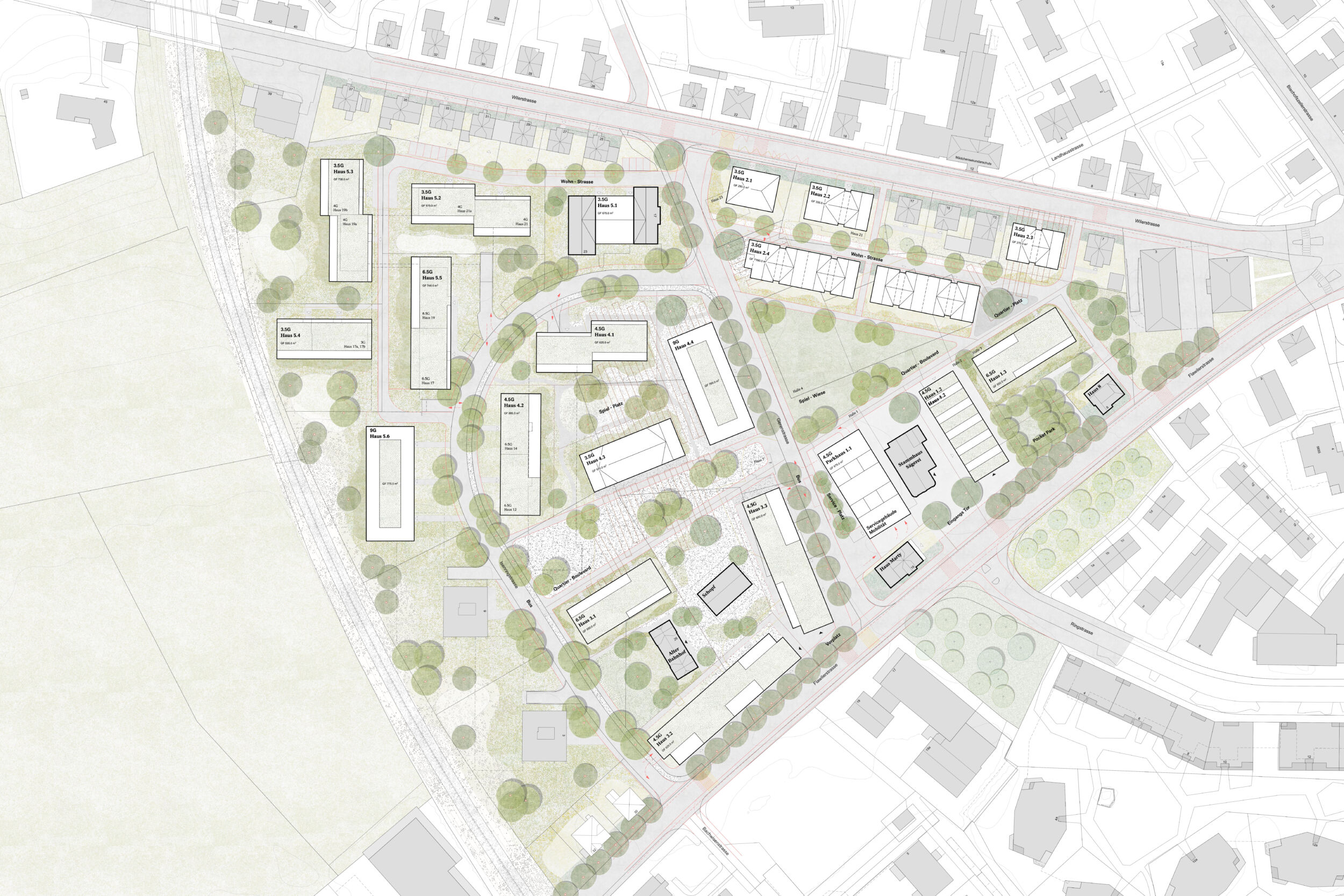 Im Dialog mit dem Bestand wird in einem offenen räumlichen System eine Konstellation von unterschiedlichen Baukörpern aufgebaut. Die neuen Einzelbaukörper haben in Fläche, Höhe, Typologie und Ausdruck eigenständige Charaktere. Sie treten in Bezug zum Bestand und präzisieren schaffen im bestehenden Raumfluss Orte von prägnanter Charakteristik. Die Entwicklung des «offenen Quartiers der Häuser» wird durch die kontinuierliche Aufwertung der Freiräume und der Durchwegung begleitet. Die einfachen Baukörper erlauben ökonomische und ökologische Bauweisen, welche die Reinvestition in den Bestand und in das Wohnumfeld ermöglichen.