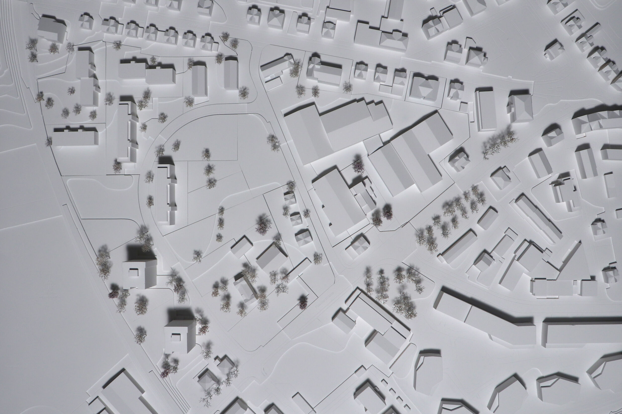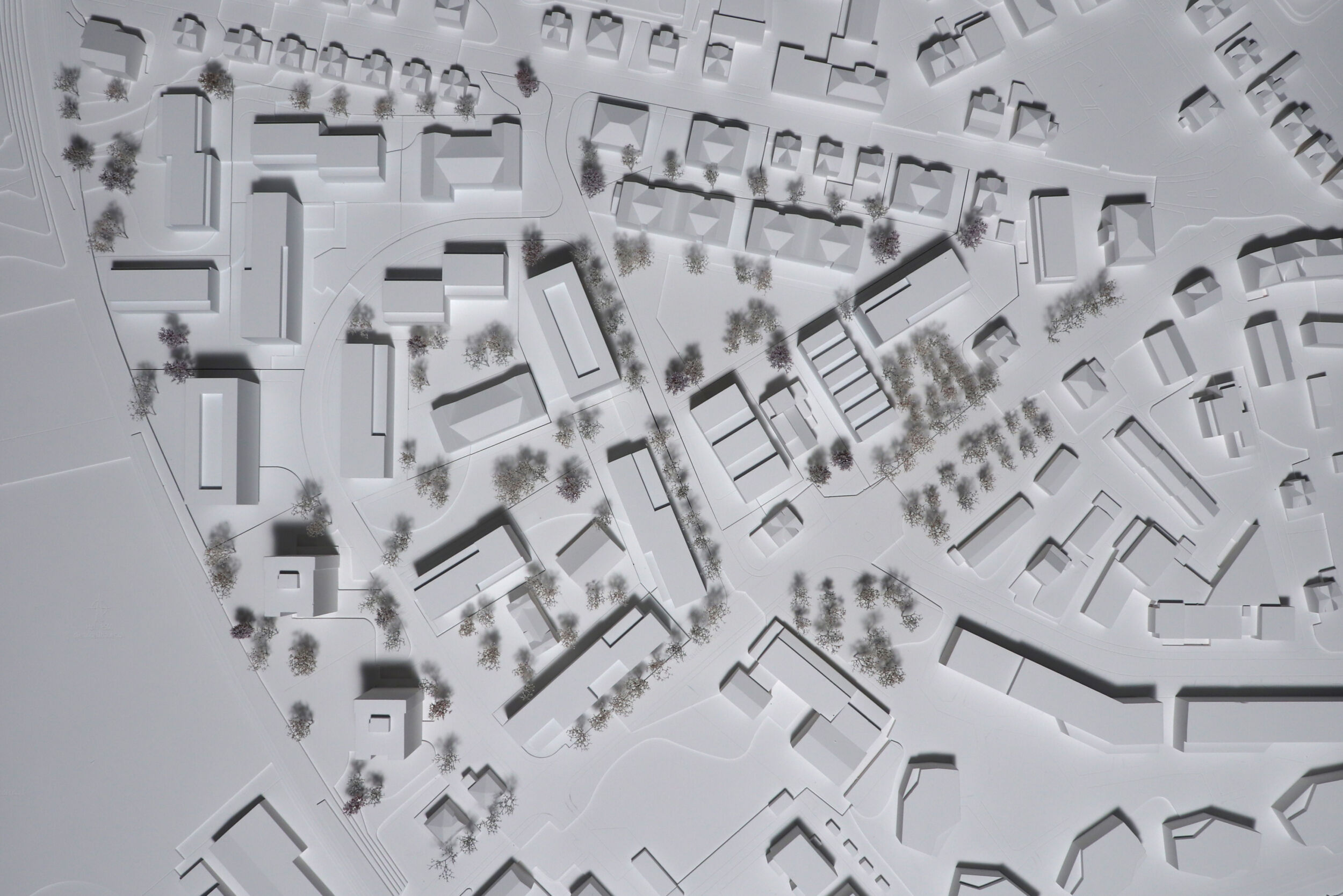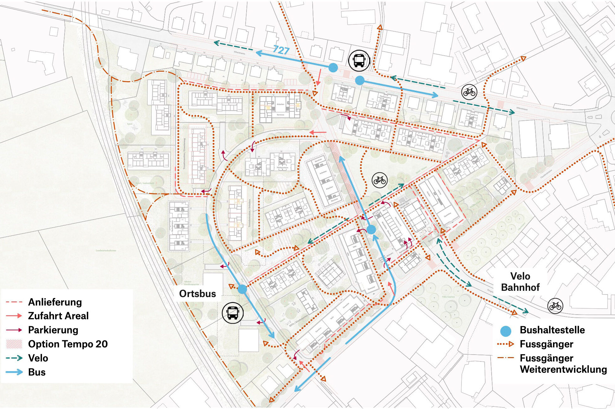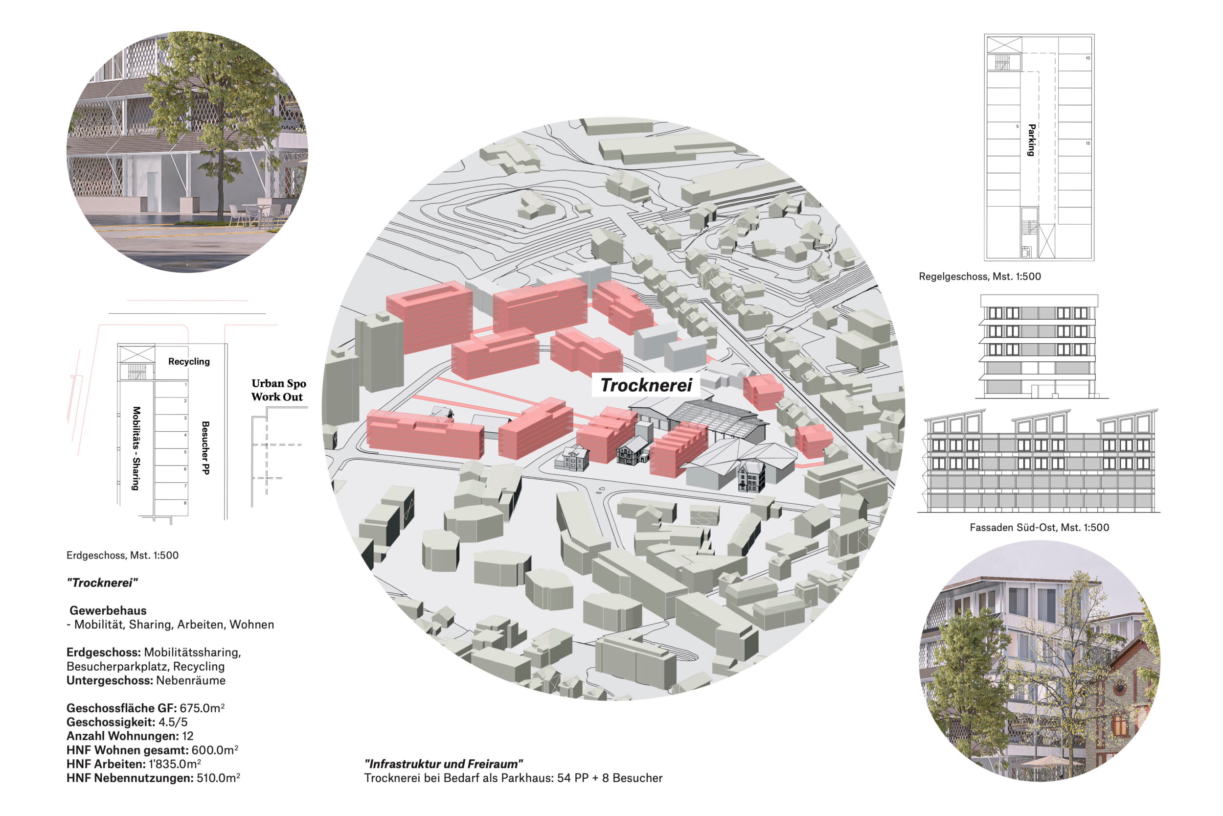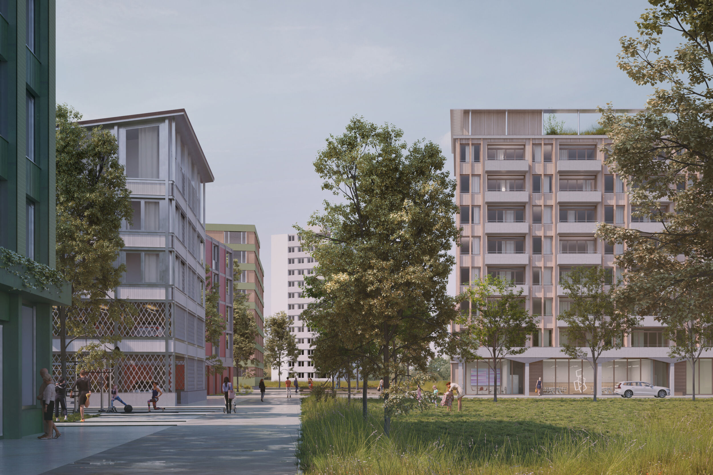 Im Dialog mit dem Bestand wird in einem offenen räumlichen System eine Konstellation von unterschiedlichen Baukörpern aufgebaut. Die neuen Einzelbaukörper haben in Fläche, Höhe, Typologie und Ausdruck eigenständige Charaktere. Sie treten in Bezug zum Bestand und präzisieren schaffen im bestehenden Raumfluss Orte von prägnanter Charakteristik. Die Entwicklung des «offenen Quartiers der Häuser» wird durch die kontinuierliche Aufwertung der Freiräume und der Durchwegung begleitet. Die einfachen Baukörper erlauben ökonomische und ökologische Bauweisen, welche die Reinvestition in den Bestand und in das Wohnumfeld ermöglichen.