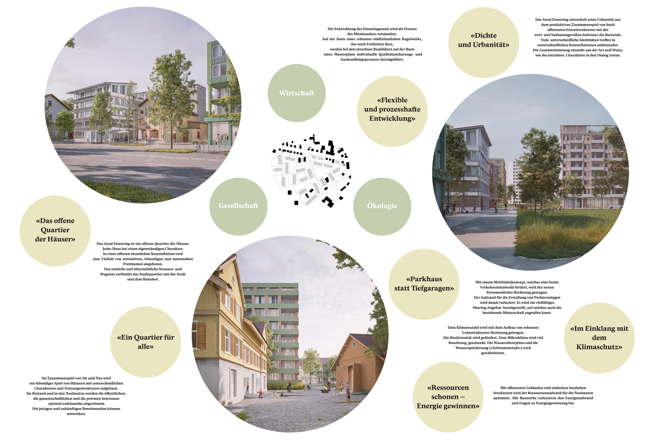 Das Entwicklungskonzept für das neue Gossauer Stadtquartier Eisenring baut auf den bestehenden baulichen und infrastrukturellen Strukturen auf. Es versteht diese trotz vorhandener Heterogenität als wertvolle Ressource, auf welcher prozesshaft und möglichst wenig invasiv eine zeitgemässe Urbanität aufgebaut wird. Es wird kein fertiges Bild zementiert, sondern die Grundlage für einen qualitativ hochstehenden Prozess gelegt.