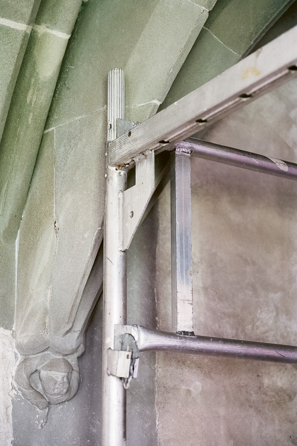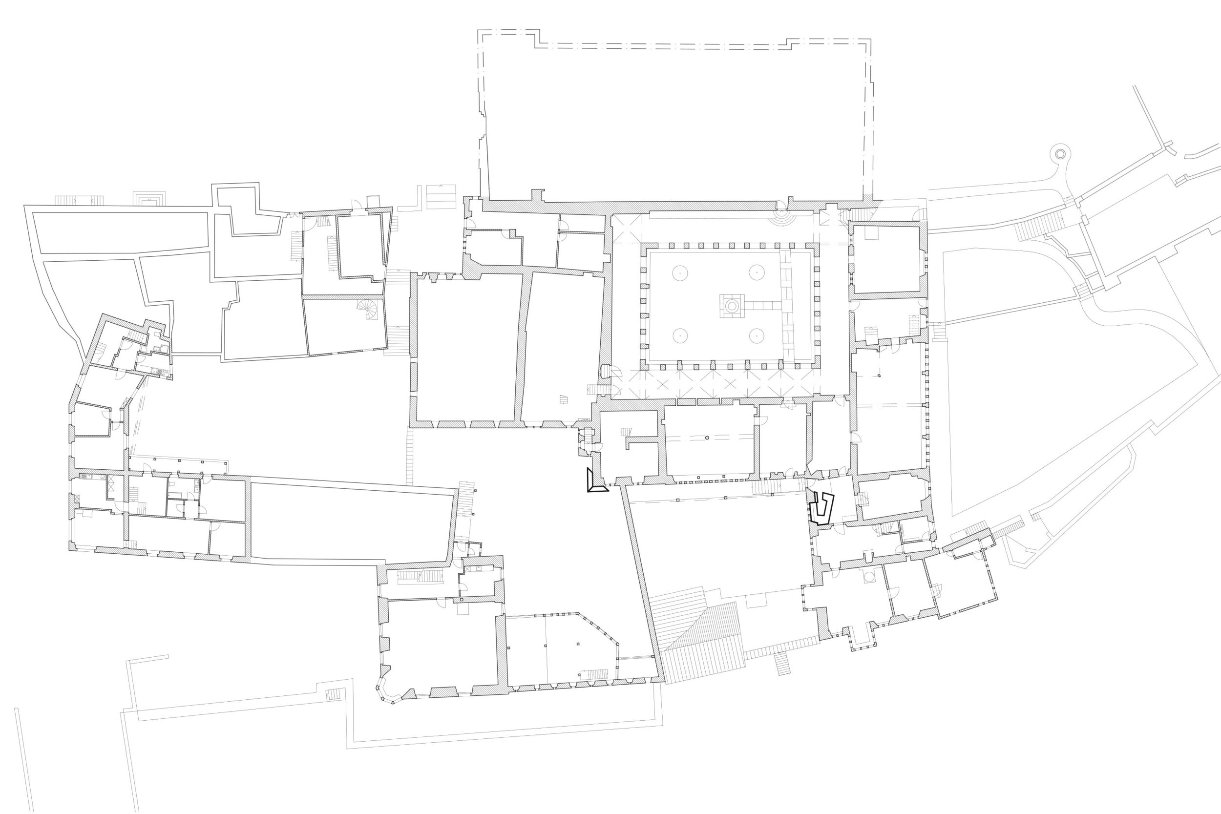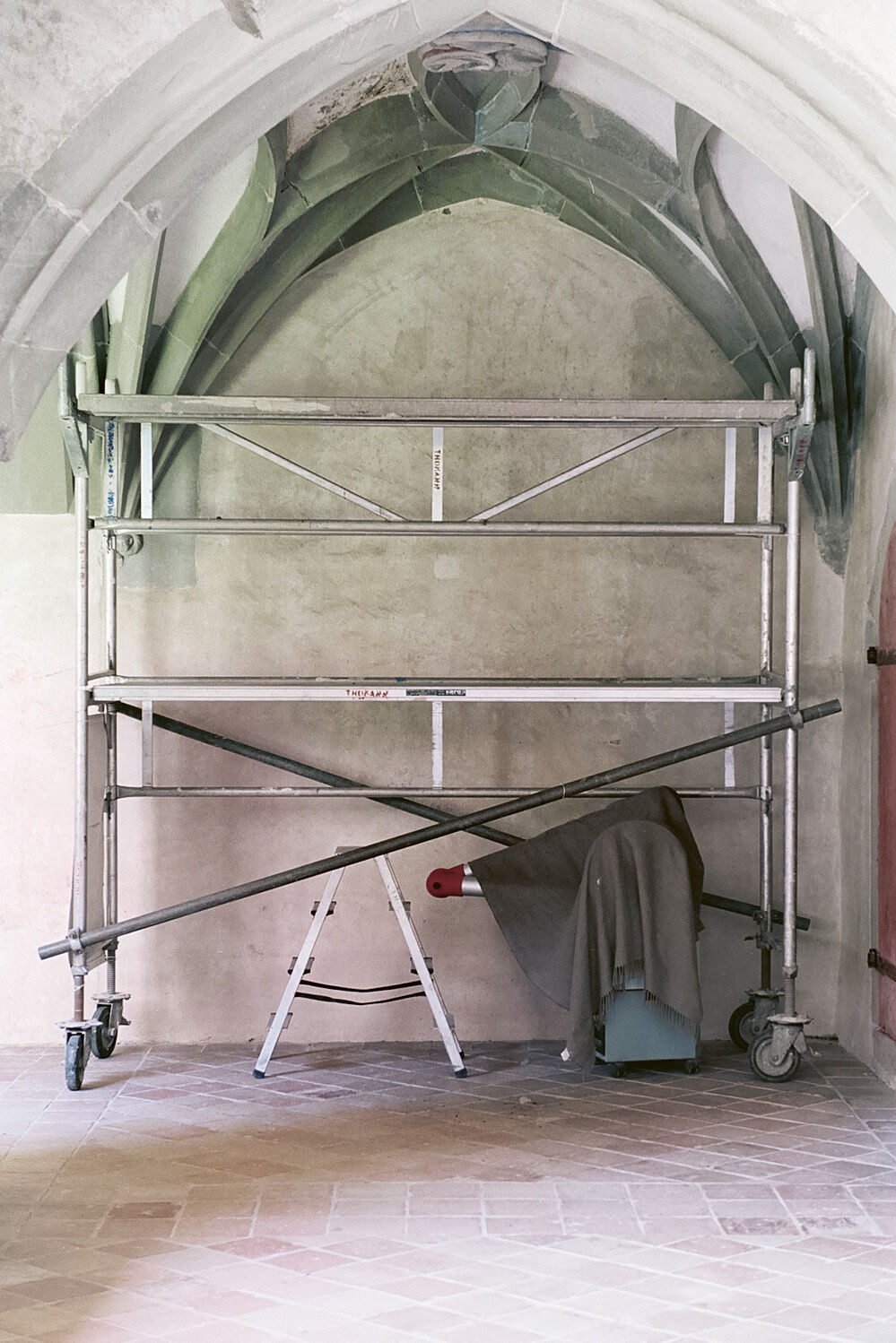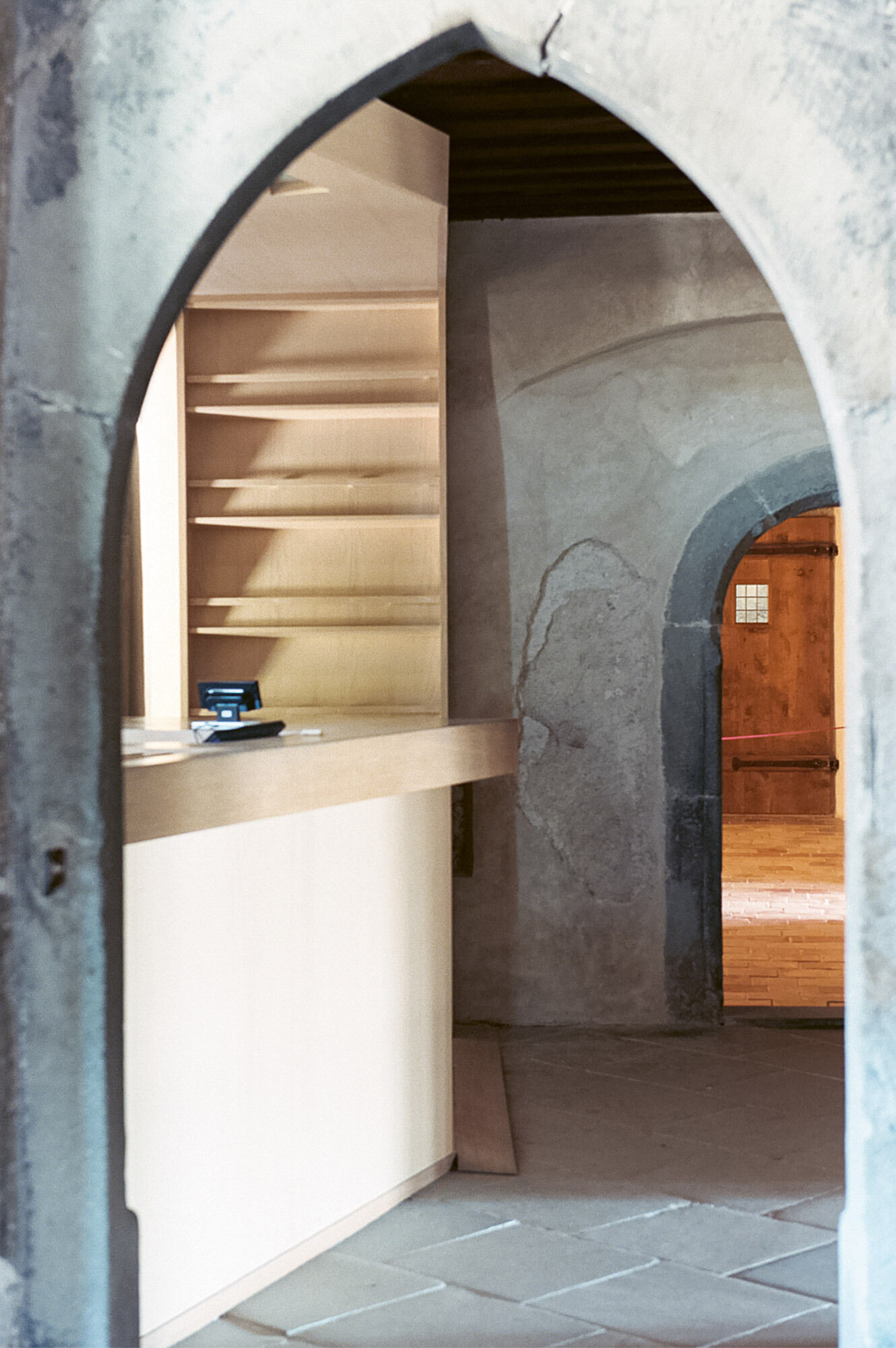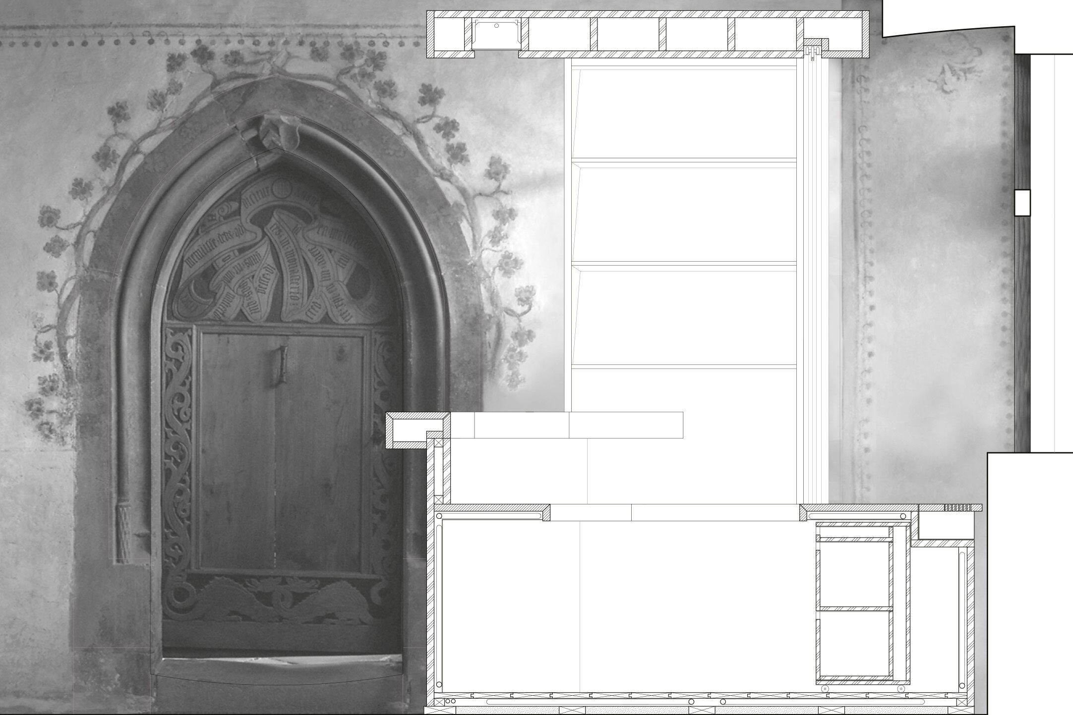 Der Schwerpunkt der Arbeit lag auf dem Reinigen und Sichern von Bausubstanz und Malerei. Dazu gehörten unter anderem das Schutzdach für das Sandsteinrelief im Vorhof sowie subtile Interventionen im Bereich Besucherführung und Fluchtwegbeleuchtung. Das nach unserer Arbeit eingebaute Ausstellungs- und Informationsdesign konterkariert diese Subtilität in Gestaltung und eingesetzter Materialität.