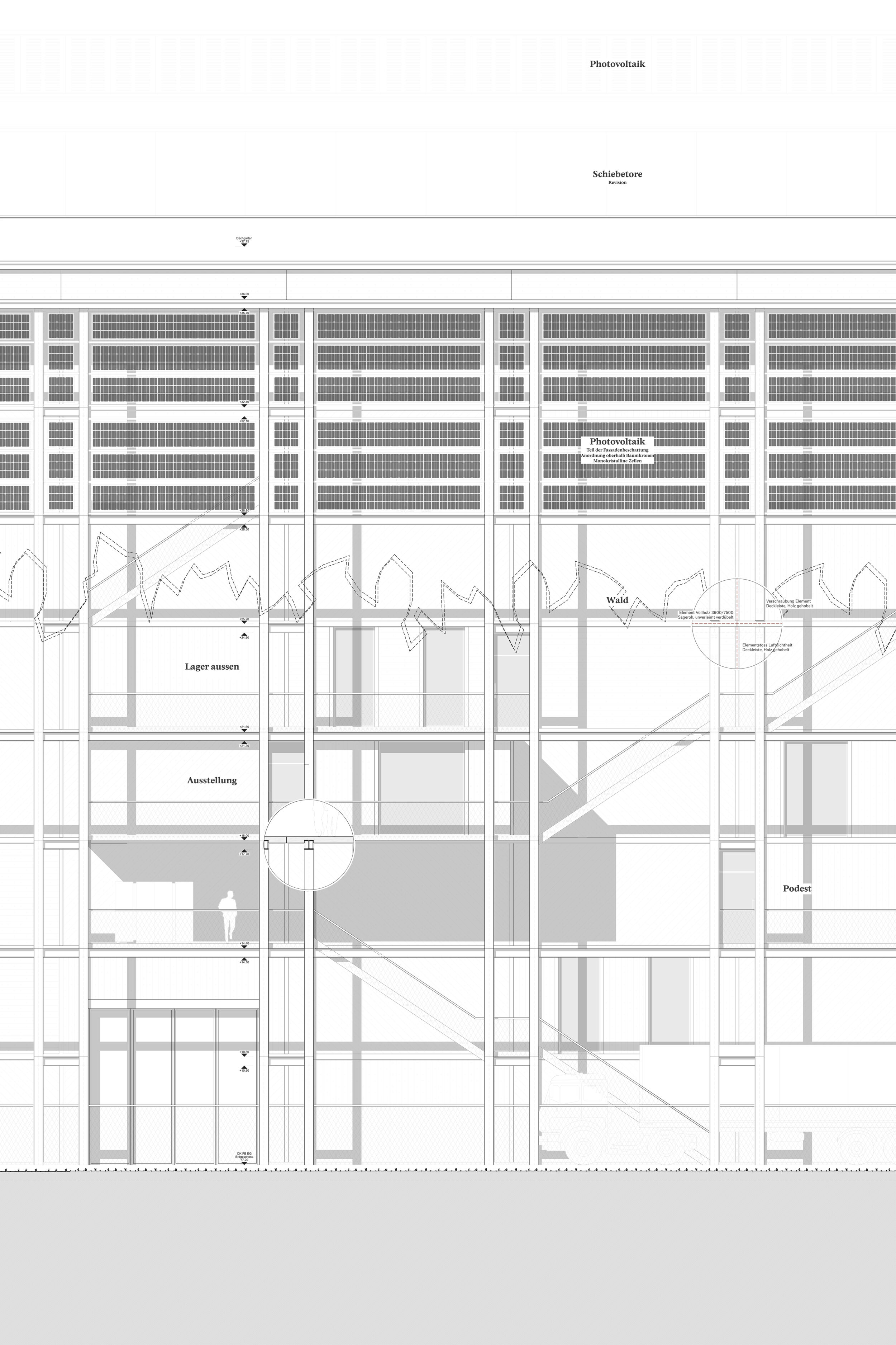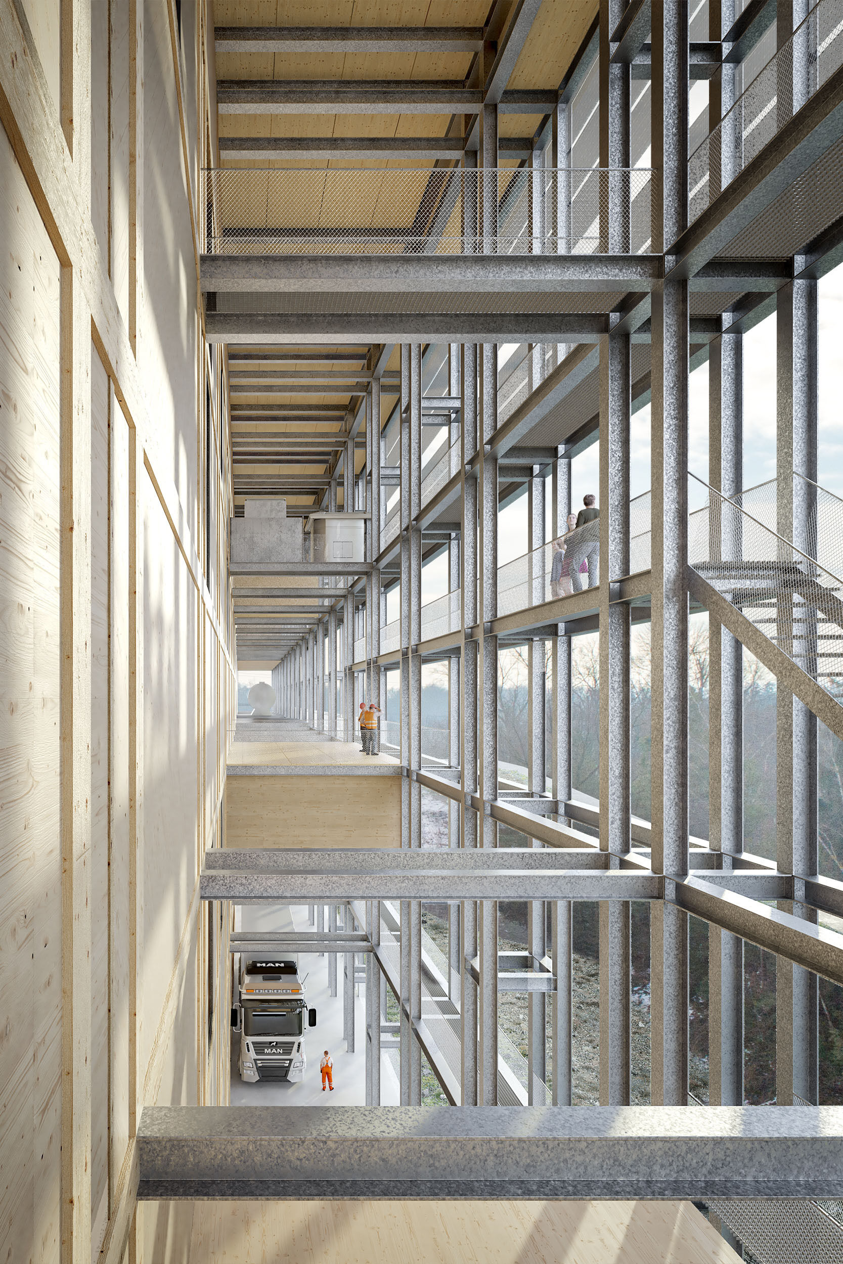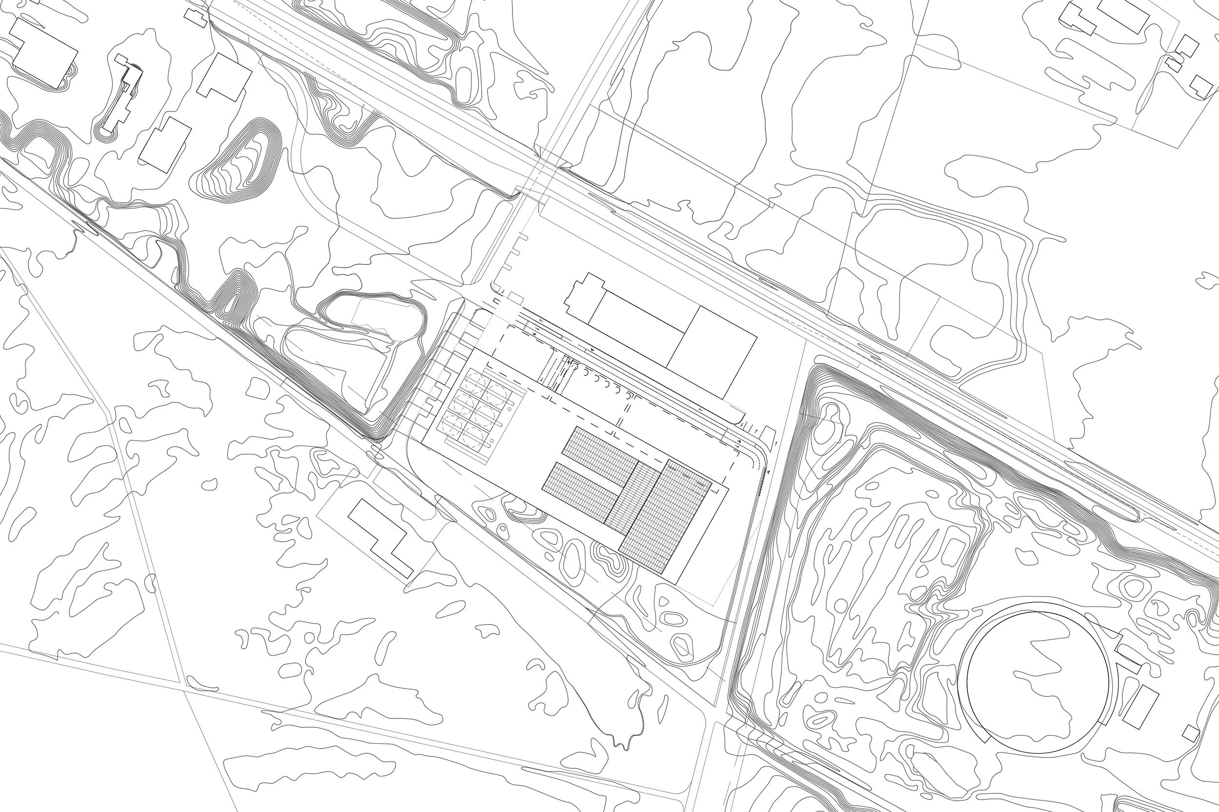 Die Studie für die neue Thurgauer Kehrrichtverbrennungsanlage im ehemaligen Kiesabbaugebiet von Weinfelden schlägt ein planerisches System vor, das die betrieblichen Anforderungen und die geforderten Bauvolumina in einen nachhaltigen Zusammenhang mit den landschaftsräumlichen und ökologischen Ansprüchen bringt. Dafür wird das Areal begrenzt und innerhalb des Bezirks unter Einbezug des Bestands eine räumliche Grundstruktur vorgeschlagen, die flexibel auf die technologischen Unsicherheiten und Etappierungen reagieren kann. Das Tragwerk ist über raumhaltige und selbstaussteifende Stahlpfeiler aufgebaut, sodass in modularen Schritten geplant und gebaut werden kann. Die Spannweiten werden möglichst eng gehalten und nur dort Ressourcen eingesetzt, wo diese auch wirklich gebraucht werden. Mit einer raumhaltigen Fassadenschicht, die der Erschliessung der Platzierung der Aussenaggregate dient, wird die Massivität der exorbitanten Volumina gebrochen und die Anlage auf kultivierte Weise in die Waldlandschaft eingebaut. Das hybride Bausystem zielt ausserhalb des Verbrennungsbunkers auf den konsequenten Einsatz von lokalen Bauweisen. Das Stahlgerüst der ungedämmten Halle wird mit Thurgauer Vollholz verkleidet. Wo es der Brandschutz erfordert, wird das Gerüst mit Lehmbausteinen ausgemauert. Die Dachfläche wird begrünt und auch für Besucher zugänglich gemacht. Die Energiezentrale des Kantons Thurgau wird damit zu einem Vorzeigeobjekt des zukünftigen Ökologiezeitalters.