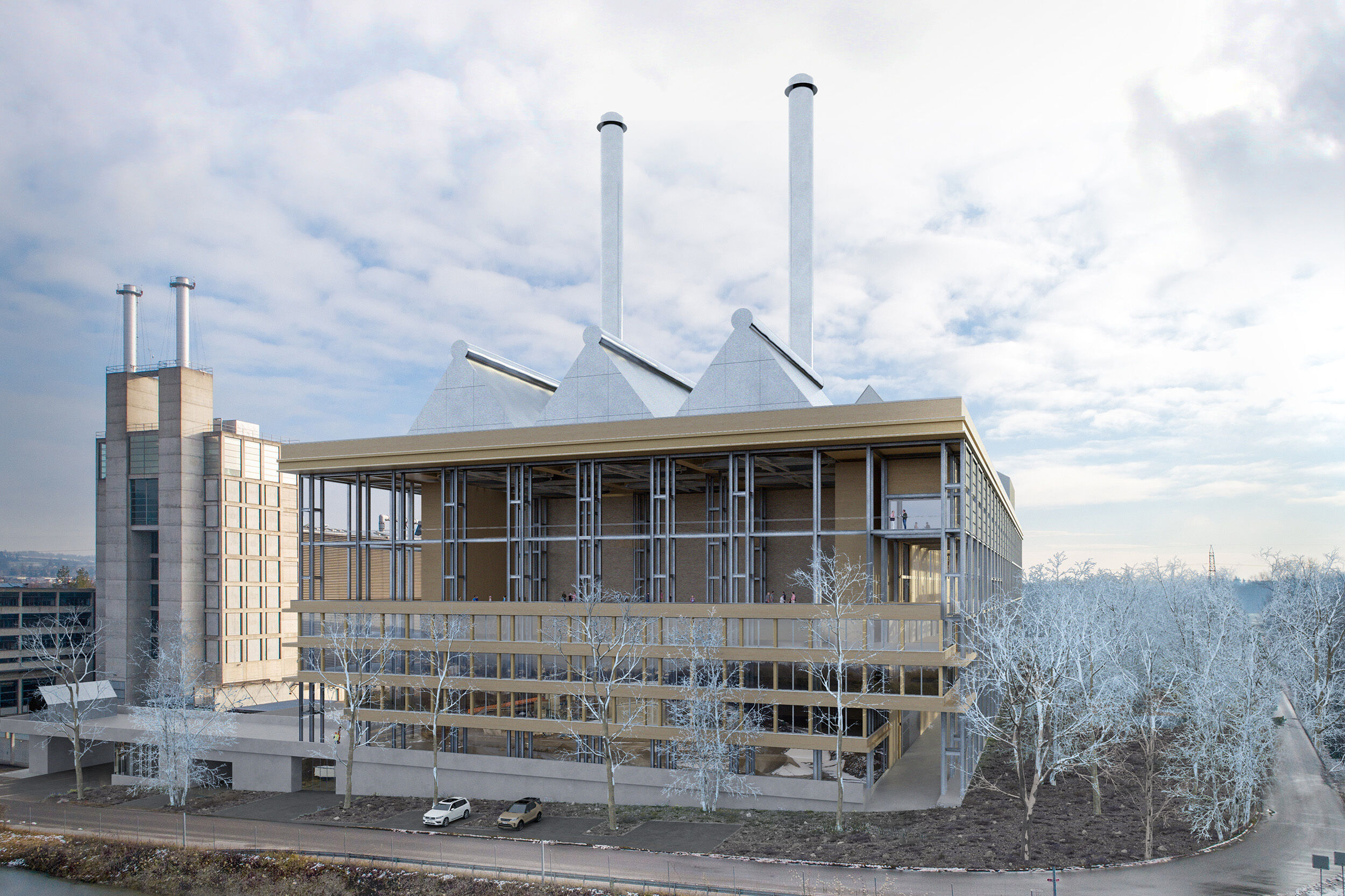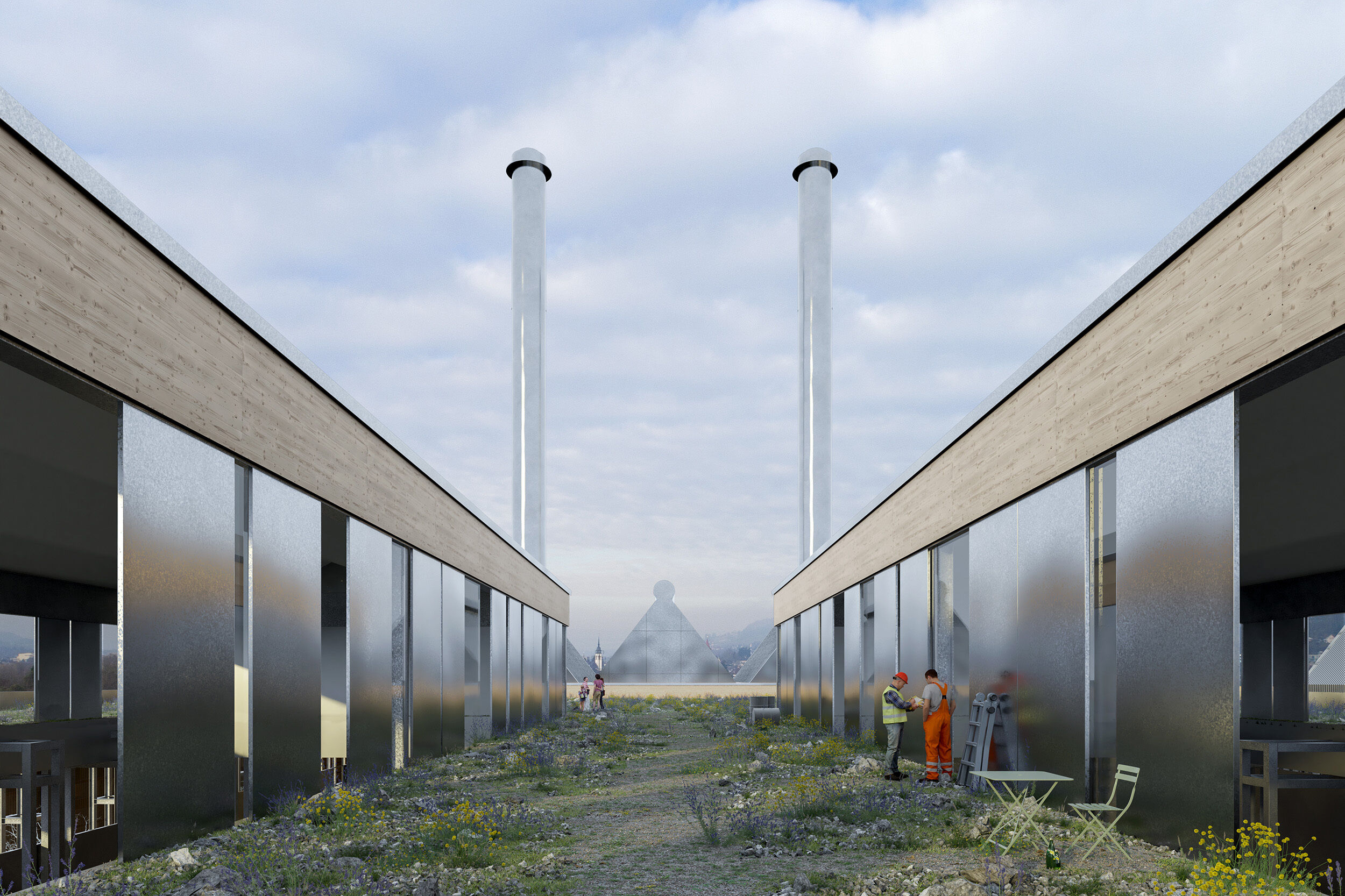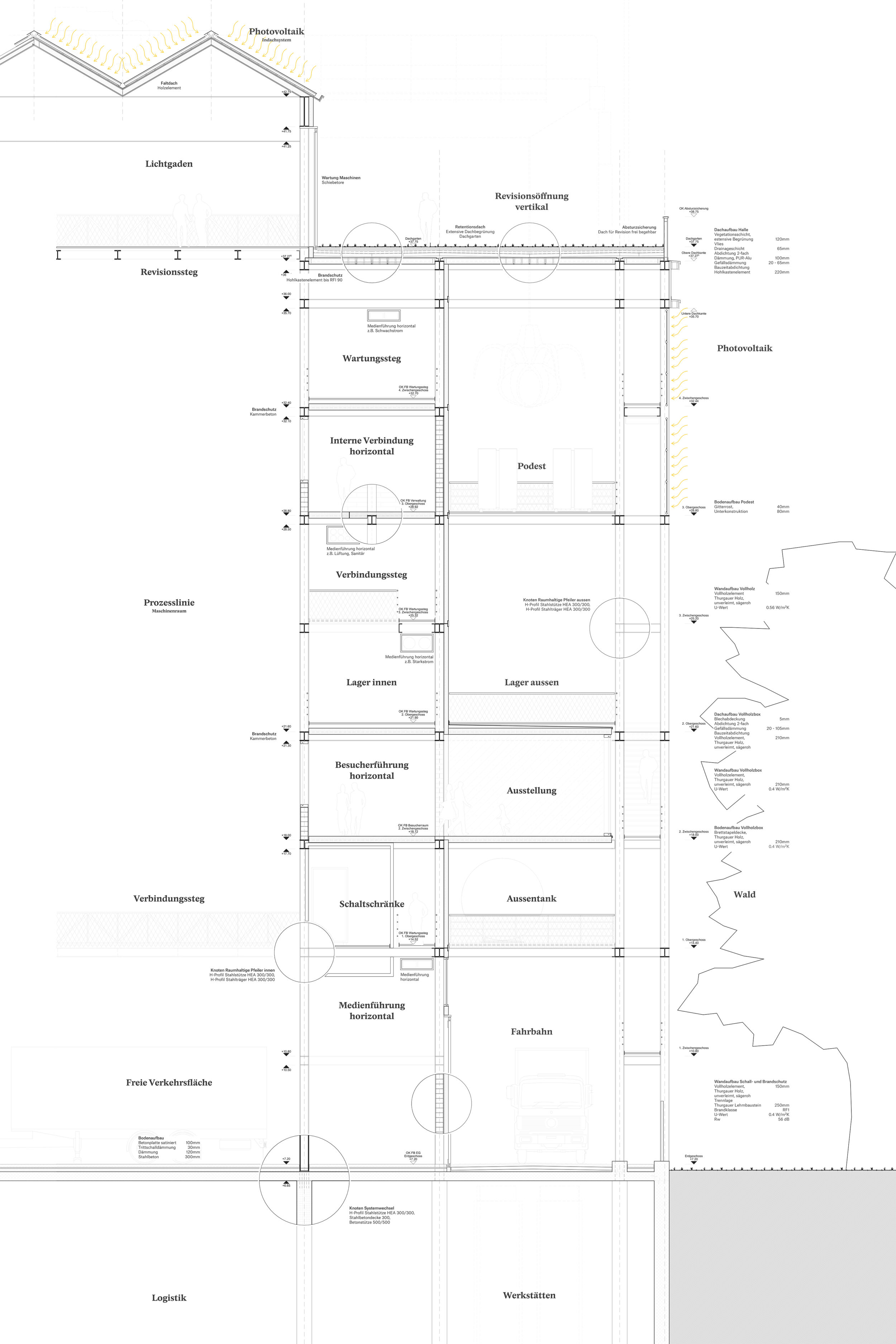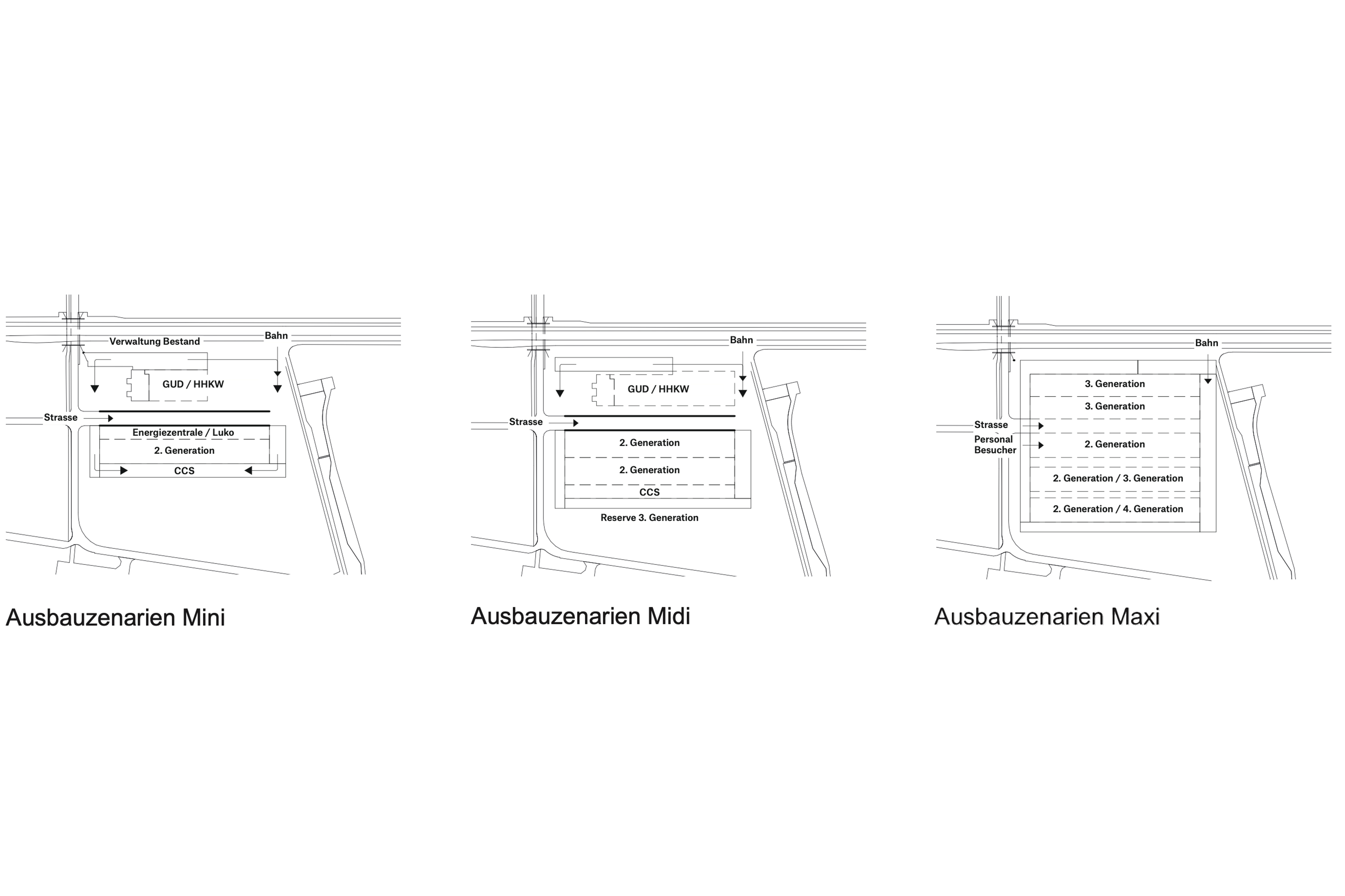 Die Studie für die neue Thurgauer Kehrrichtverbrennungsanlage im ehemaligen Kiesabbaugebiet von Weinfelden schlägt ein planerisches System vor, das die betrieblichen Anforderungen und die geforderten Bauvolumina in einen nachhaltigen Zusammenhang mit den landschaftsräumlichen und ökologischen Ansprüchen bringt. Dafür wird das Areal begrenzt und innerhalb des Bezirks unter Einbezug des Bestands eine räumliche Grundstruktur vorgeschlagen, die flexibel auf die technologischen Unsicherheiten und Etappierungen reagieren kann. Das Tragwerk ist über raumhaltige und selbstaussteifende Stahlpfeiler aufgebaut, sodass in modularen Schritten geplant und gebaut werden kann. Die Spannweiten werden möglichst eng gehalten und nur dort Ressourcen eingesetzt, wo diese auch wirklich gebraucht werden. Mit einer raumhaltigen Fassadenschicht, die der Erschliessung der Platzierung der Aussenaggregate dient, wird die Massivität der exorbitanten Volumina gebrochen und die Anlage auf kultivierte Weise in die Waldlandschaft eingebaut. Das hybride Bausystem zielt ausserhalb des Verbrennungsbunkers auf den konsequenten Einsatz von lokalen Bauweisen. Das Stahlgerüst der ungedämmten Halle wird mit Thurgauer Vollholz verkleidet. Wo es der Brandschutz erfordert, wird das Gerüst mit Lehmbausteinen ausgemauert. Die Dachfläche wird begrünt und auch für Besucher zugänglich gemacht. Die Energiezentrale des Kantons Thurgau wird damit zu einem Vorzeigeobjekt des zukünftigen Ökologiezeitalters.