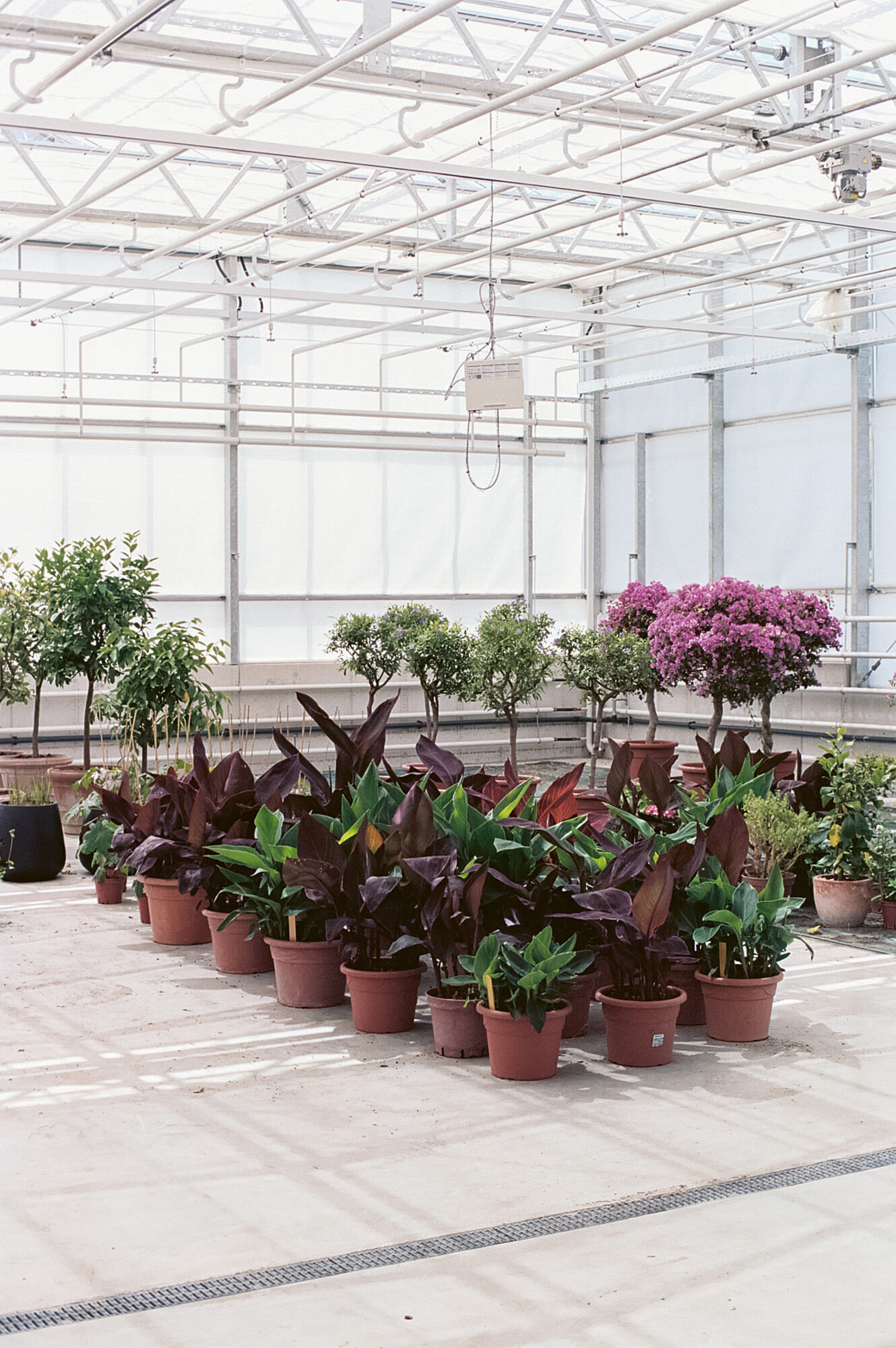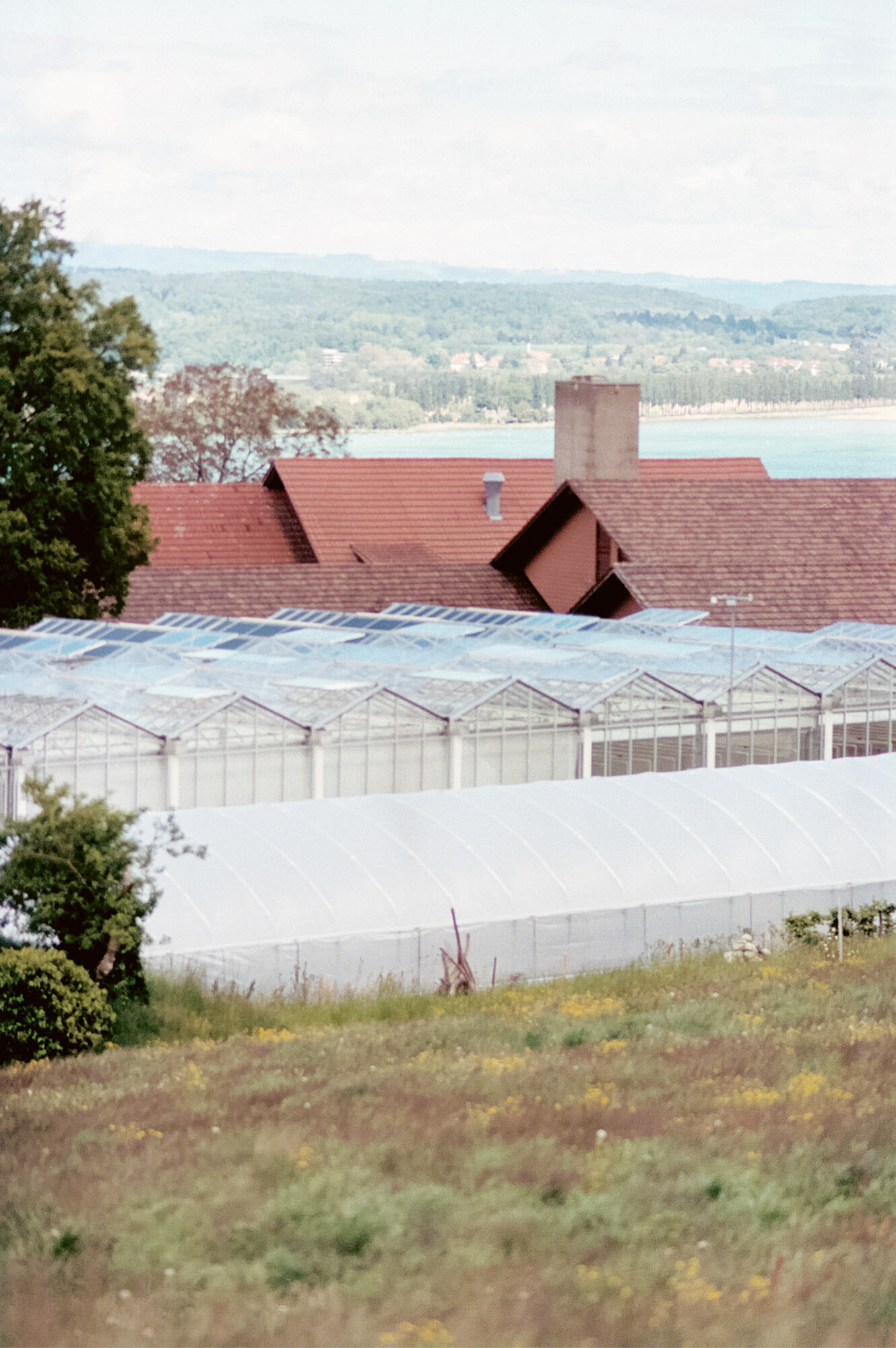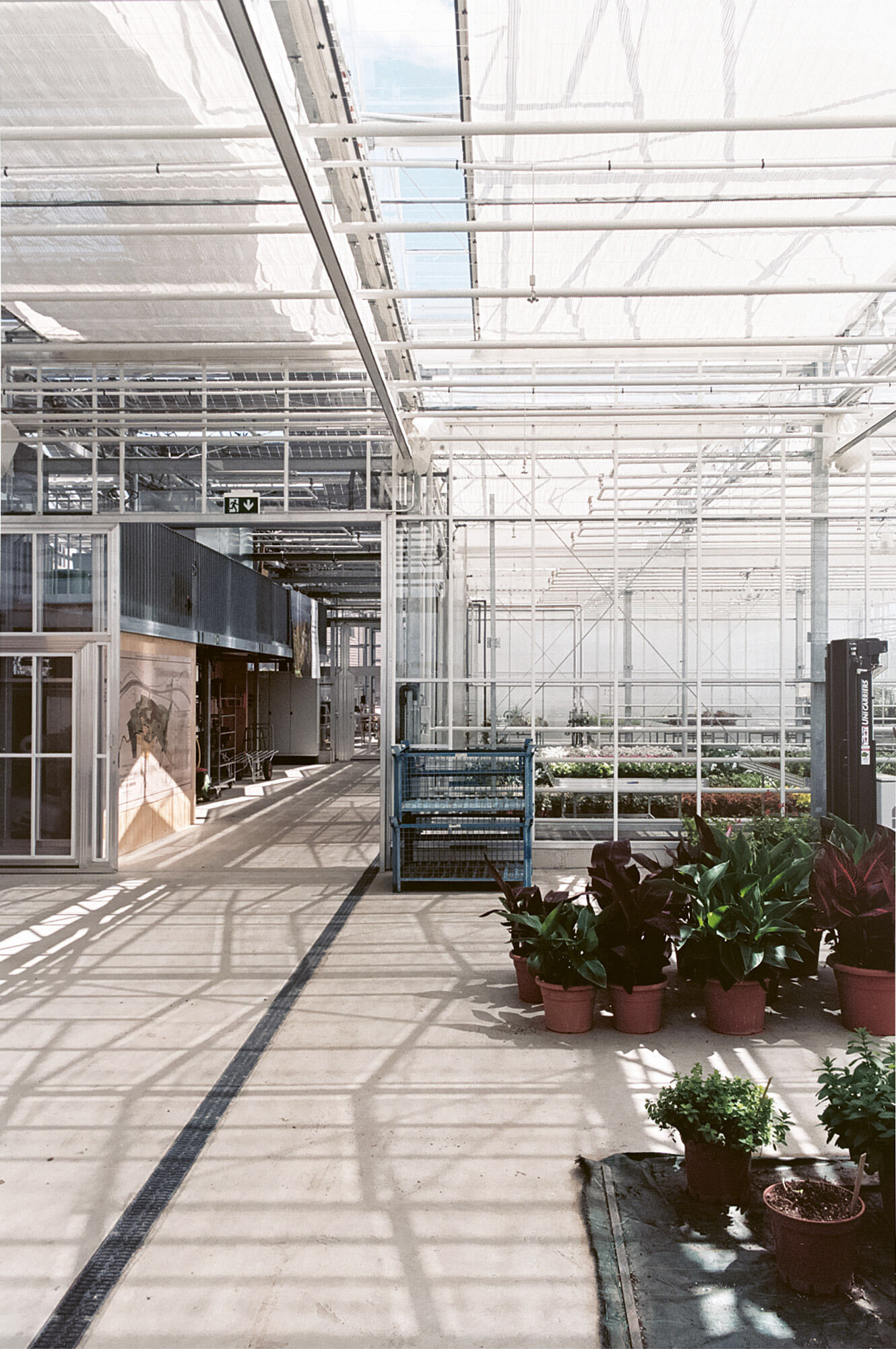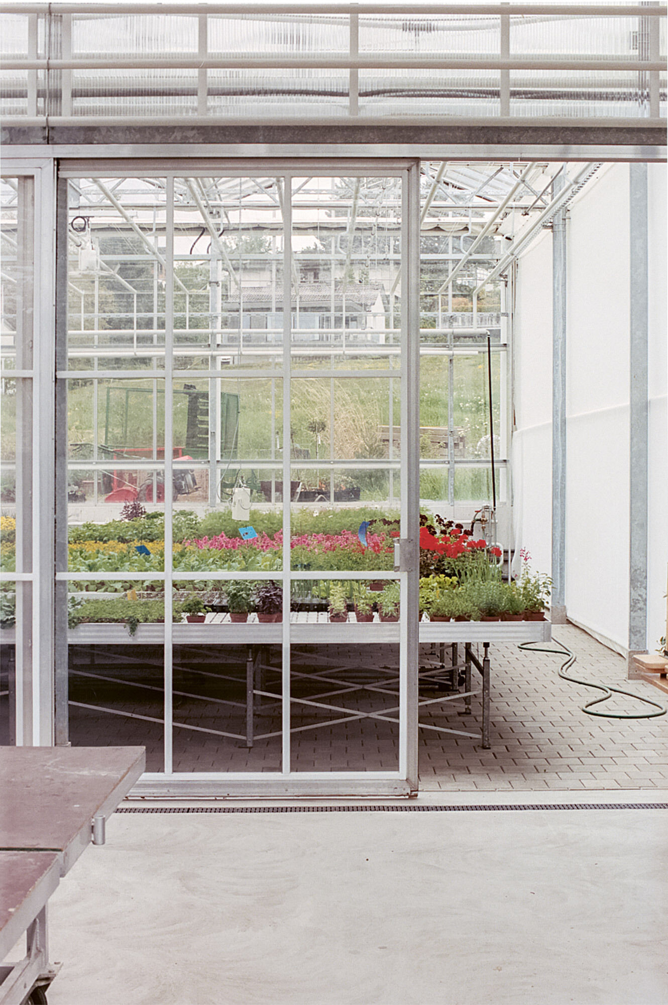 Die Gärtnerei auf dem Arenenberg ist eine Ausbildungshalle für zukünftige Landwirte und weitere Berufsgattungen. Zudem werden hier die Pflanzungen für das Schloss- und Gutshofareal kultiviert. Das Wettbewerbsprojekt sah eine spezifische Werkhof- und Gewächshausarchitektur vor. Aus politischen Gründen war dann aber ein preisgünstigerer Bau gefordert, der dem Bild der Ökonomie im Gemüsebau eher entspricht. So wurde ein importiertes Gewächshaussystem an die Topografie und an die Nutzungen angepasst. Das Dach ist mit Verbundglas gesichert, die Verschattung über der Ausbildungszone erfolgt mit Solarpaneelen. Die Halle ist in kleine Nutzungseinheiten mit unterschiedlichen Temperaturzonen für die jeweiligen Ausbildungseinheiten unterteilt. Die Orangerie dient auch als Eventraum.