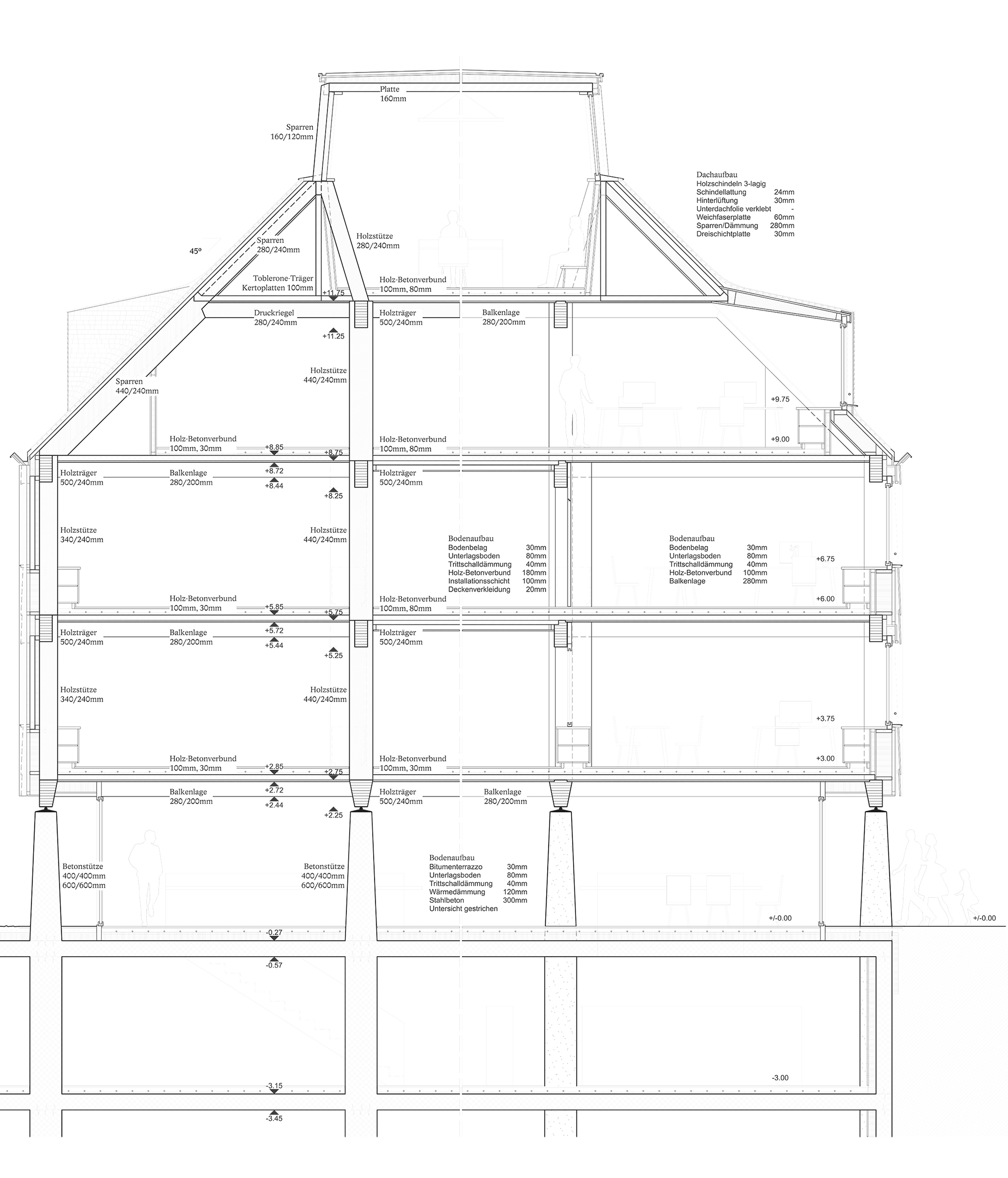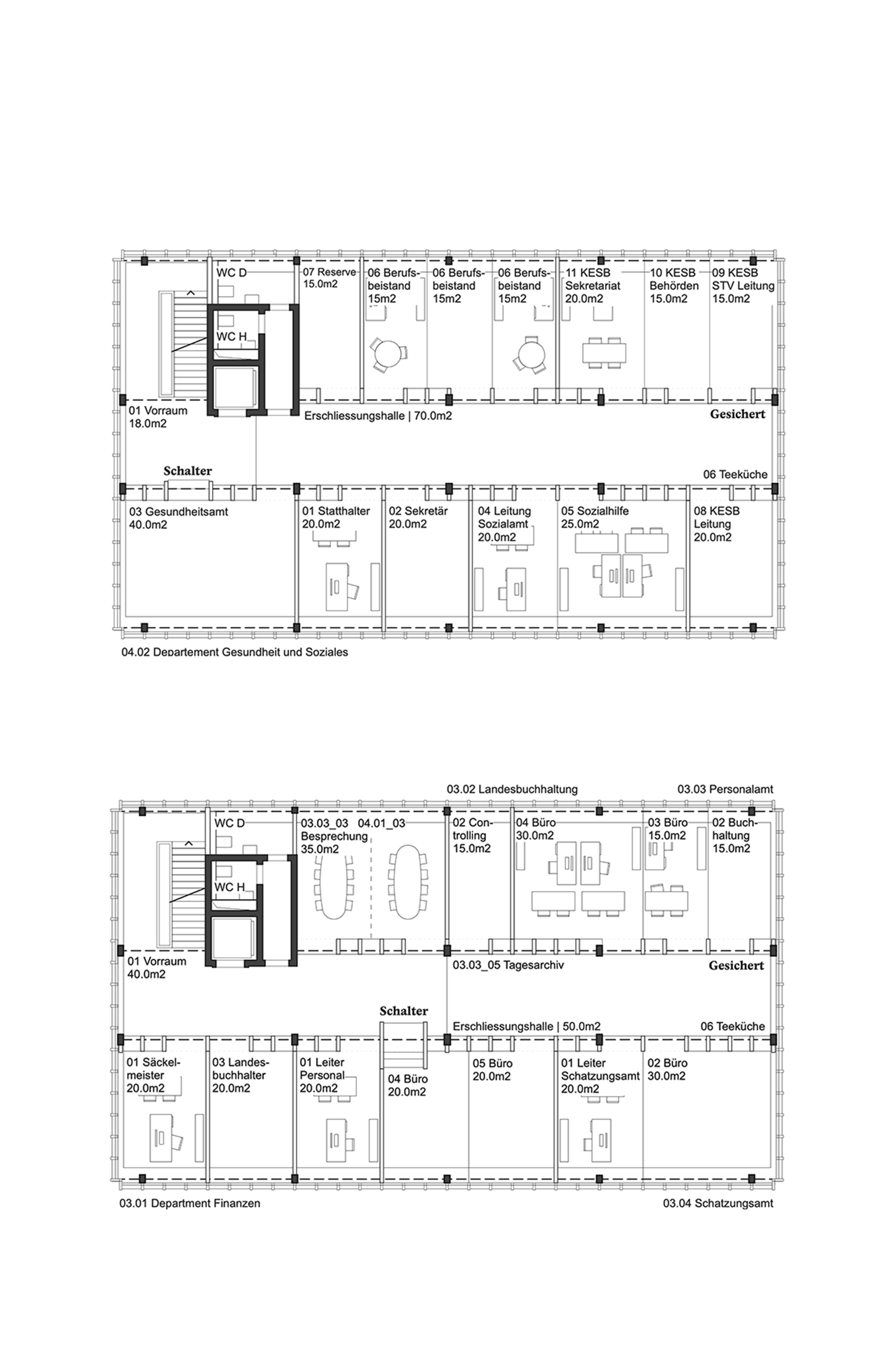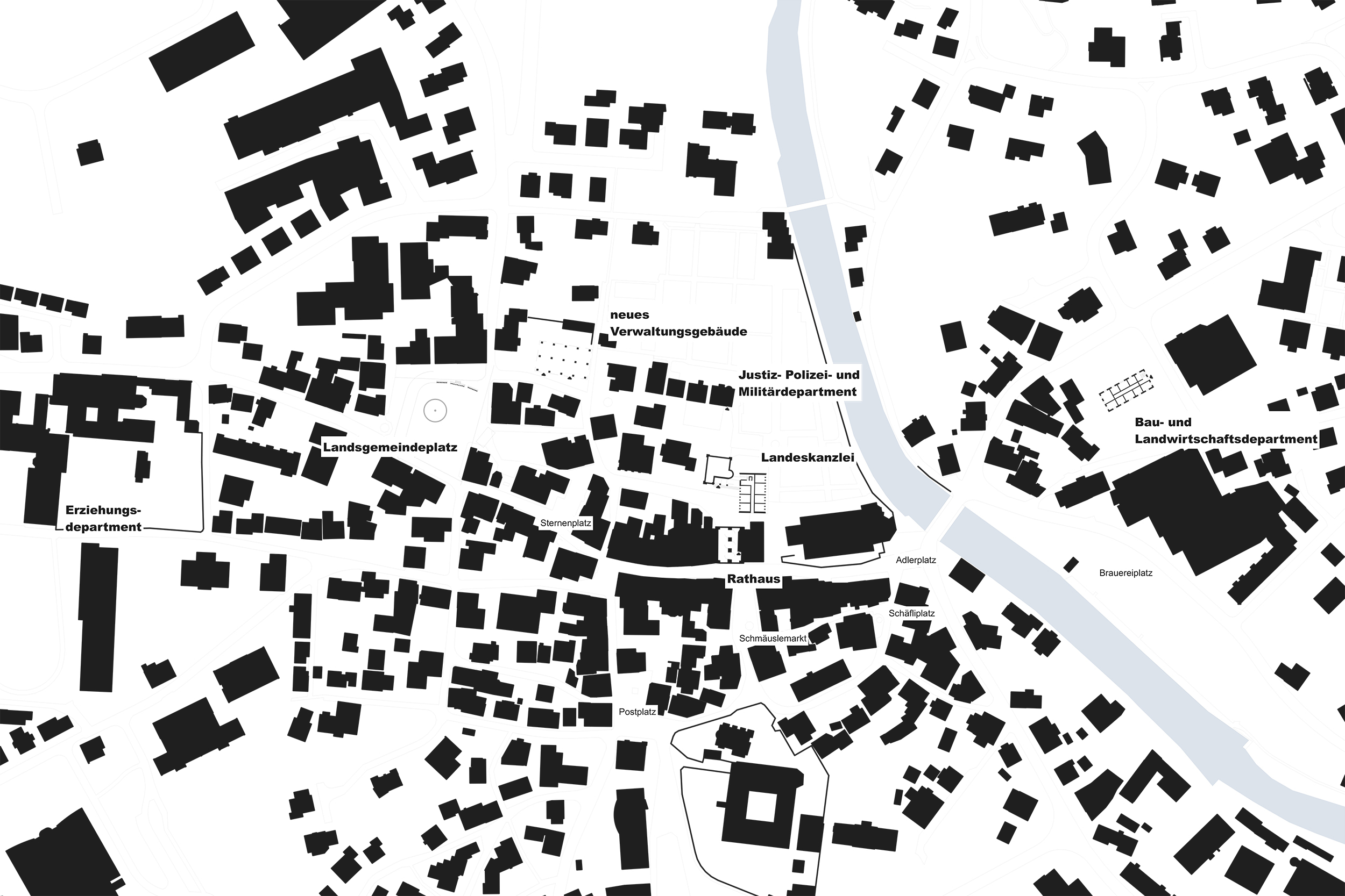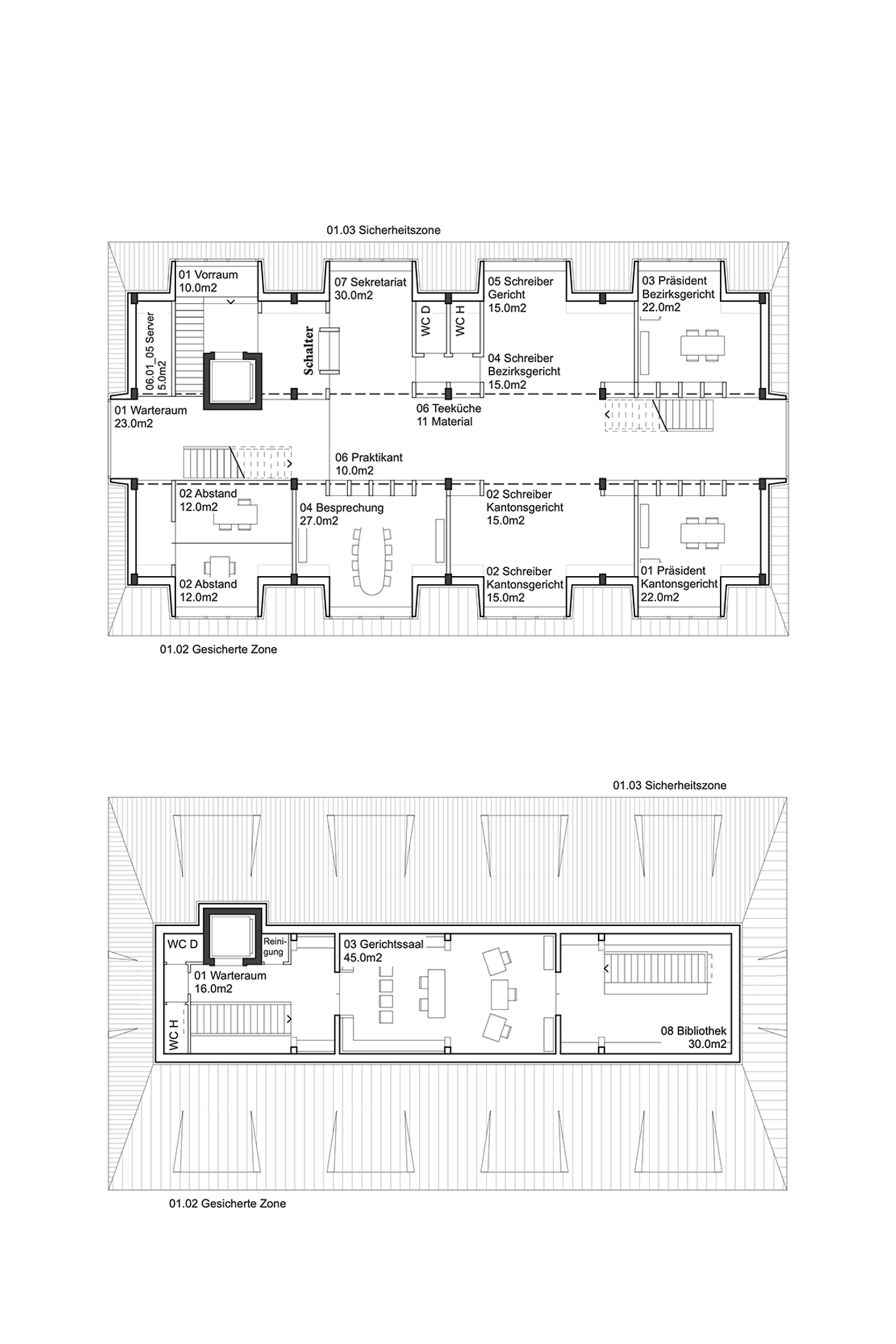 Das neue Verwaltungs- und Gerichtsgebäude in Appenzell ist ein Holzbaukörper, der auf dem offenen und steinig gehaltenen Erdgeschoss liegt. Dieses vermittelt als steinerne Säulenhalle mit Holzdecke zwischen dem Landesarchiv im mehrgeschossigen Keller und den Holzhäusern am Landsgemeindeplatz. Die Holzbaustruktur formuliert einen offenen und vielseitig adaptierbaren Verwaltungsbautypus, der mit einem breiten Mittelkorridor auch eine Kommunikationszone bereitstellt. Die Hauptnutzflächen entlang der Fassade sind mit einem kleinen Rastermass für flexible Raumeinteilungen rhythmisiert. Die Balkendecken nehmen diesen Rhythmus auf, sodass viel Abwicklung für die Wärmespeicherung aufgebaut werden kann. In der Fassade entsteht so das in Appenzell weit verbreitete gotische Fensterband. Das mit Holzschindeln eingekleidete Dach unterstützt mit seiner abgewalmten Sonderform den öffentlichen Charakter des Gerichts und bereichert als Haus in der zweiten Reihe die Silhouette des Landsgemeindeplatzes.
