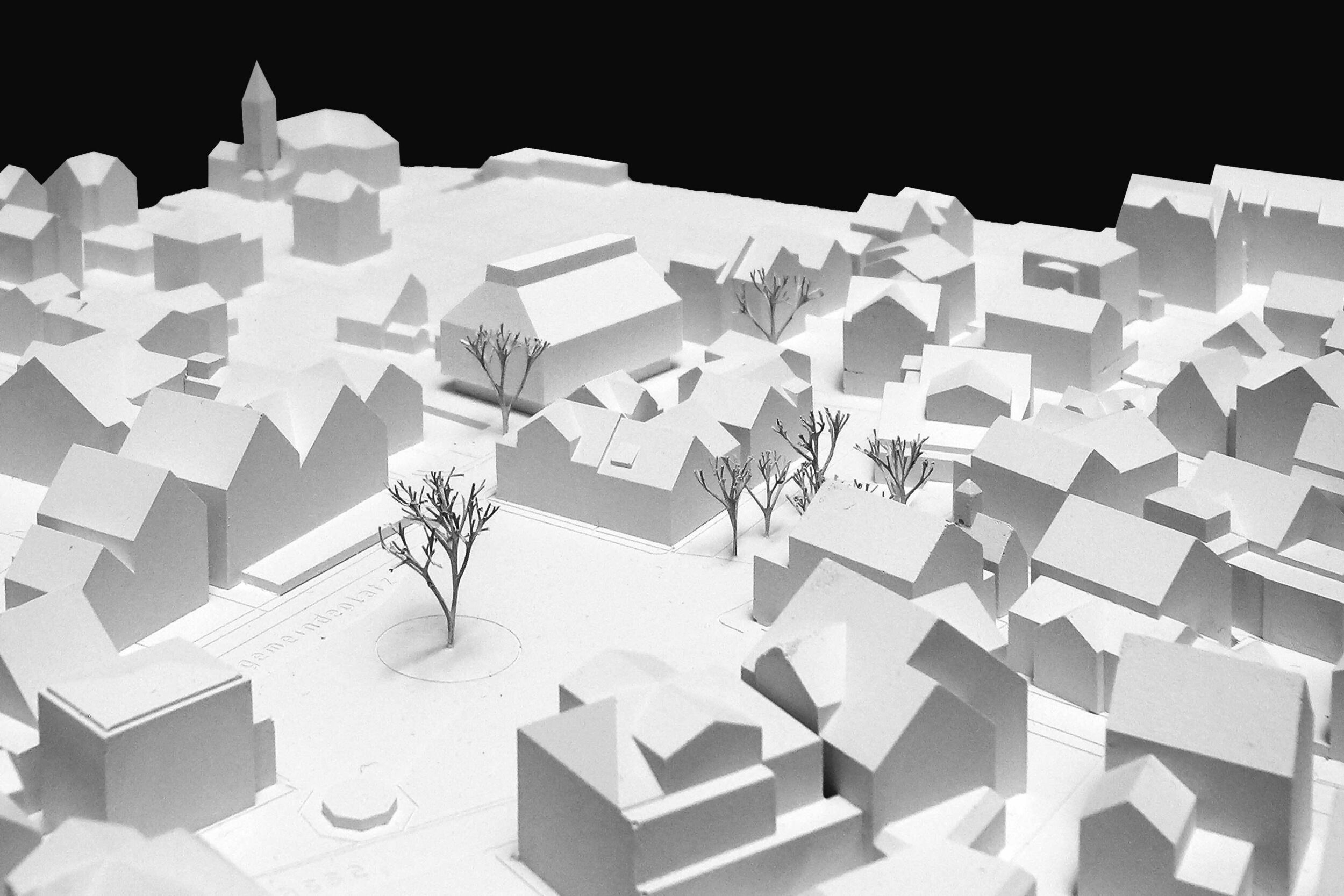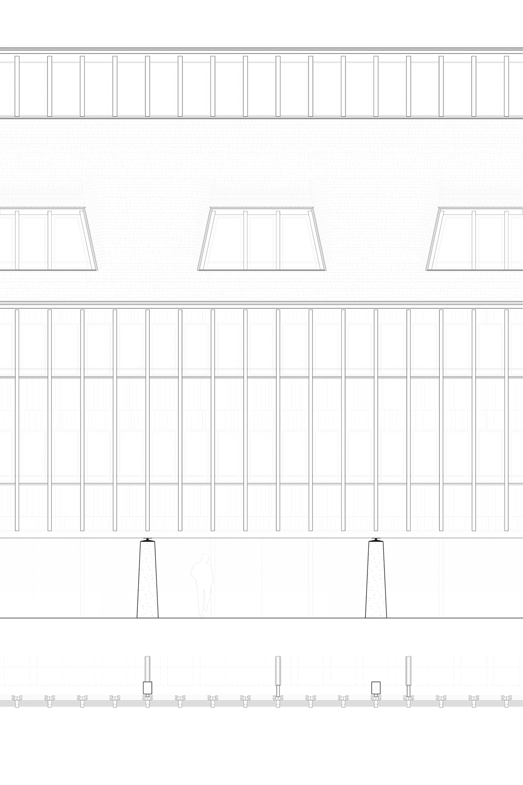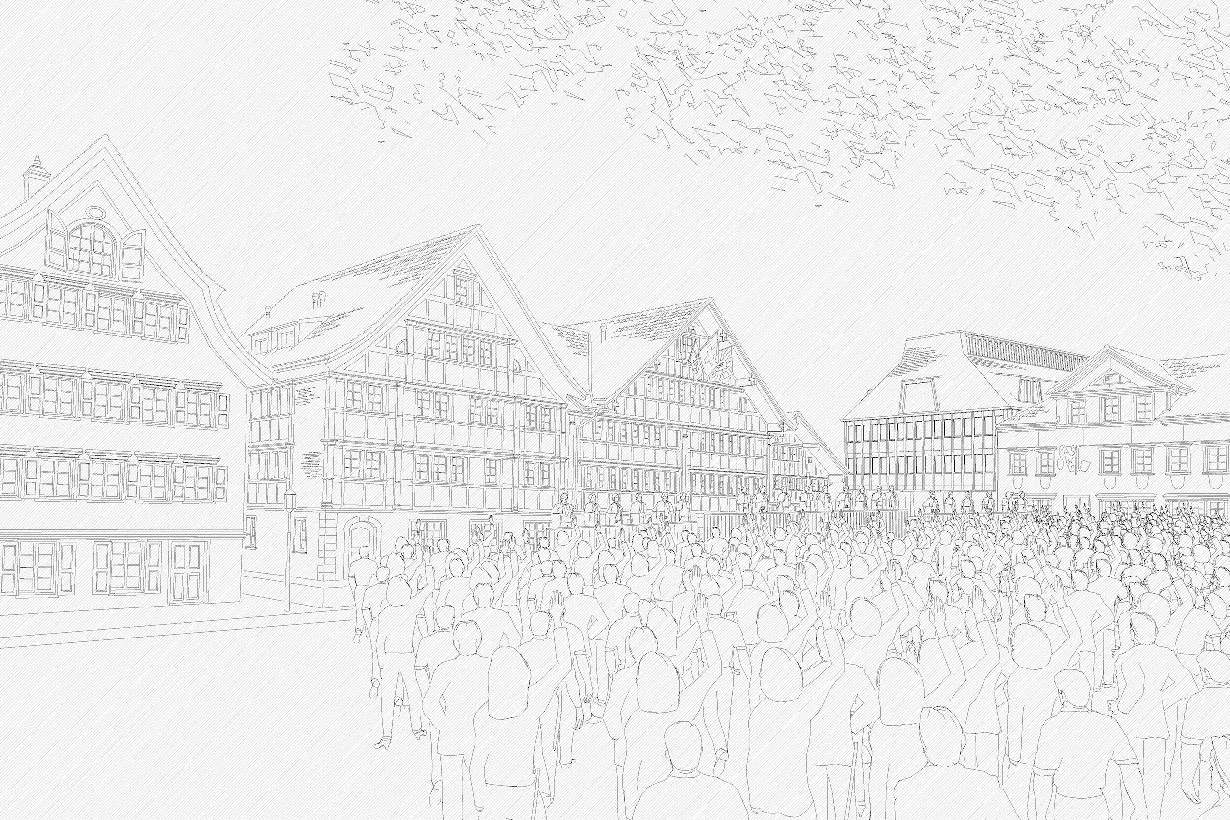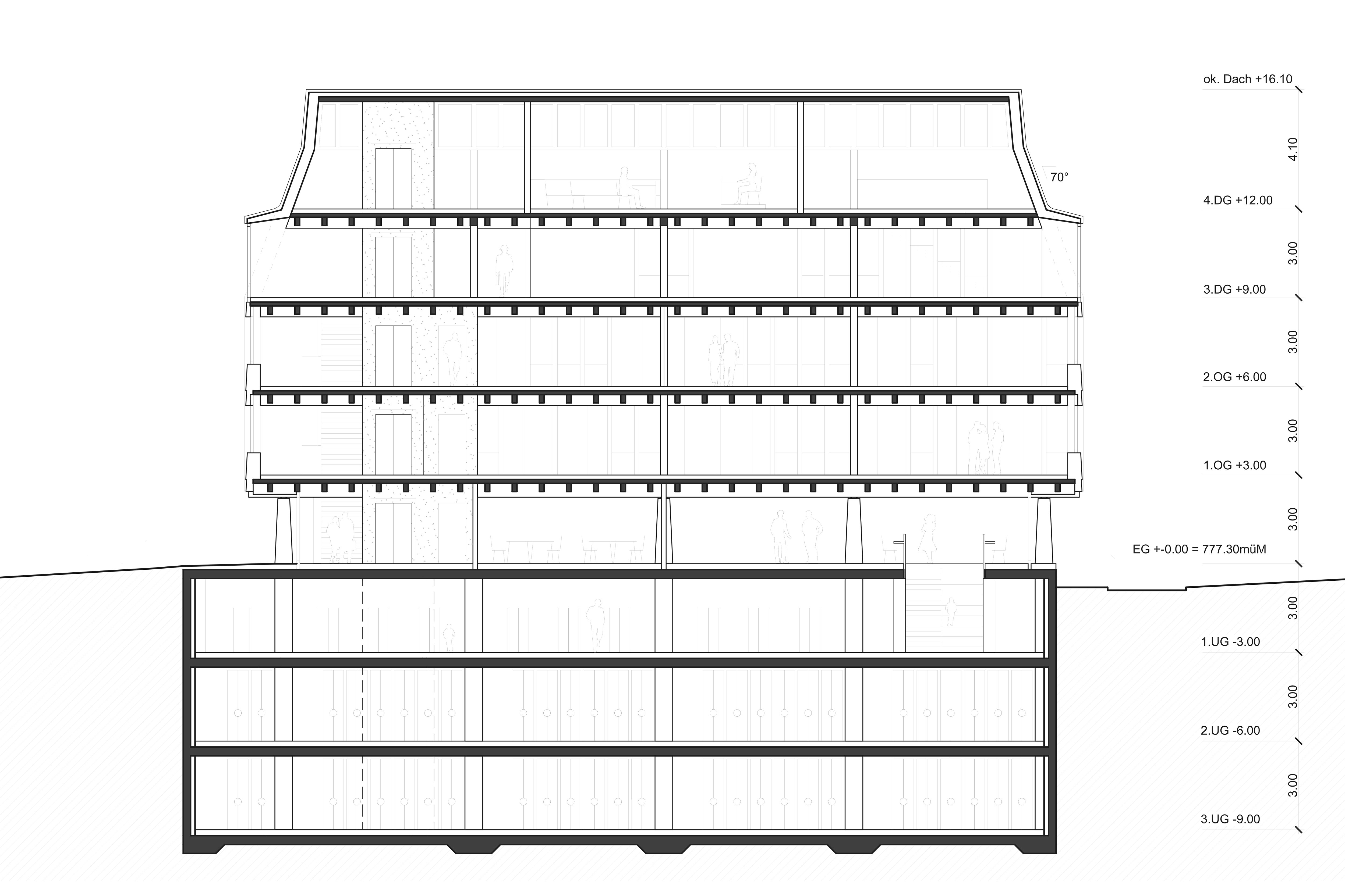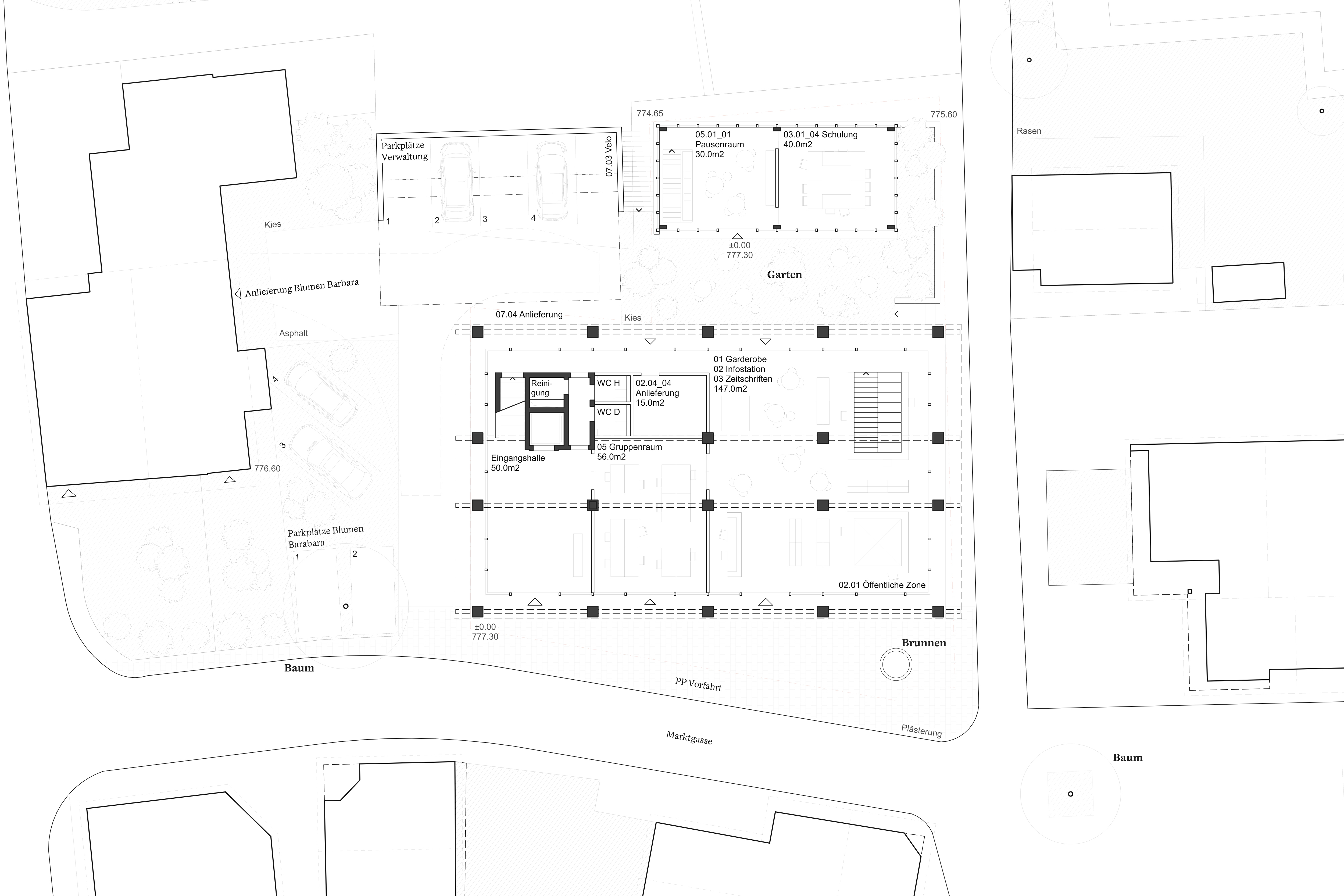 Das neue Verwaltungs- und Gerichtsgebäude in Appenzell ist ein Holzbaukörper, der auf dem offenen und steinig gehaltenen Erdgeschoss liegt. Dieses vermittelt als steinerne Säulenhalle mit Holzdecke zwischen dem Landesarchiv im mehrgeschossigen Keller und den Holzhäusern am Landsgemeindeplatz. Die Holzbaustruktur formuliert einen offenen und vielseitig adaptierbaren Verwaltungsbautypus, der mit einem breiten Mittelkorridor auch eine Kommunikationszone bereitstellt. Die Hauptnutzflächen entlang der Fassade sind mit einem kleinen Rastermass für flexible Raumeinteilungen rhythmisiert. Die Balkendecken nehmen diesen Rhythmus auf, sodass viel Abwicklung für die Wärmespeicherung aufgebaut werden kann. In der Fassade entsteht so das in Appenzell weit verbreitete gotische Fensterband. Das mit Holzschindeln eingekleidete Dach unterstützt mit seiner abgewalmten Sonderform den öffentlichen Charakter des Gerichts und bereichert als Haus in der zweiten Reihe die Silhouette des Landsgemeindeplatzes.