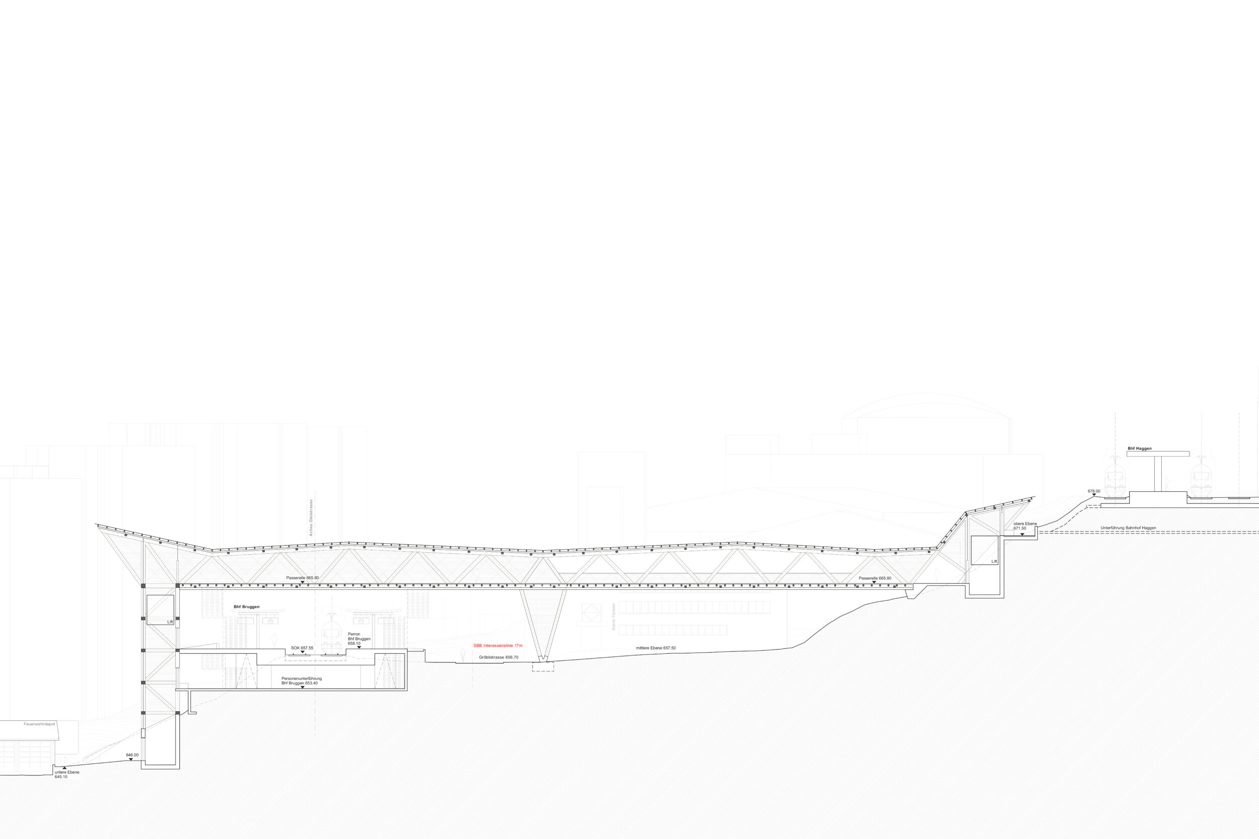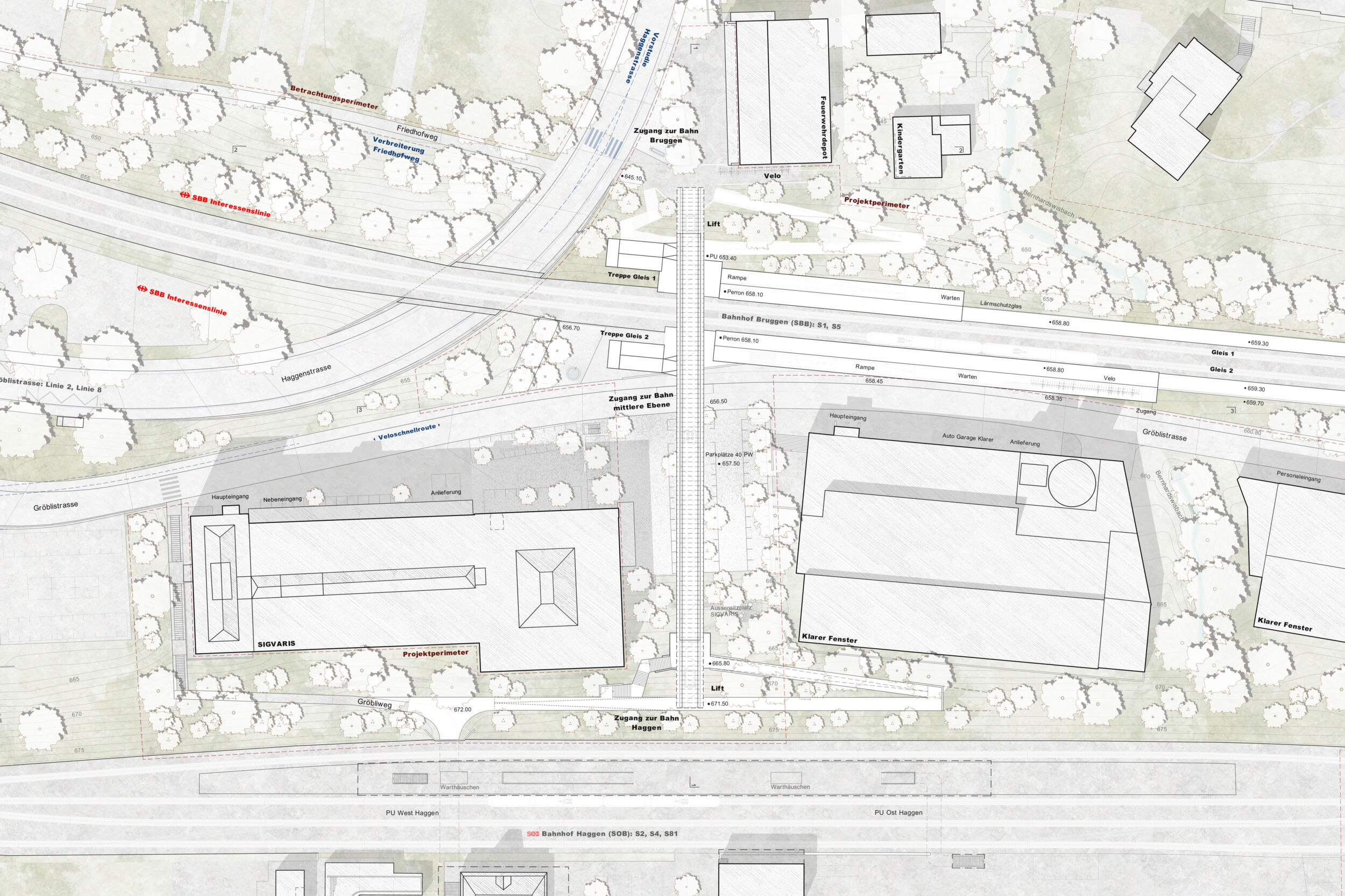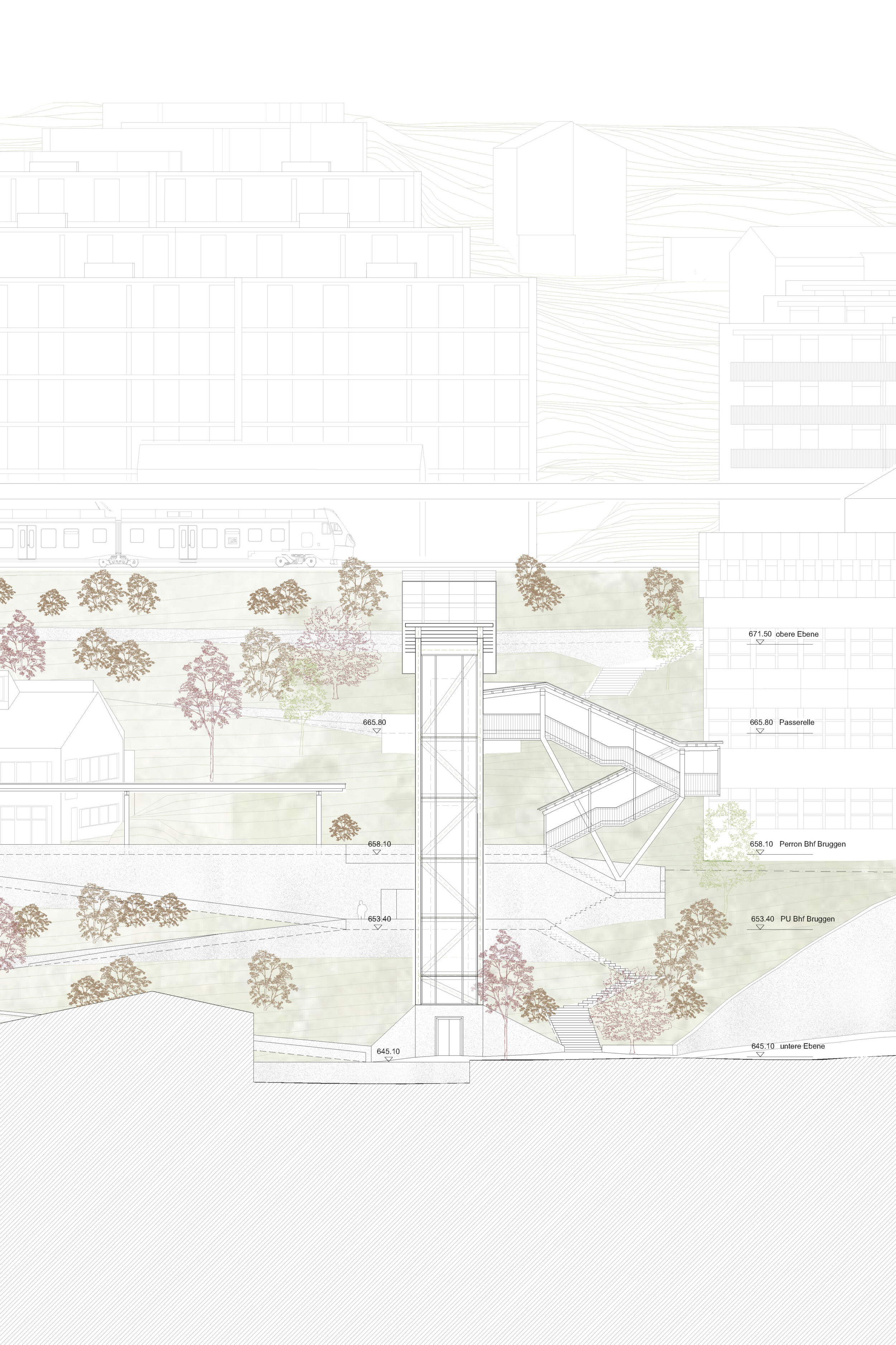 Das Projekt für die Verbindung der beiden Bahnhöfe Haggen und Bruggen artikuliert sich als effiziente Bahnhofpasserelle. Die neue Fussgängerinfrastruktur ermöglicht dank der mittleren Höhenlage direkte Treppenverbindungen zu den beiden Perrons des neuen Bahnhofs Bruggen. So erhalten die Umsteigenden eine einfache Orientierung und das Quartier eine klare Identität.