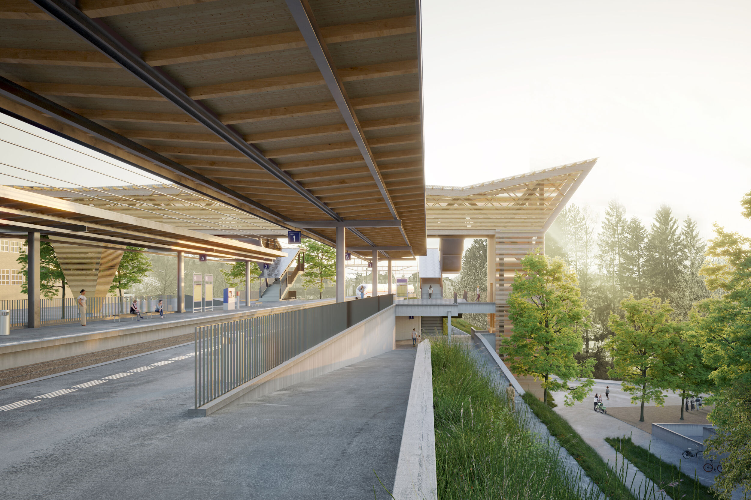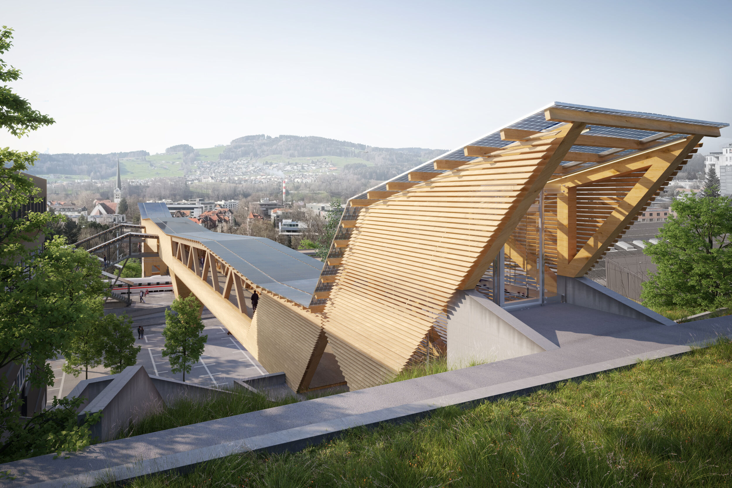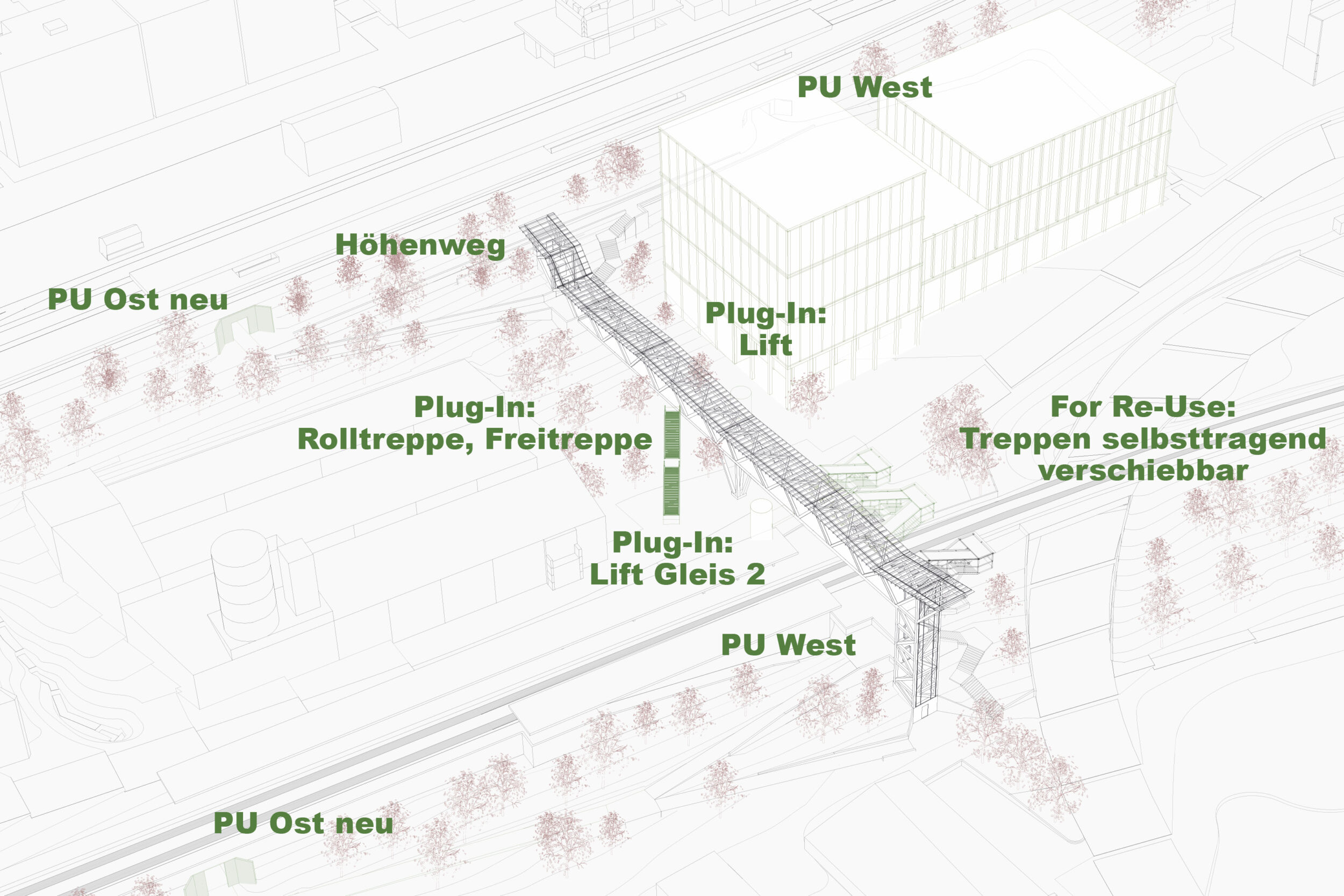 Die neue Passerelle ist ein raumhaltiges Holzbauwerk mit drei Auflagerpunkten. Ein lichtdurchlässiges Solardach schützt dabei das Holzwerk. Das Tragwerk ist mit den drei Auflagerpunkten auf die Kernfunktion der Passerelle ausgelegt, womit es effizient dimensioniert werden kann. Die klare Basistypologie kann je nach bahntechnischer und urbanistischer Entwicklung mit zusätzlichen Erschliessungselementen (Lift, Rolltreppe, Treppen als «Plug-Ins») ausgebaut werden. Die neuen Platzgestaltungen nehmen mit klaren Kanten und Formen Bezug auf die Infrastrukturbauten. Dabei wird die Vegetation zur Raumbildung eingesetzt. In den Hangböschungen prägt neu ein artenreiches Grün mit diversen gruppierten und losen Gehölzen die abfallende Topografie. Dieses greift auch nach Osten und Westen aus.