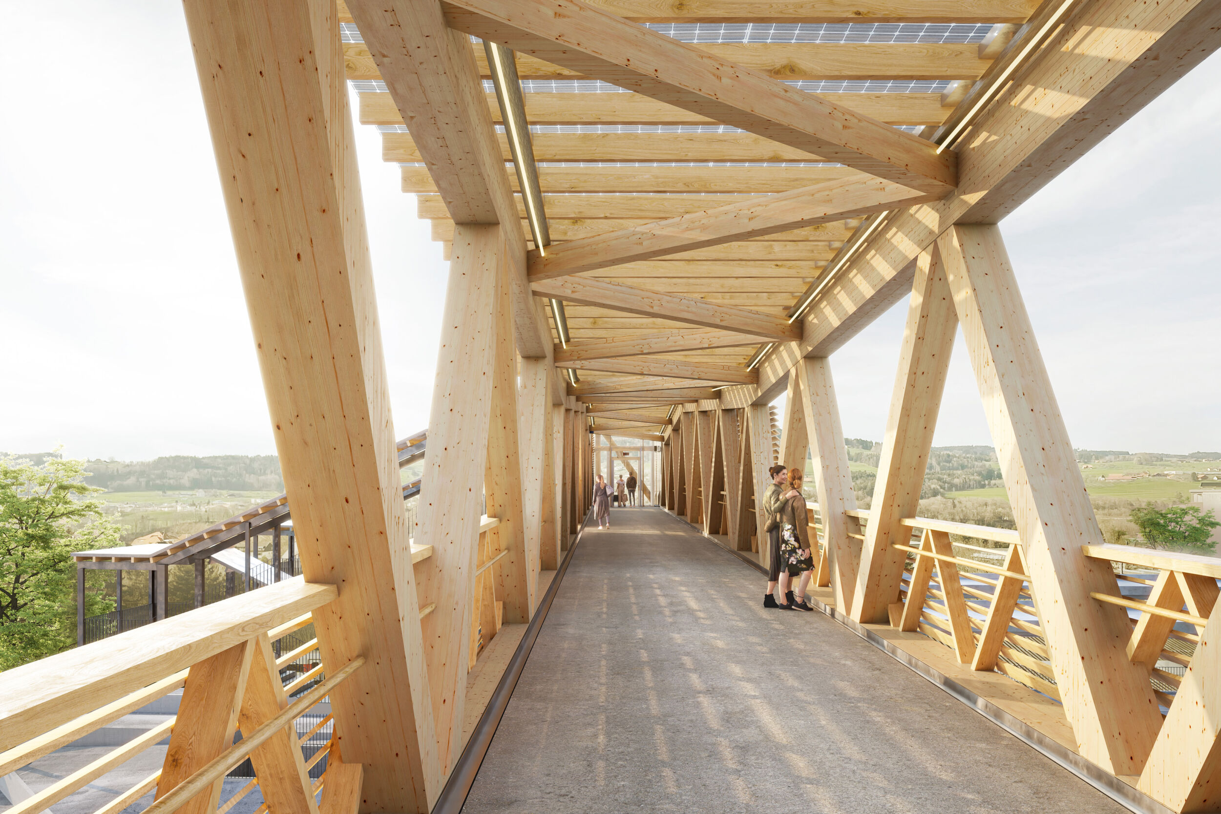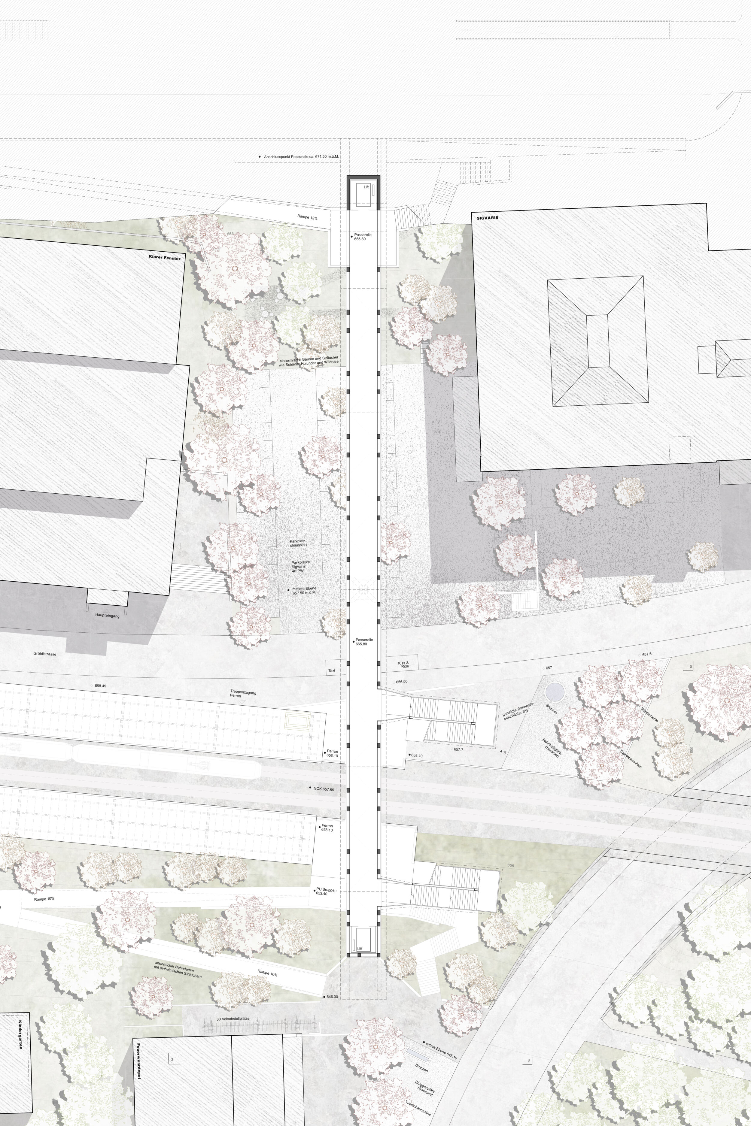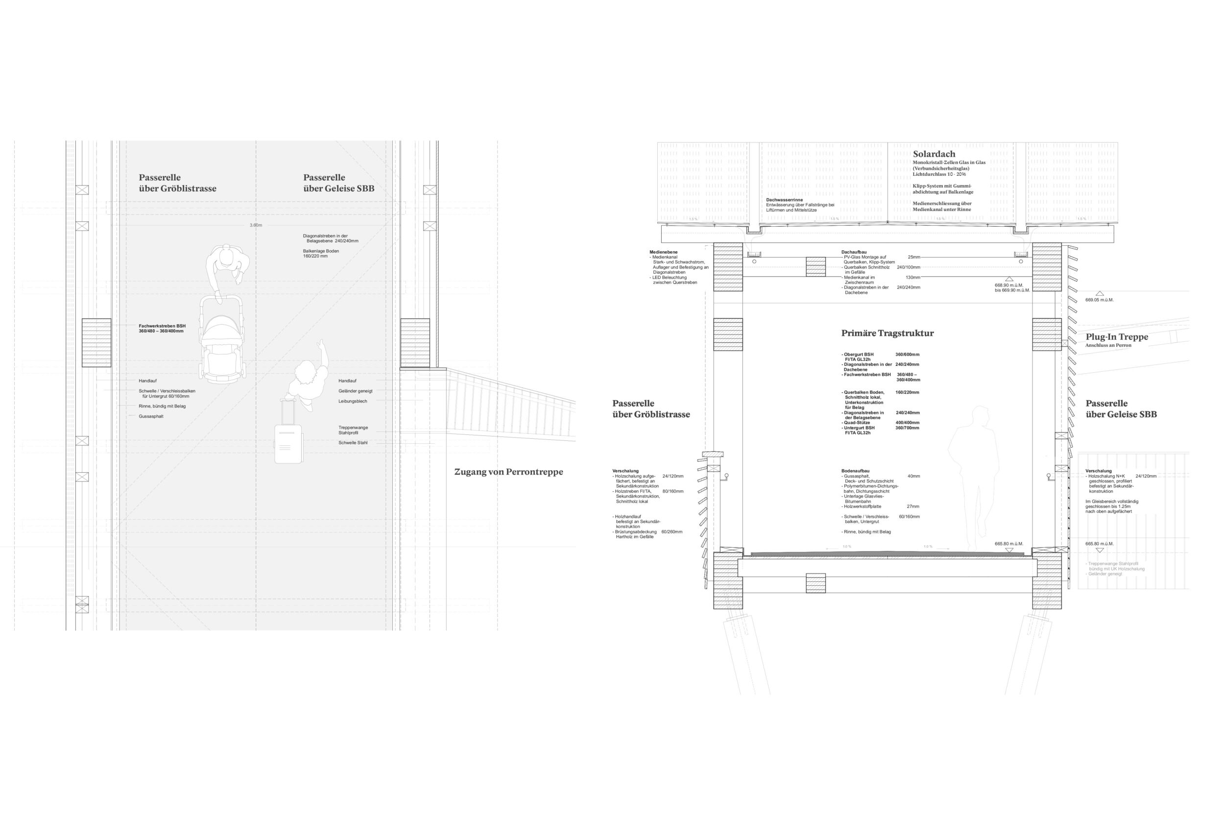 Die neue Passerelle ist ein raumhaltiges Holzbauwerk mit drei Auflagerpunkten. Ein lichtdurchlässiges Solardach schützt dabei das Holzwerk. Das Tragwerk ist mit den drei Auflagerpunkten auf die Kernfunktion der Passerelle ausgelegt, womit es effizient dimensioniert werden kann. Die klare Basistypologie kann je nach bahntechnischer und urbanistischer Entwicklung mit zusätzlichen Erschliessungselementen (Lift, Rolltreppe, Treppen als «Plug-Ins») ausgebaut werden. Die neuen Platzgestaltungen nehmen mit klaren Kanten und Formen Bezug auf die Infrastrukturbauten. Dabei wird die Vegetation zur Raumbildung eingesetzt. In den Hangböschungen prägt neu ein artenreiches Grün mit diversen gruppierten und losen Gehölzen die abfallende Topografie. Dieses greift auch nach Osten und Westen aus.