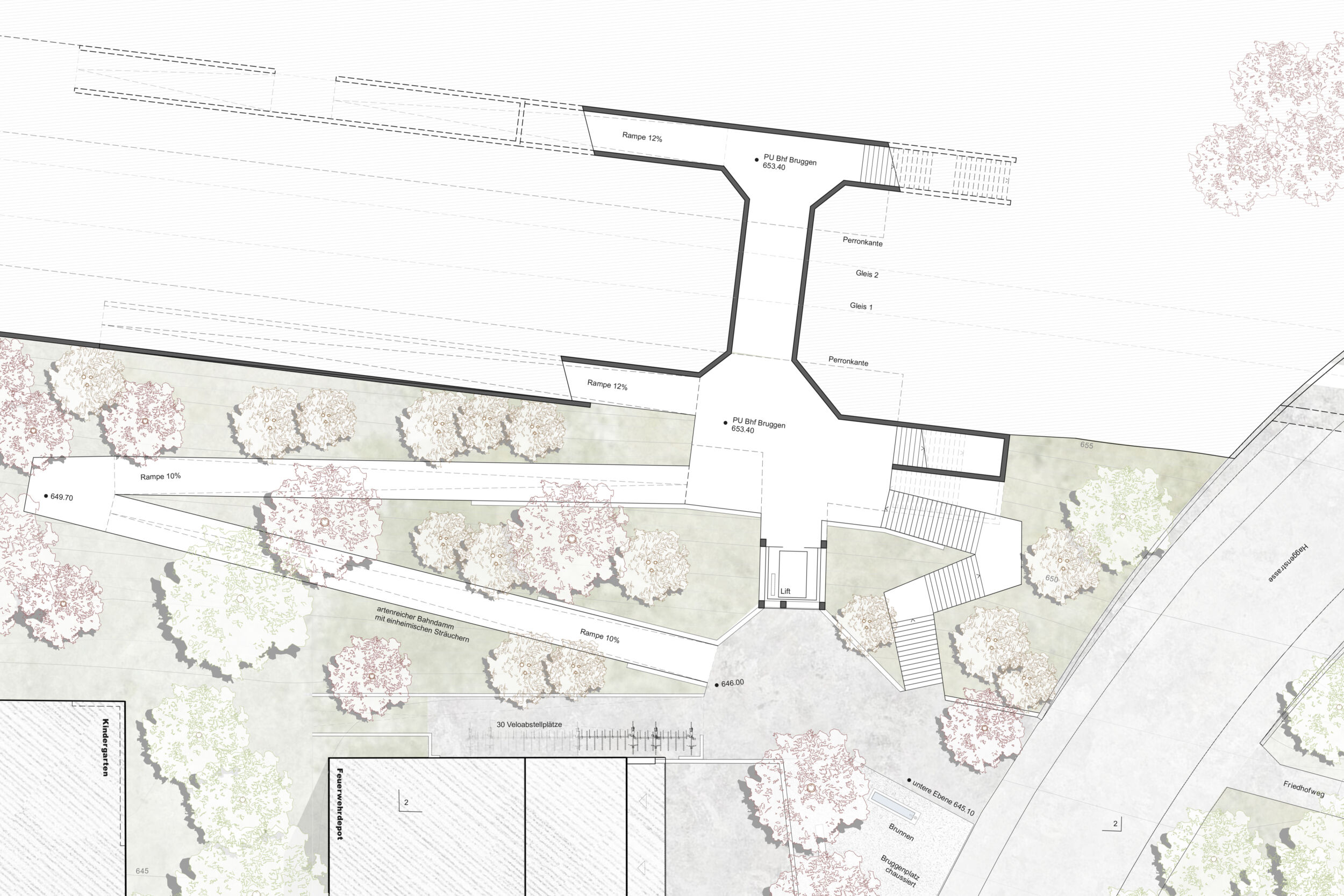 Der Zugang zur Bahn und zur Passerelle erfolgt entlang der gewachsenen Topografie und im öffentlichen Raum. Im Netz der parkartigen Wegrampen und Treppenanlagen entstehen in Kombination mit der SBB-Personenunterführung vielfältige, direkte und räumlich offene Fussverbindungen. An den beiden Brückenköpfen der Passarelle ist je ein Lift platziert. Die Treppenlängen sind kurz, abwechslungsreich und die Aufgänge zur Passerelle überdacht. Es gibt keine hermetischen und langfädigen Treppenhäuser mit ihren Sicherheits- und Hygieneproblemen. Die Durchwegung der Bahnanlagen erfolgt schrittweise, multioptional, geschmeidig und selbstverständlich.